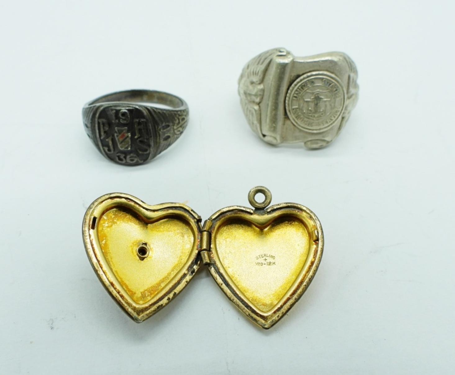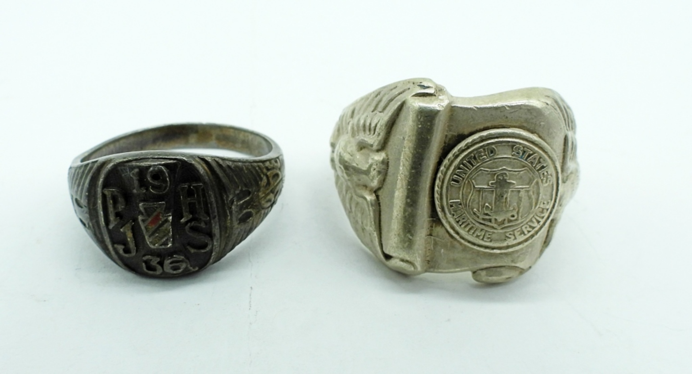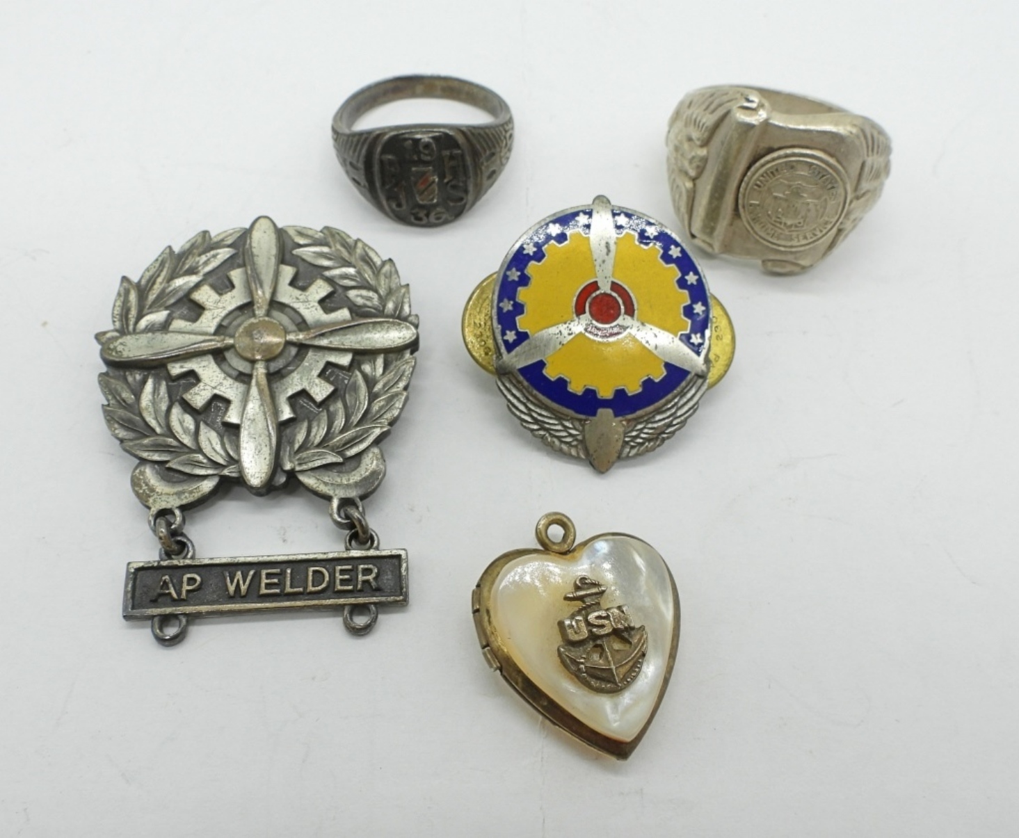 STERLING. TWO PINS. ONE MOTHER OF PEARL USN LOCKET. RING “UNITED STATES MARITIME SERVICE” RING SIZE 10.5. ANTIQUE CLASS RING 1936. 37 DWT