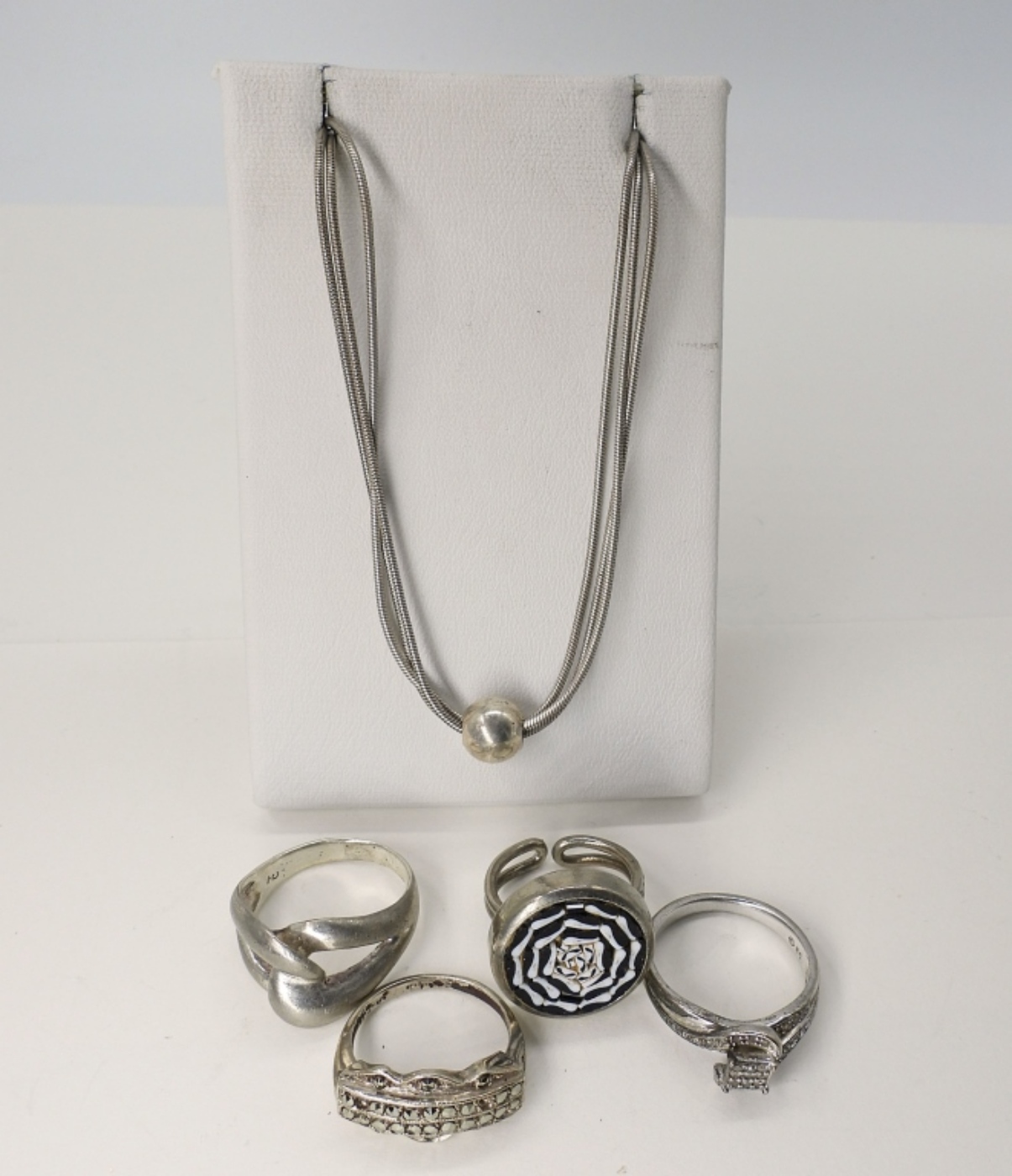 FOUR STERLING GEMSTONE RINGS, SIZES 5 & 7. 3 STRAND NECKLACE 16″. 18.2 DWT