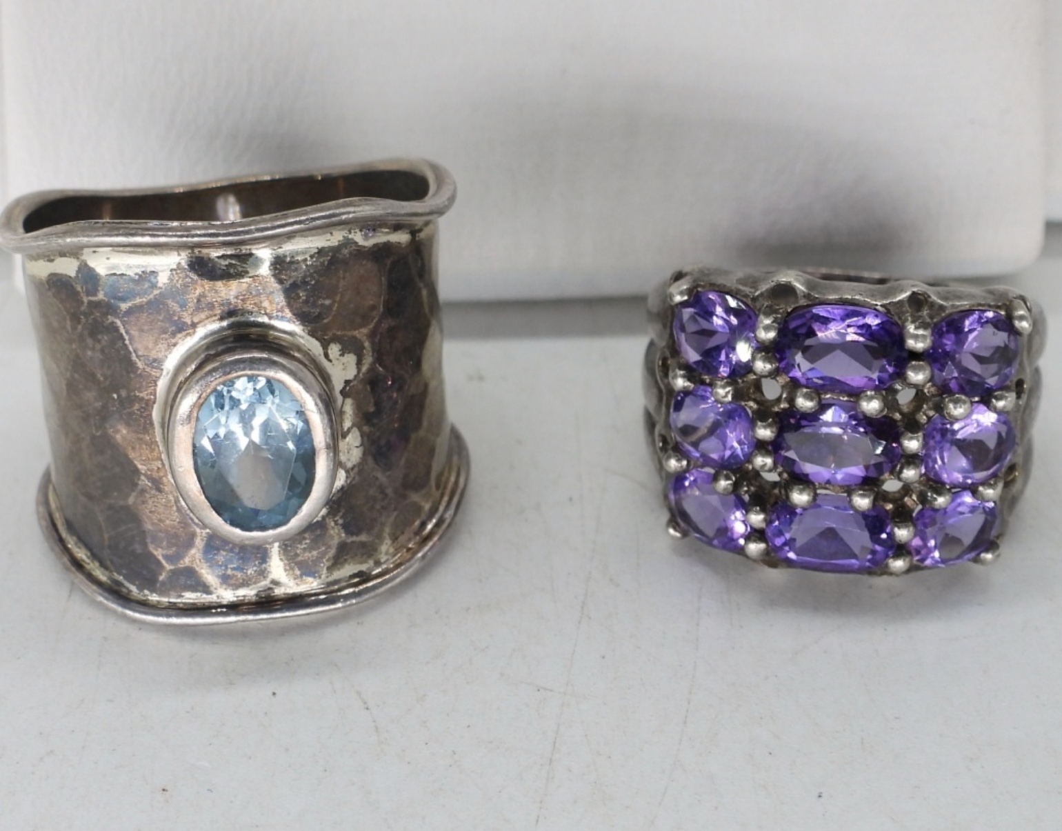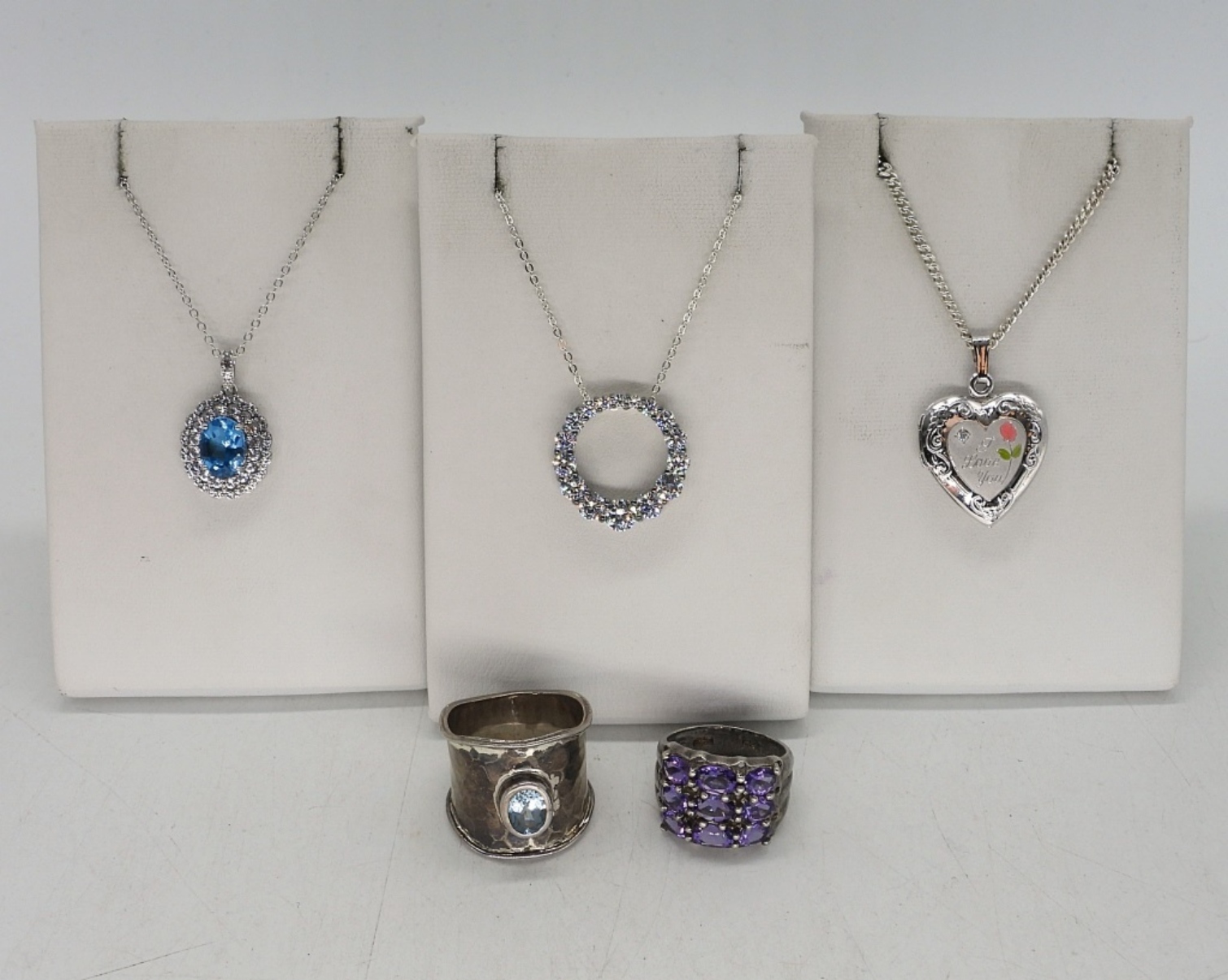 THREE STERLING GEMSTONE NECKLACES. CHAINS ARE 18-20″. TWO STERLING RINGS WITH GEMSTONES, SIZES 5.5 & 9. 19.6 DWT