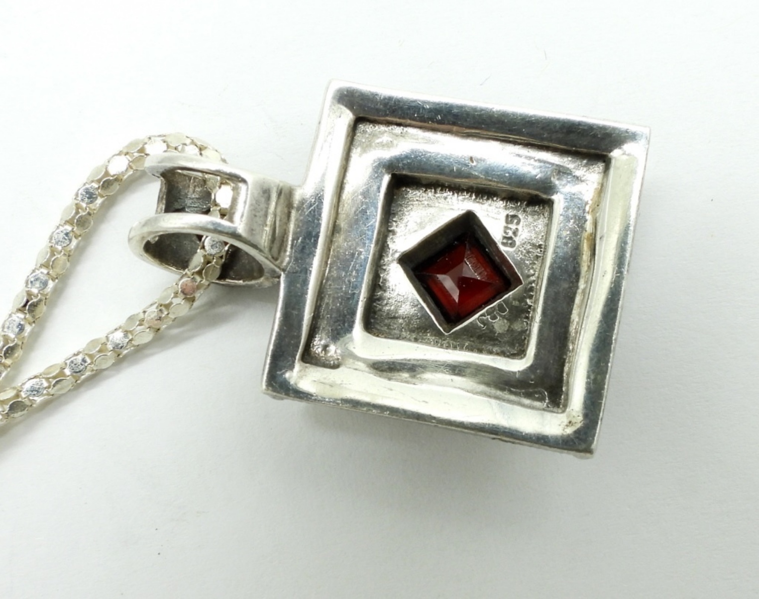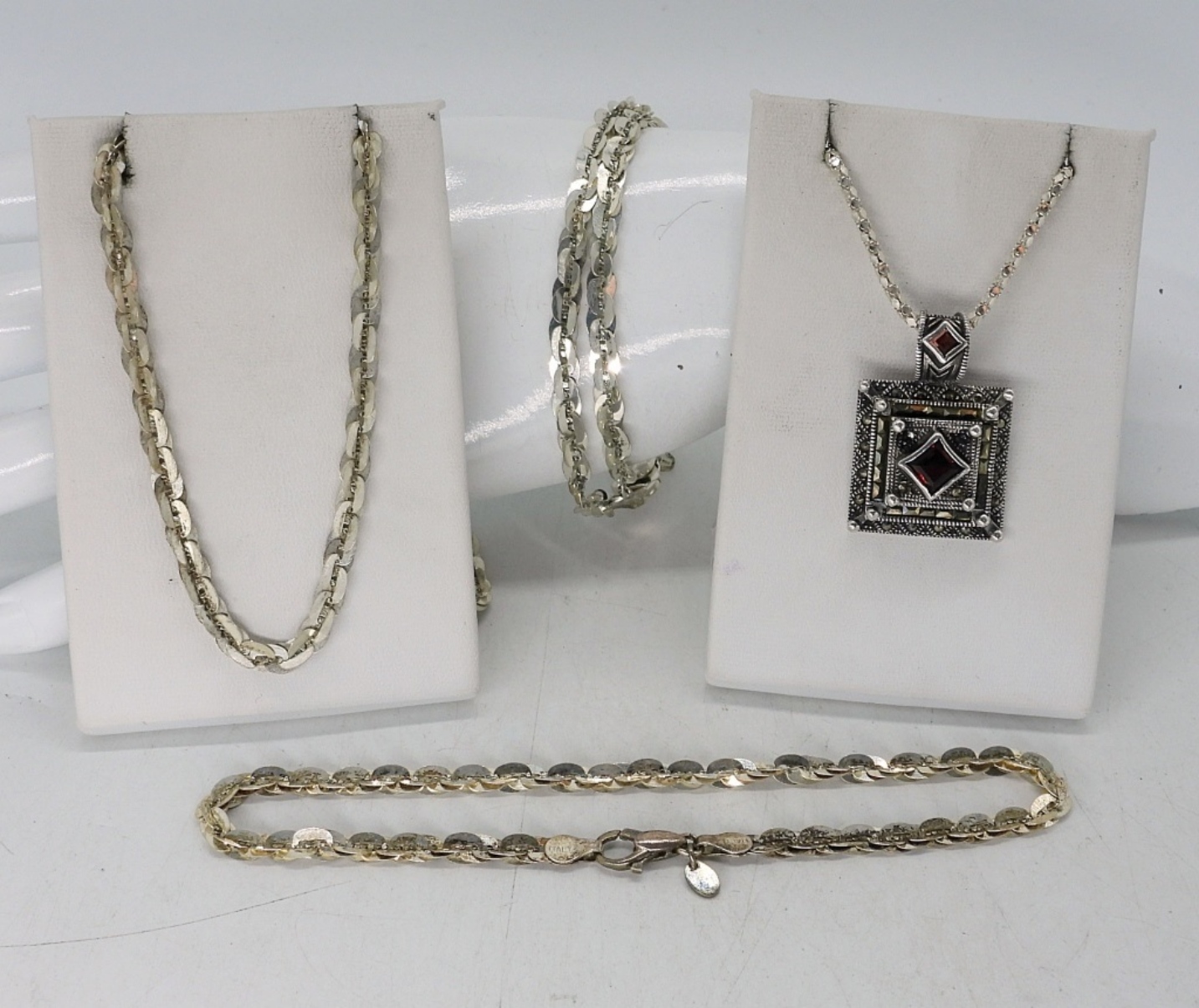 STERLING NECKLACE, BRACELET & ANKLET SET (18″, 10″ 7″). GARNET GEMSTONE PENDANT ON A 22″ CHAIN. 22.9 DWT