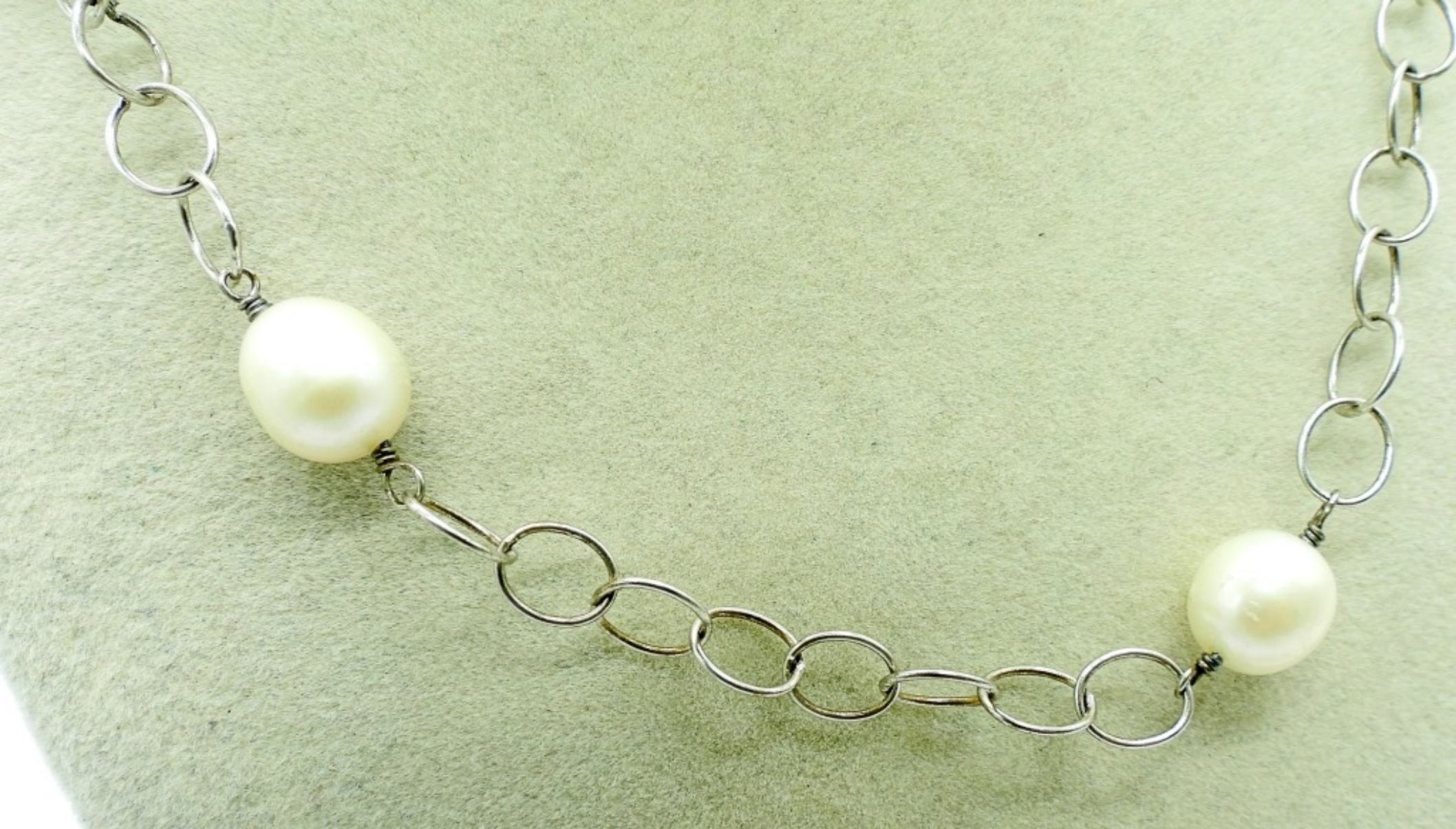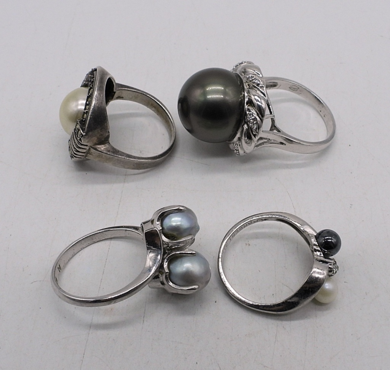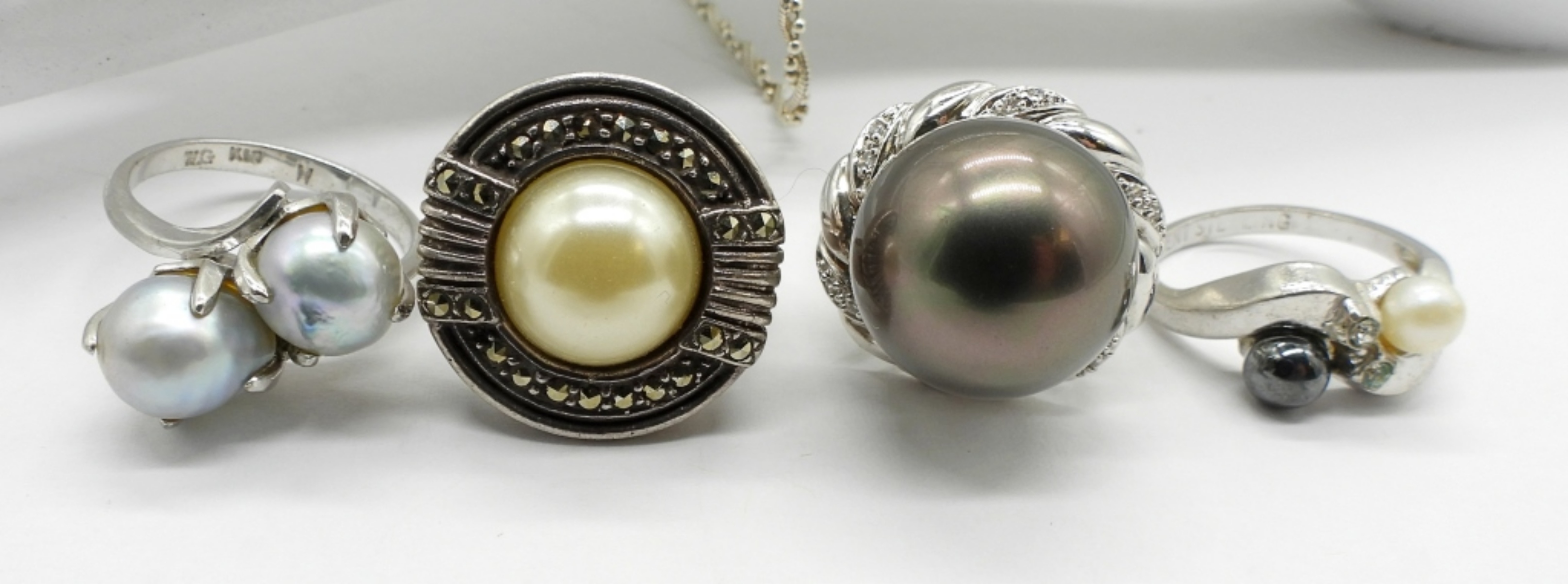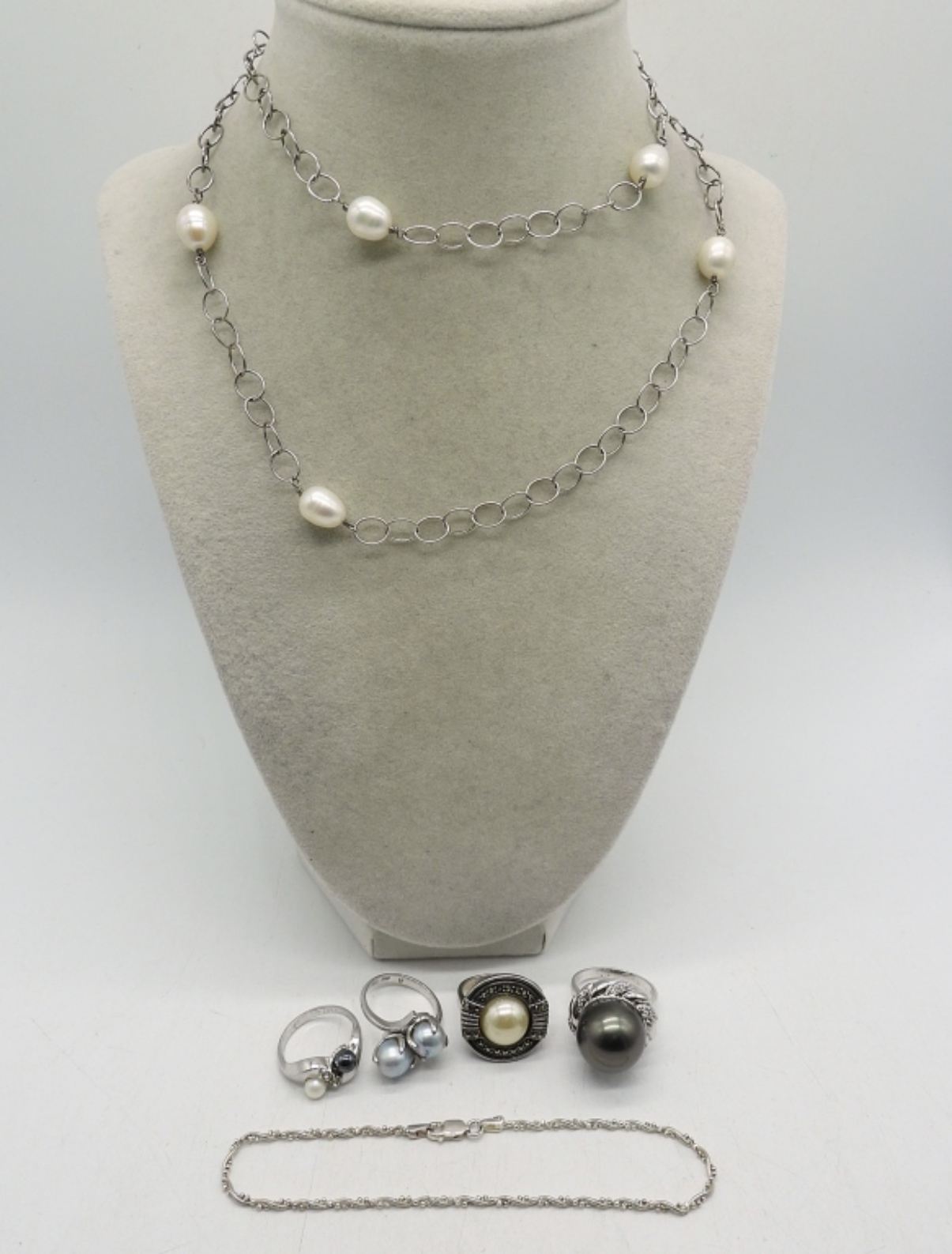28″ STERLING PEARL NECKLACE. 9″ STERLING BRACELET. FOUR STERLING PEARL RINGS, SIZES 7, 8, 9. 27.3 DWT