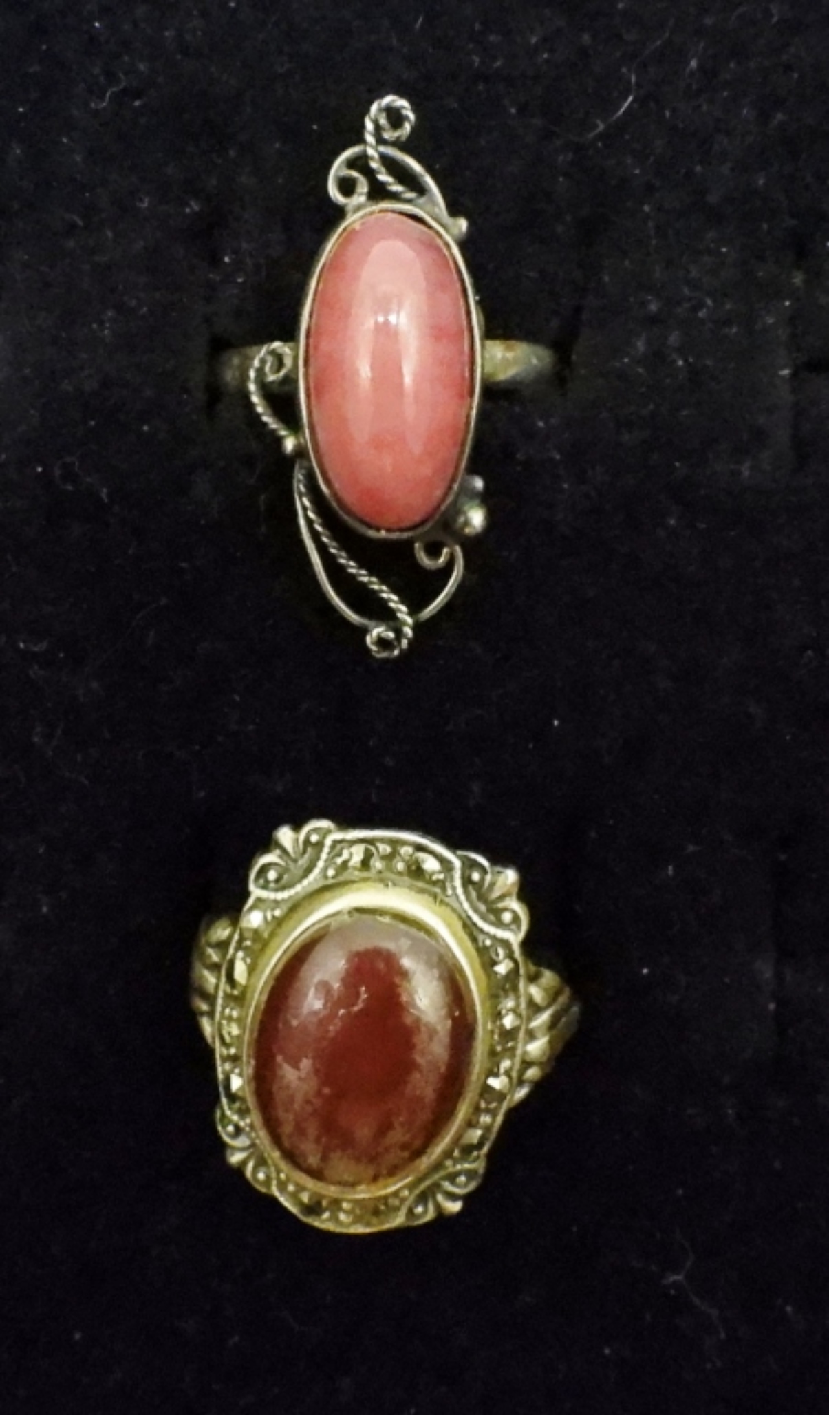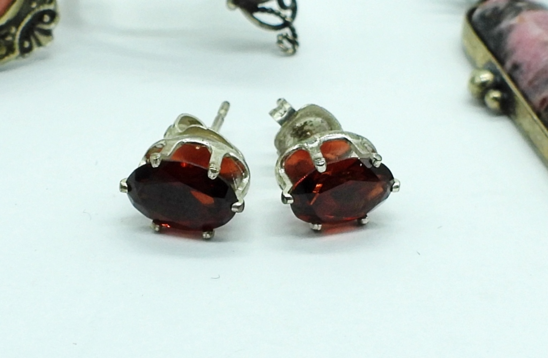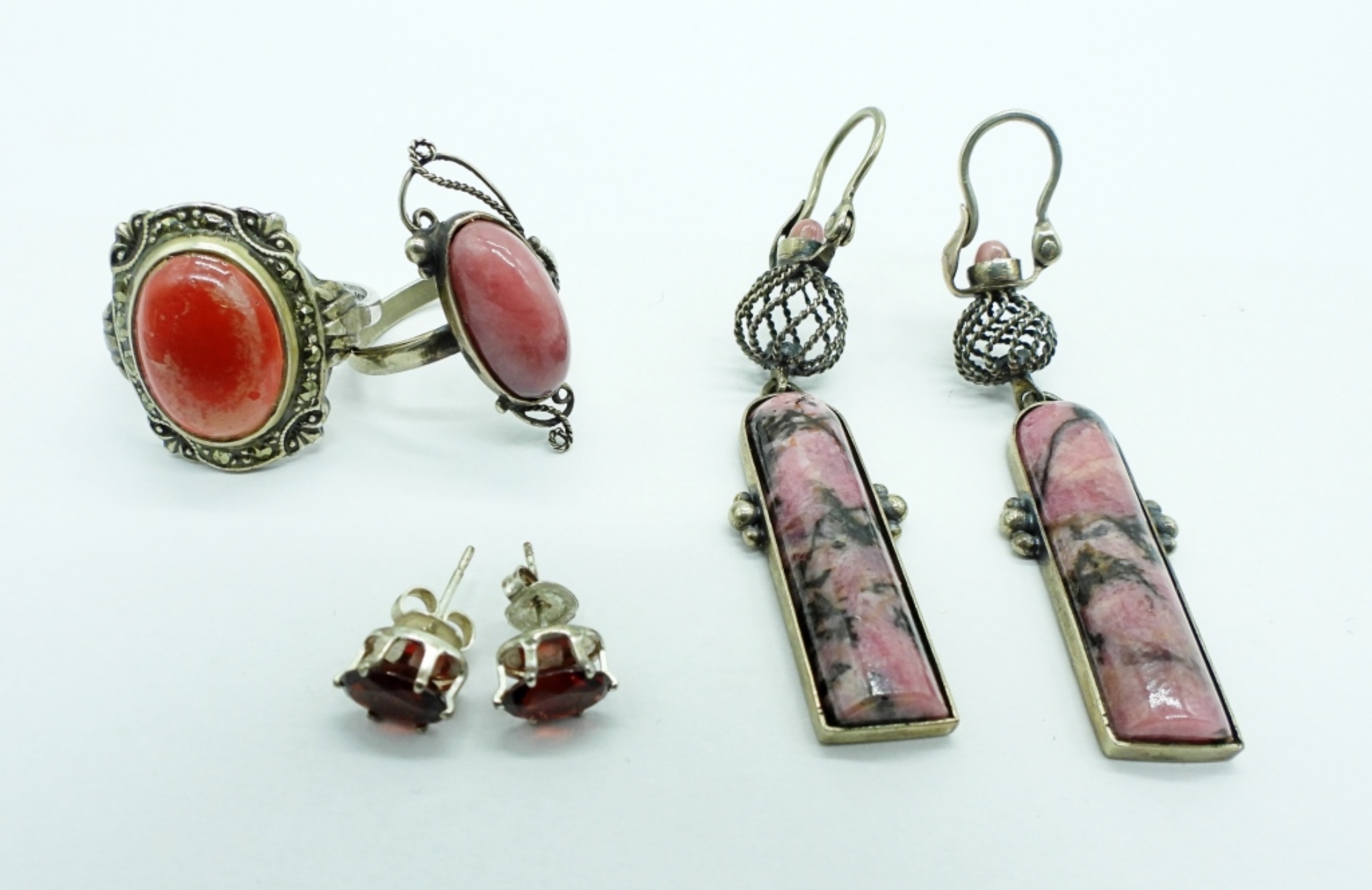 STERLING PINK RHODONITE GEMSTONE PIERCED EARRINGS AND RING SIZE 7. GARNET COLORED STUD EARRINGS AND A VINTAGE STERLING MARCASITE RING WITH A REDDISH GEMSTONE THAT HAS SEEN BETTER DAYS, SIZE 8. 11.6 DWT