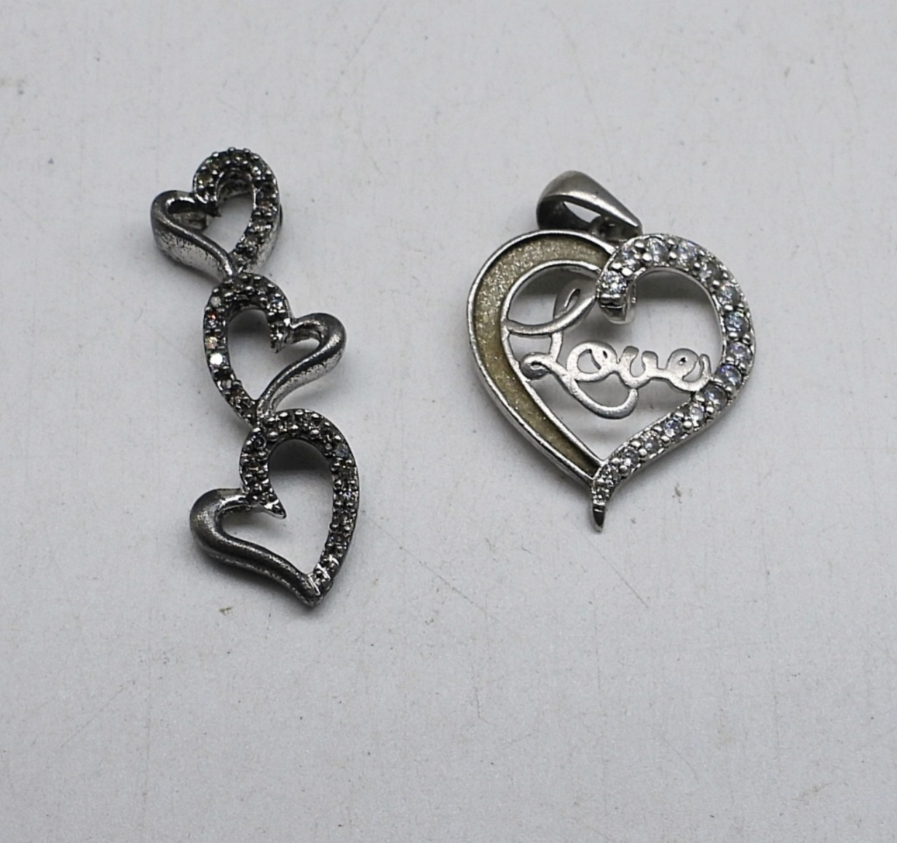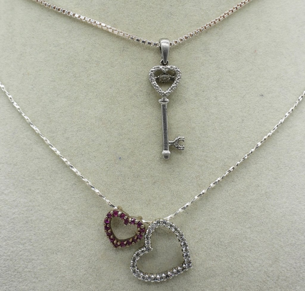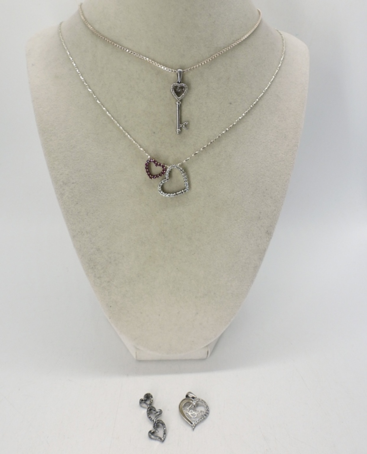 FIVE STERLING, GEMSTONE HEART PENDANTS. TWO STERLING CHAINS, 18″ & 30″. 9.7 DWT