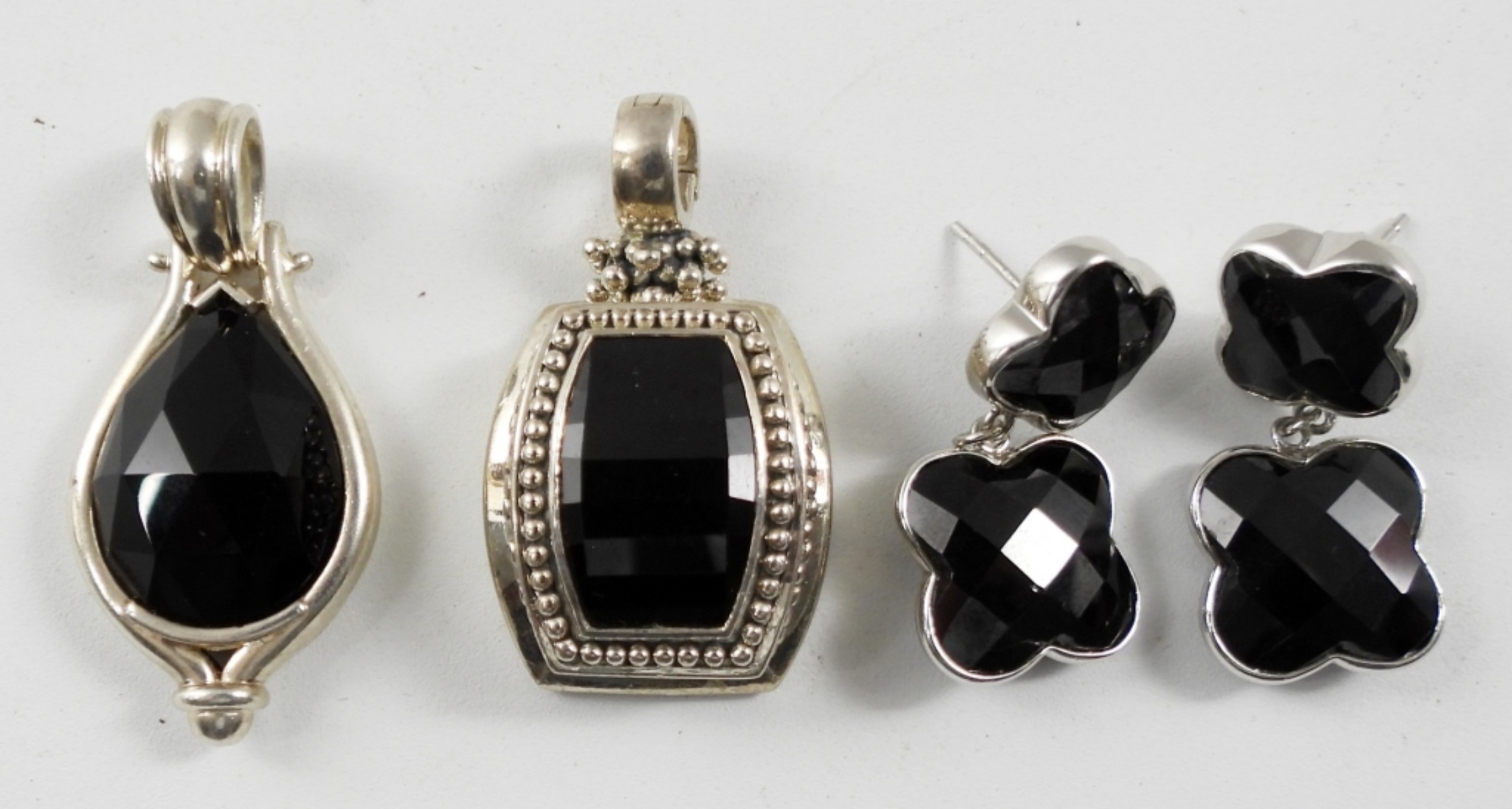 (2) PENDANTS MICHAEL DAWKINS & JV CHINA, (2) PIERCED EARRINGS (1) 30″ CHAIN (30 DWT)