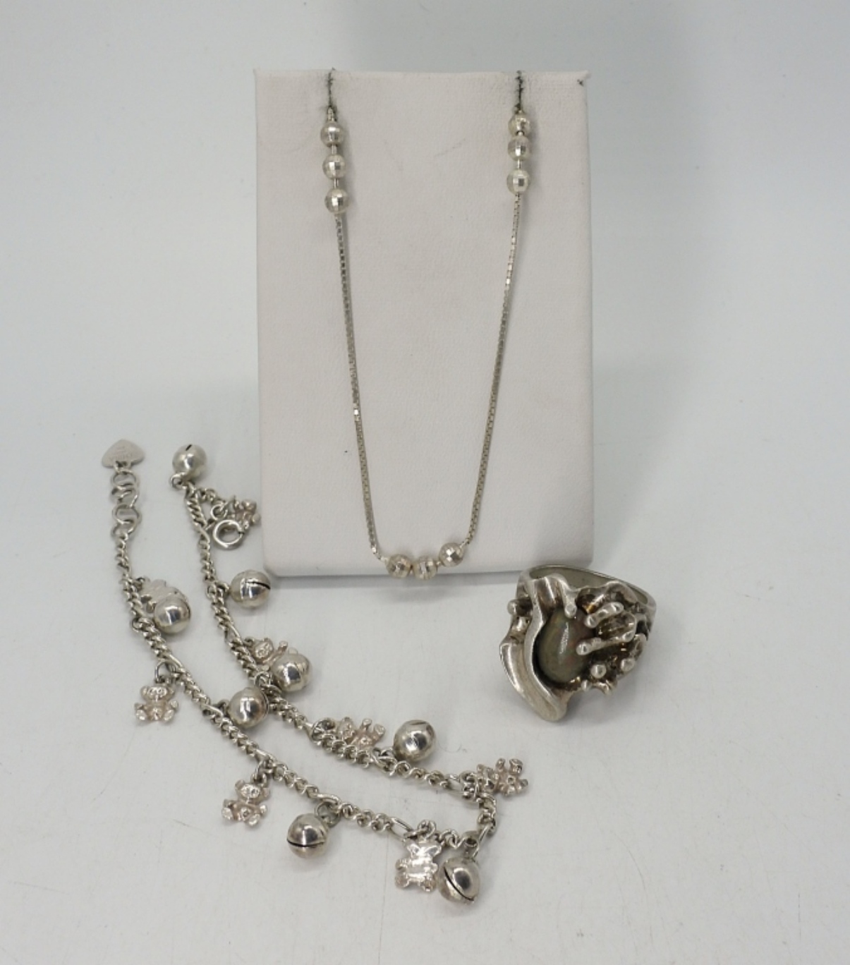 VINTAGE MEXICO 925 RING, SIZE 9. 10″ ANKLET WITH BELLS & TEDDY BEARS. 18″ STERLING NECKLACE. 25.4 DWT