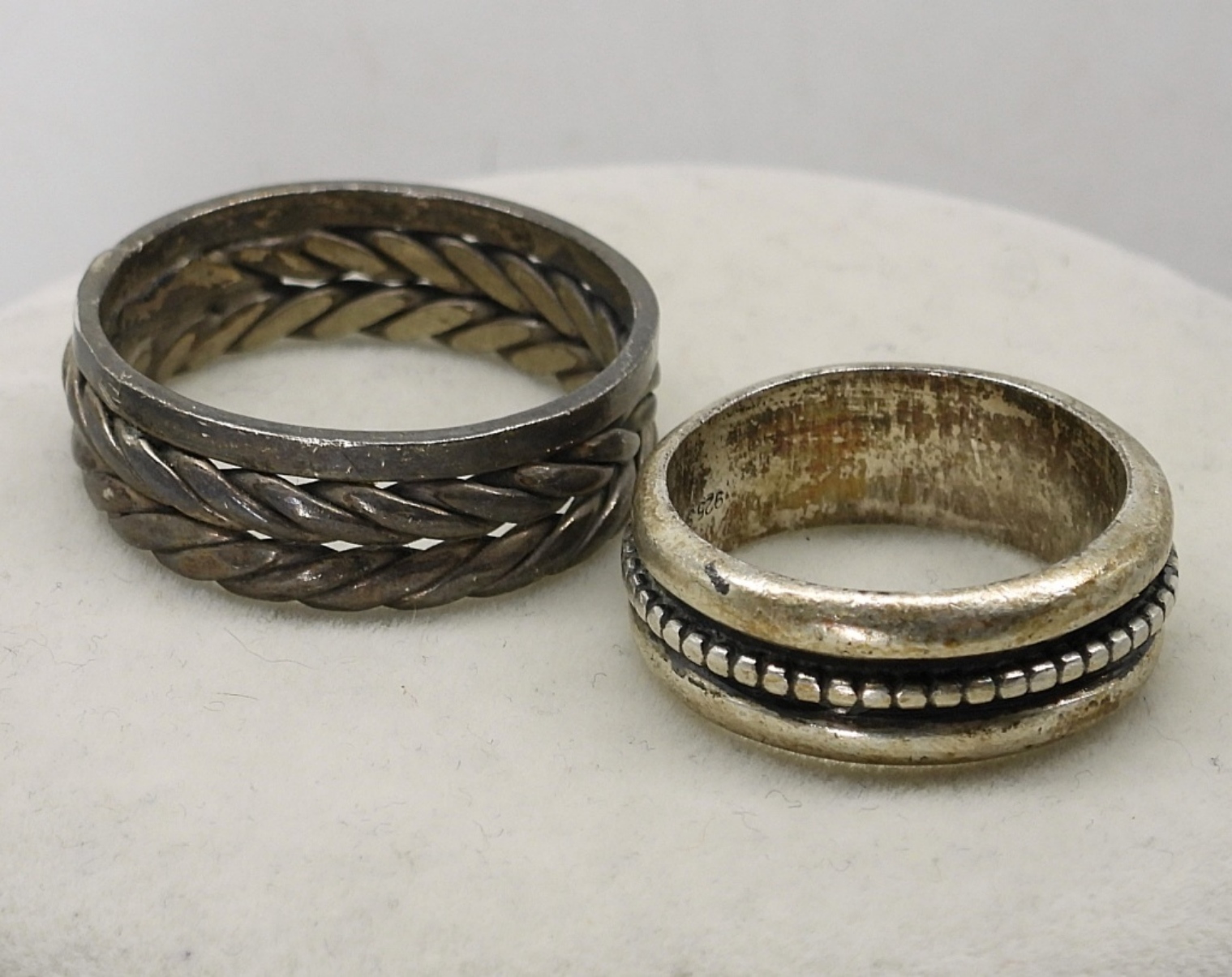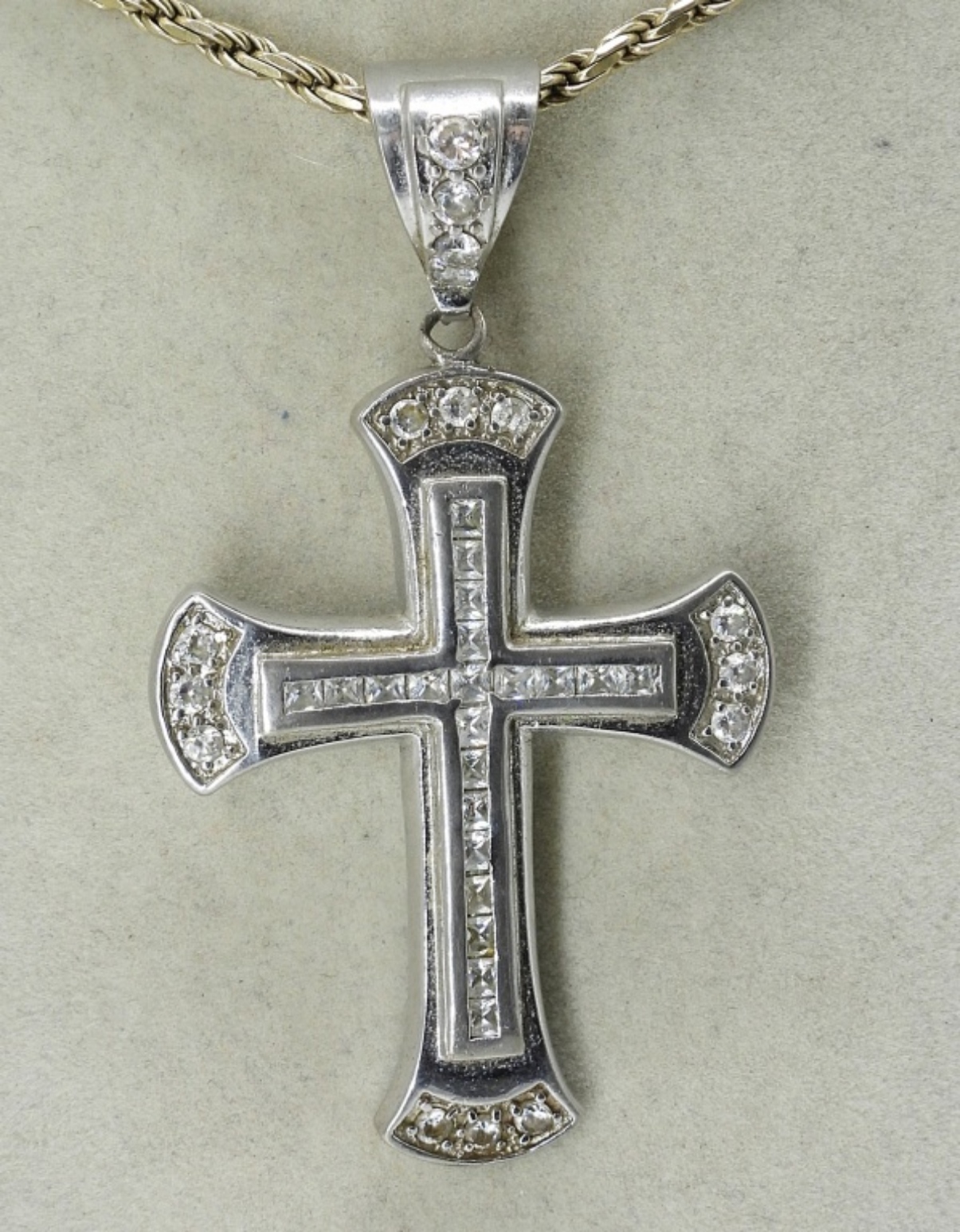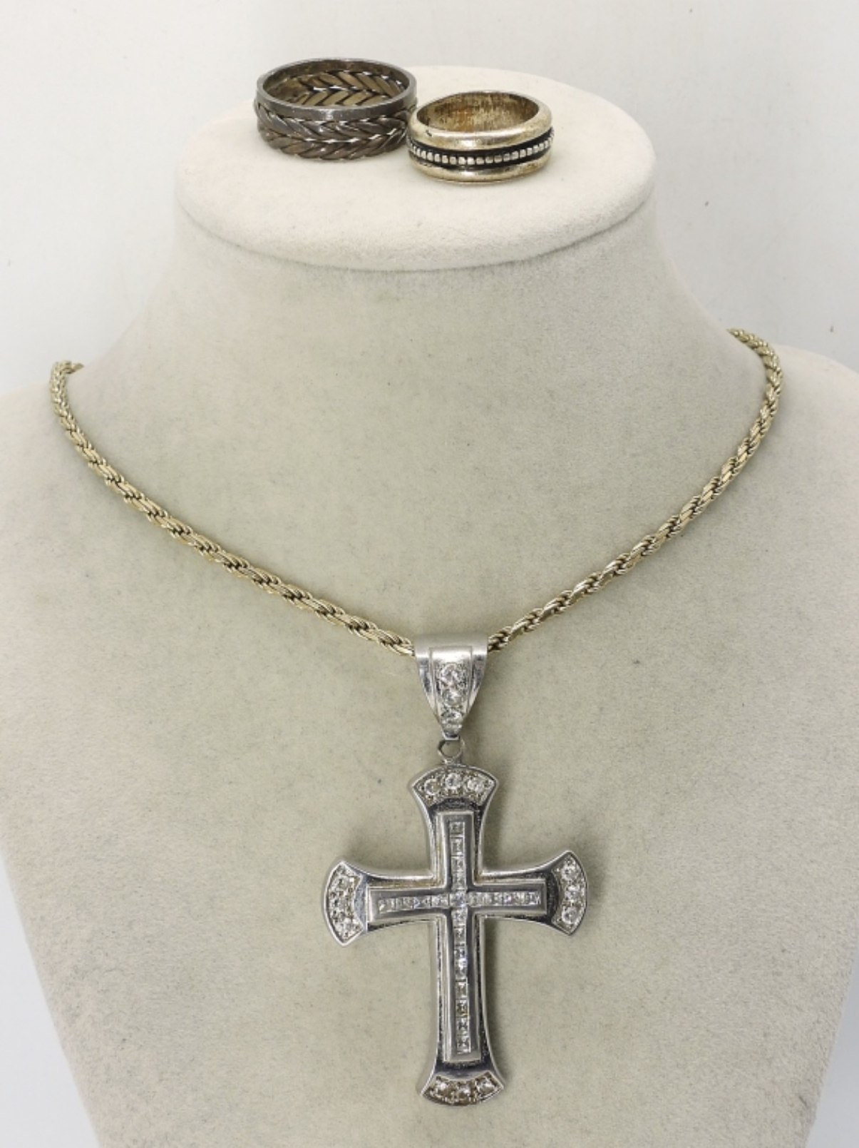LARGE STERLING CROSS PENDANT 3″. STERLING CHAIN 24″. TWO STERLING RINGS, SIZE 8 & 13. 36.3 DWT