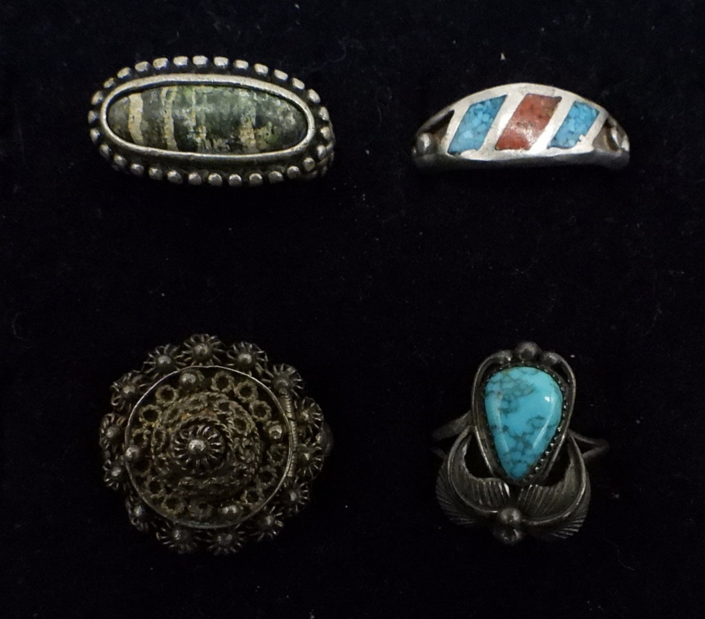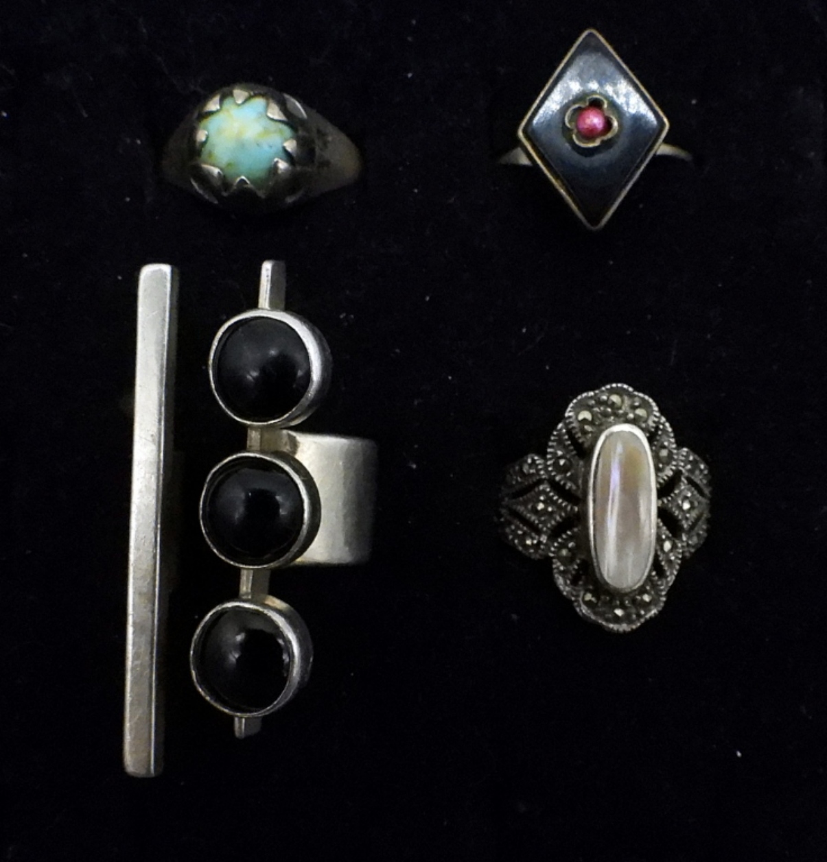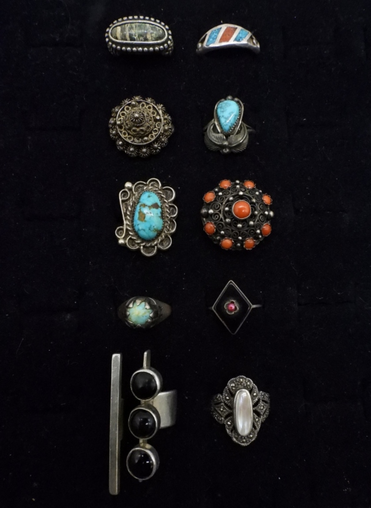 10 VINTAGE STERLING RINGS, SEVERAL IN THE SOUTHWEST FASHION. CORAL, TURQUOISE, ONYX & MORE. SIZES 6-9. 32.3 DWT