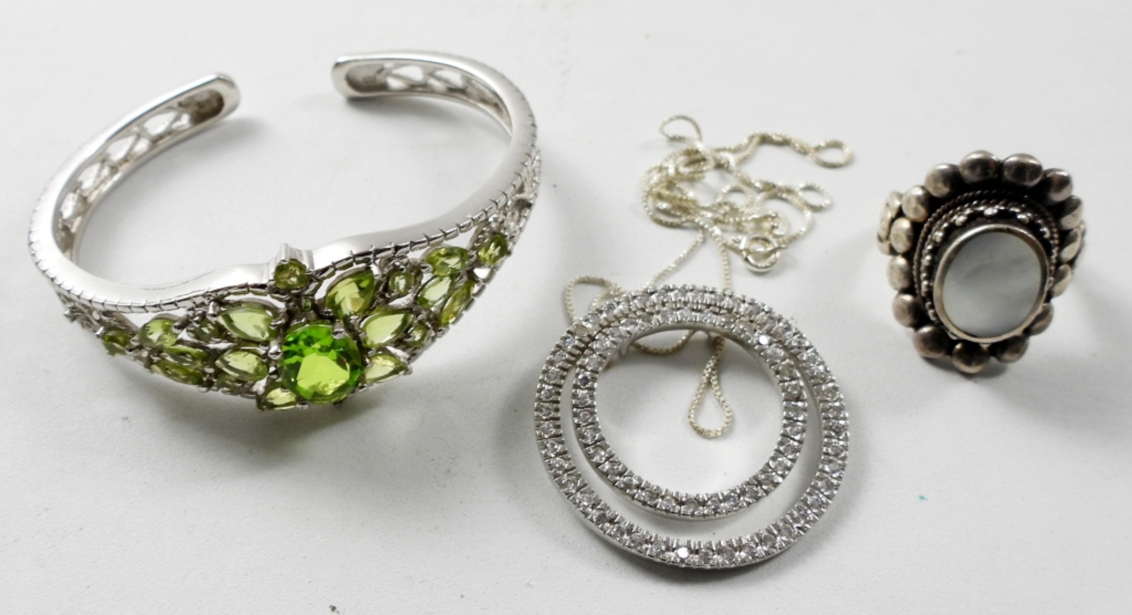LADIES 18″ STERLING NECKLACE, SIZE 8.5 RING AND A 5″ CUFF BRACELET WITH GREEN GEMSTONES (26.2 DWT)