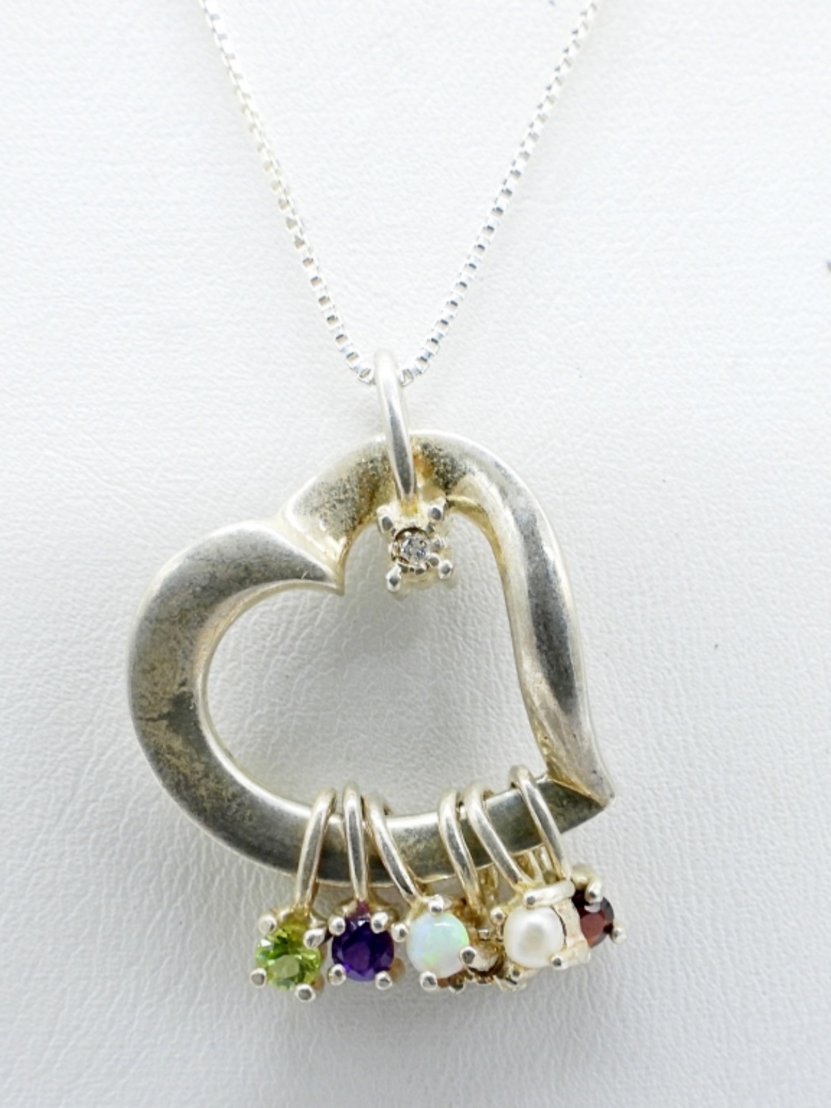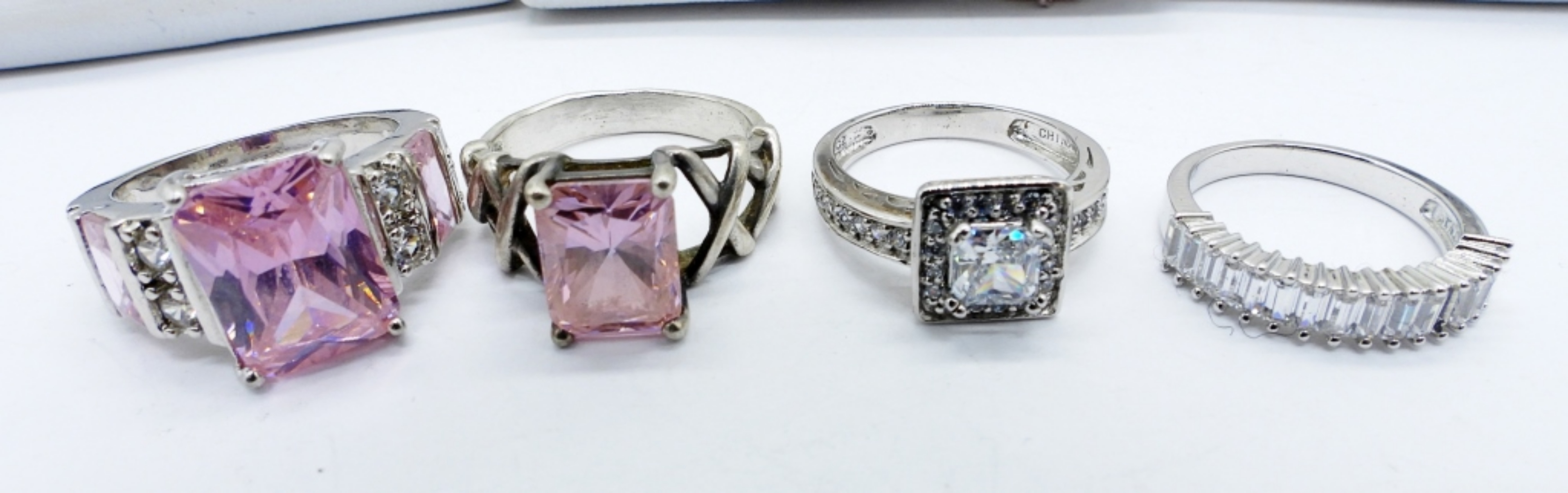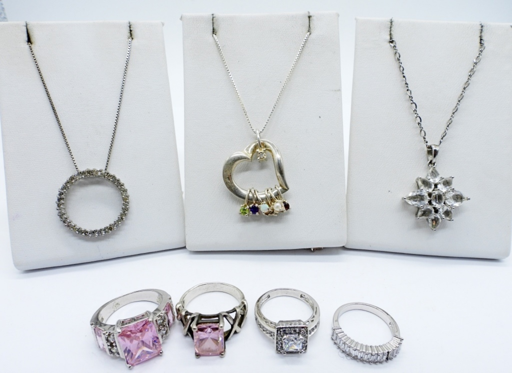 FOUR RINGS, STERLING, WITH PINK & WHITE GEMSTONES. RING SIZES 5 & 7. BAND MISSING ONE STONE. NECKLACES ARE 16″ & 18″. 23 DWT