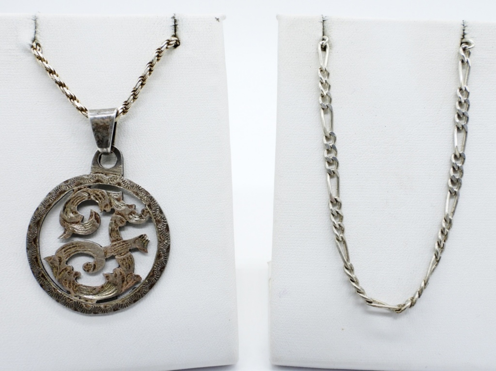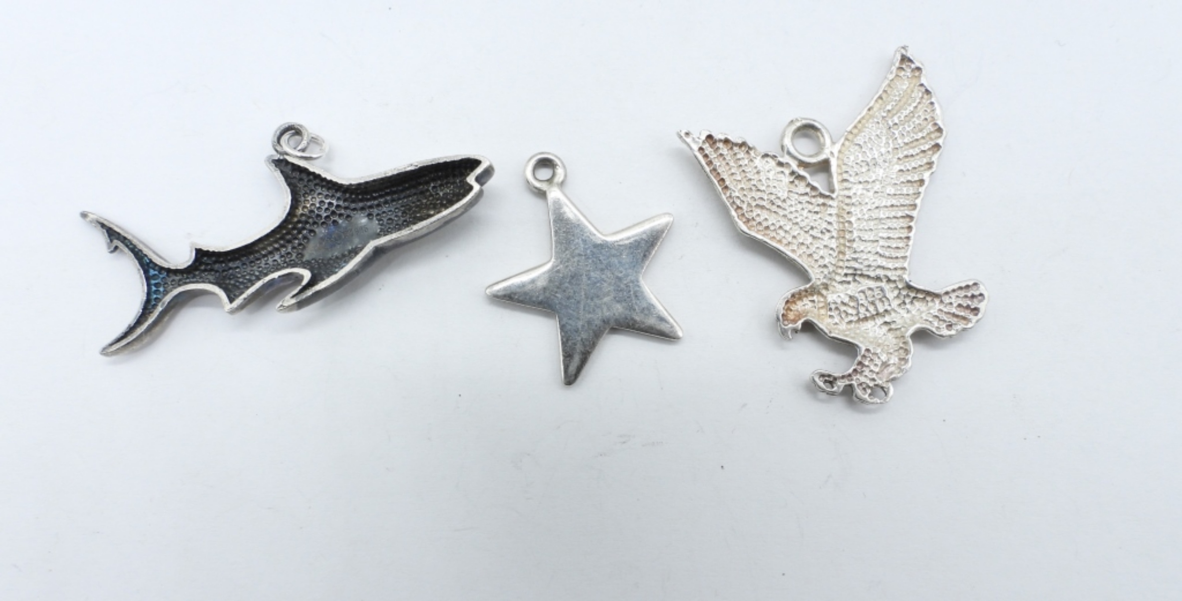 FOUR STERLING CHARMS, 1-2″. TWO STERLING CHAINS, 18″ & 20″. 24.5 DWT
