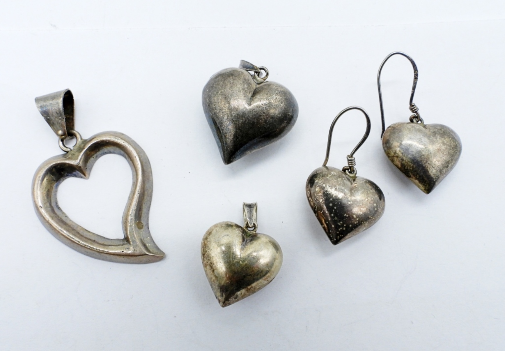 3 STERLING PUFFY HEART PENDANTS, 3 SIZES. ONE PAIR OF MATCHING PIERCED EARRINGS AND AN OPEN HEART STERLING PENDANT. 30″ STERLING CHAIN. TARNISHED, WILL CLEAN UP NICELY! 20.8 DWT