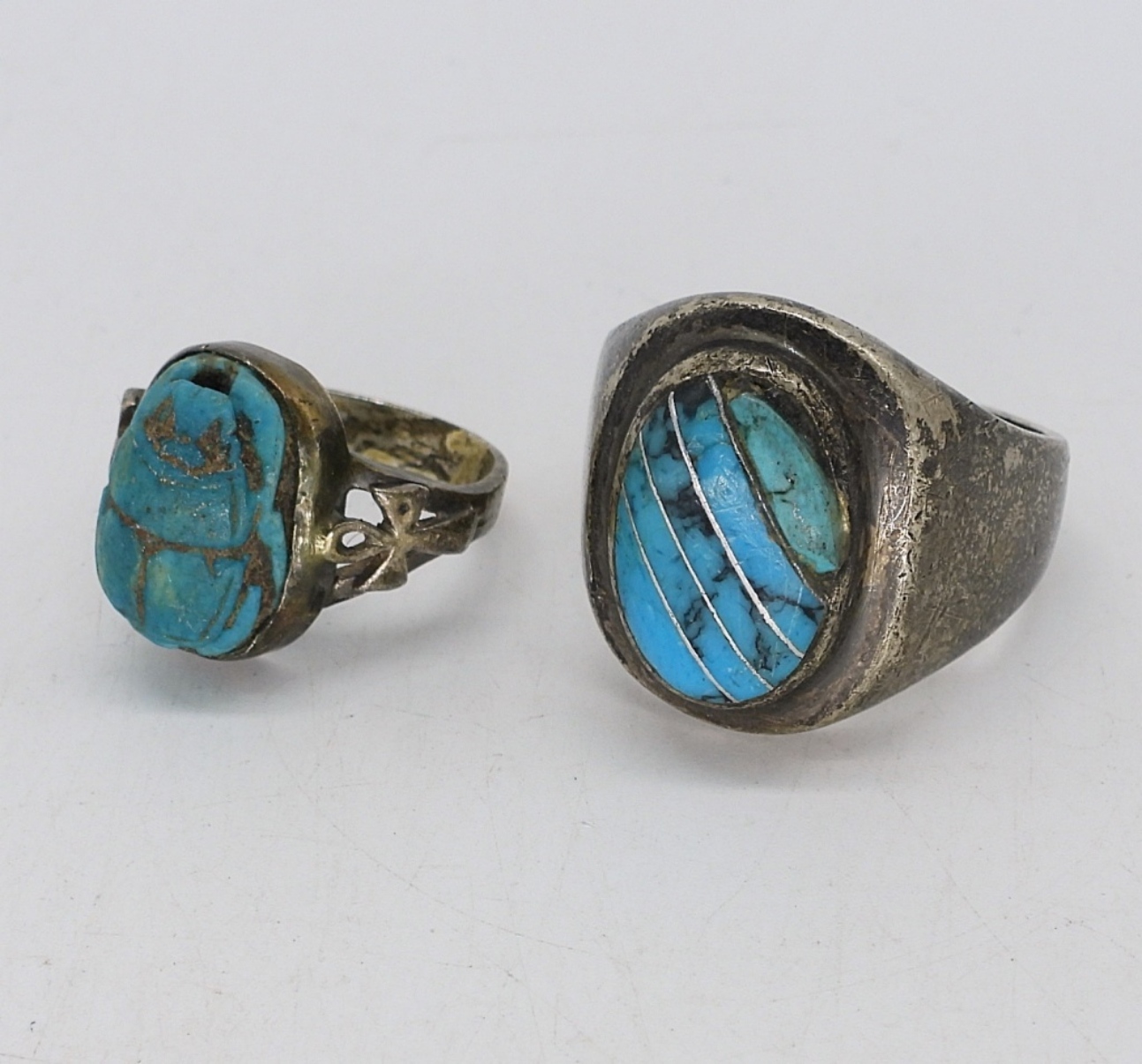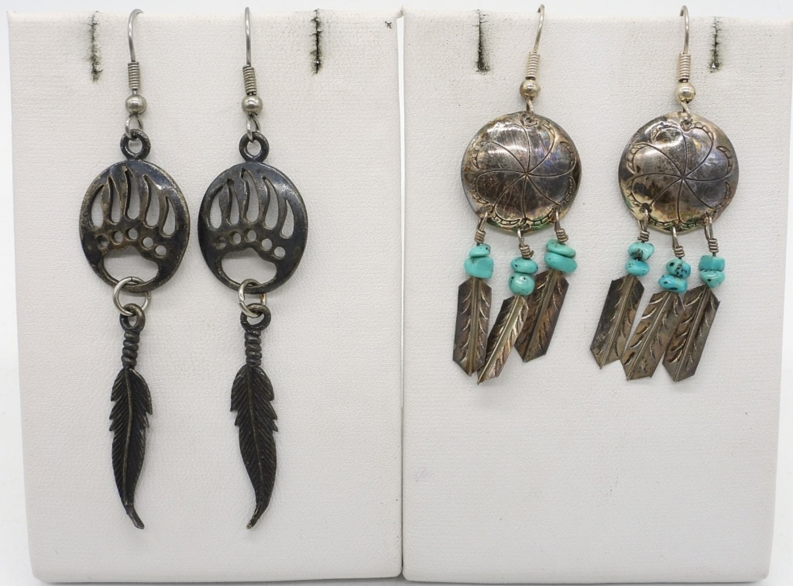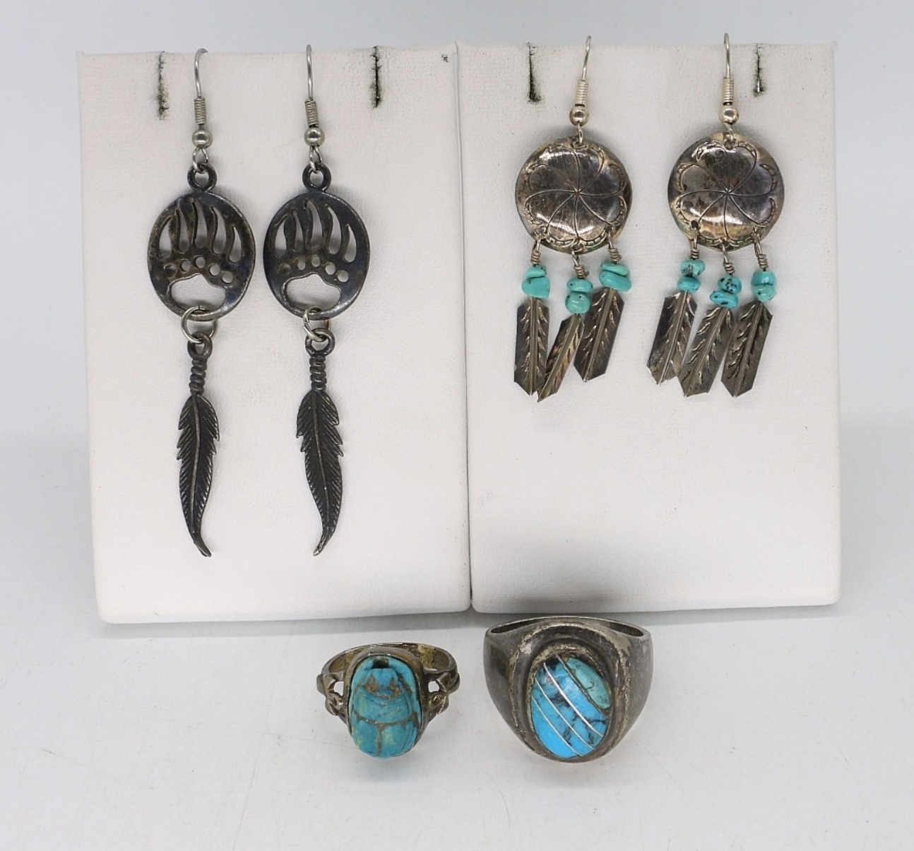 TWO PAIR OF STERLING PIERCED EARRINGS. TWO STERLING RINGS, SIZES 6 & 13. 22.7 DWT