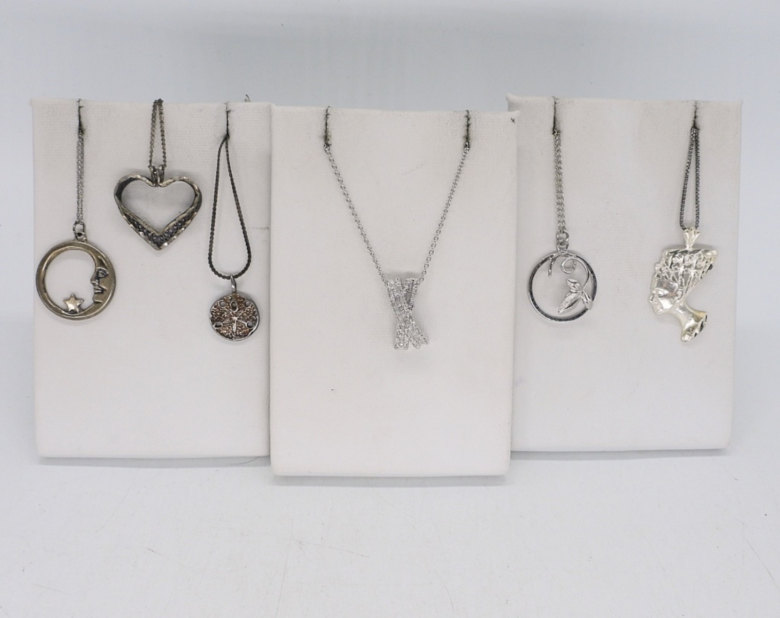 ONE STERLING DIAMOND PENDANT ON A 18″ CHAIN. FIVE STERLING NECKLACES, 16-20″ CHAINS. 10.5 DWT