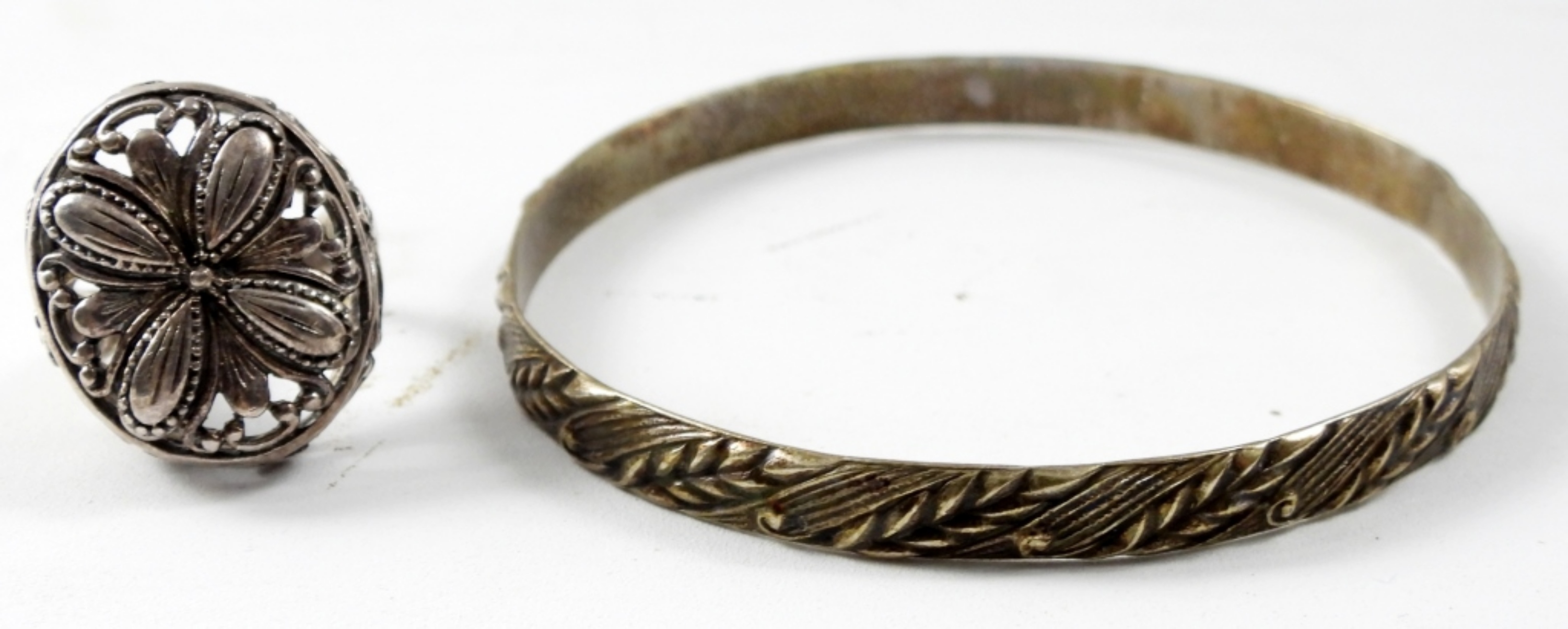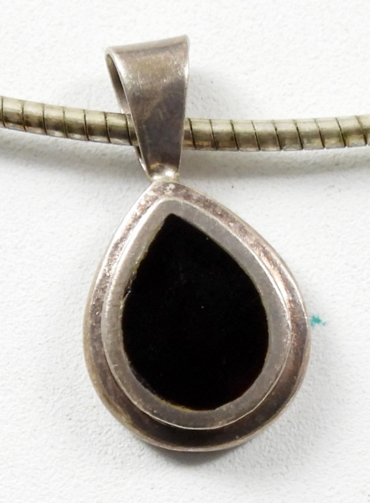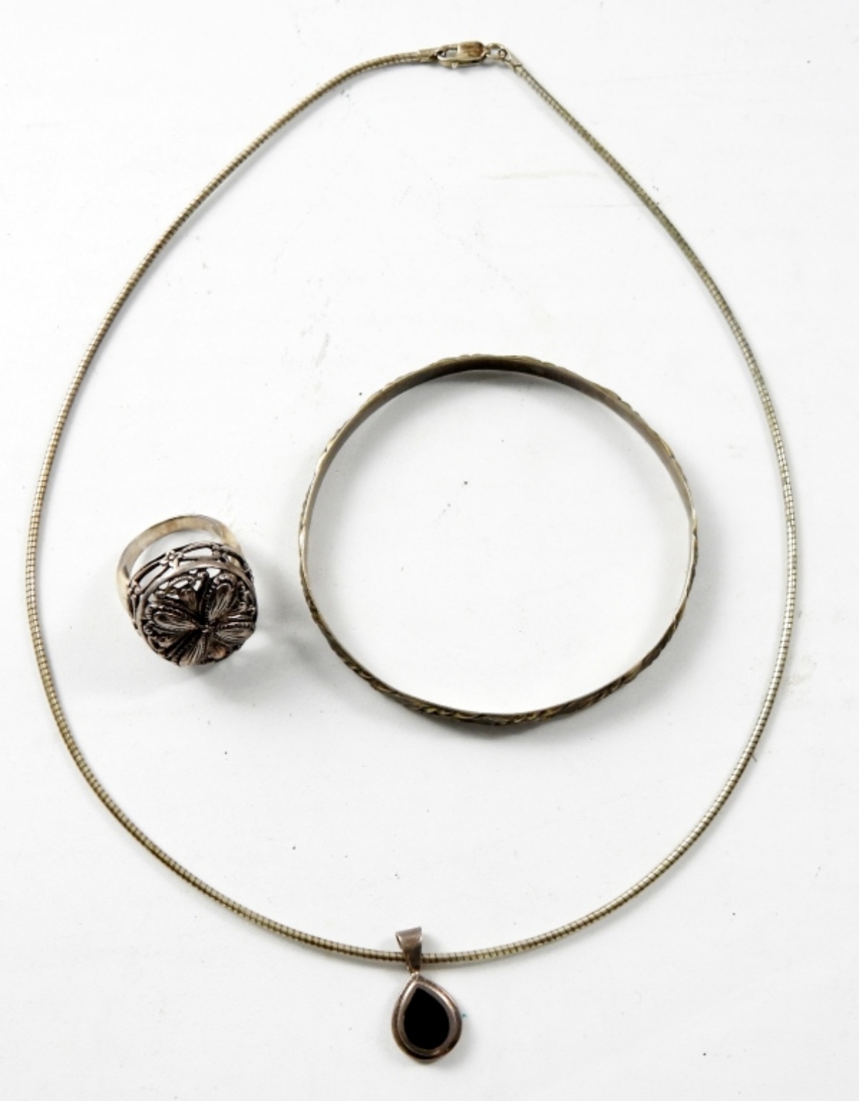 3 PIECE LADIES STERLING JEWELRY SET,16″ NECKLACE WITH A BLACK PENDANT A SIZE 7 RING AND A BANGLE BRACELET (20.3 DWT)
