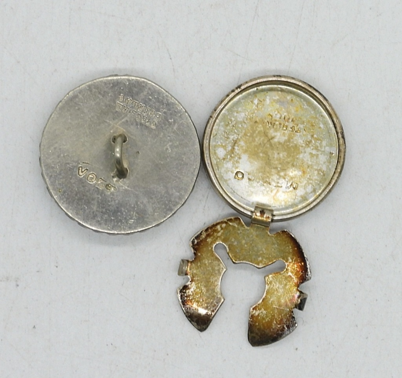 TWO STERLING OVERLAY BUTTONS, FOUR “MEXICO ” BUTTON COVERS. 10.6 DWT