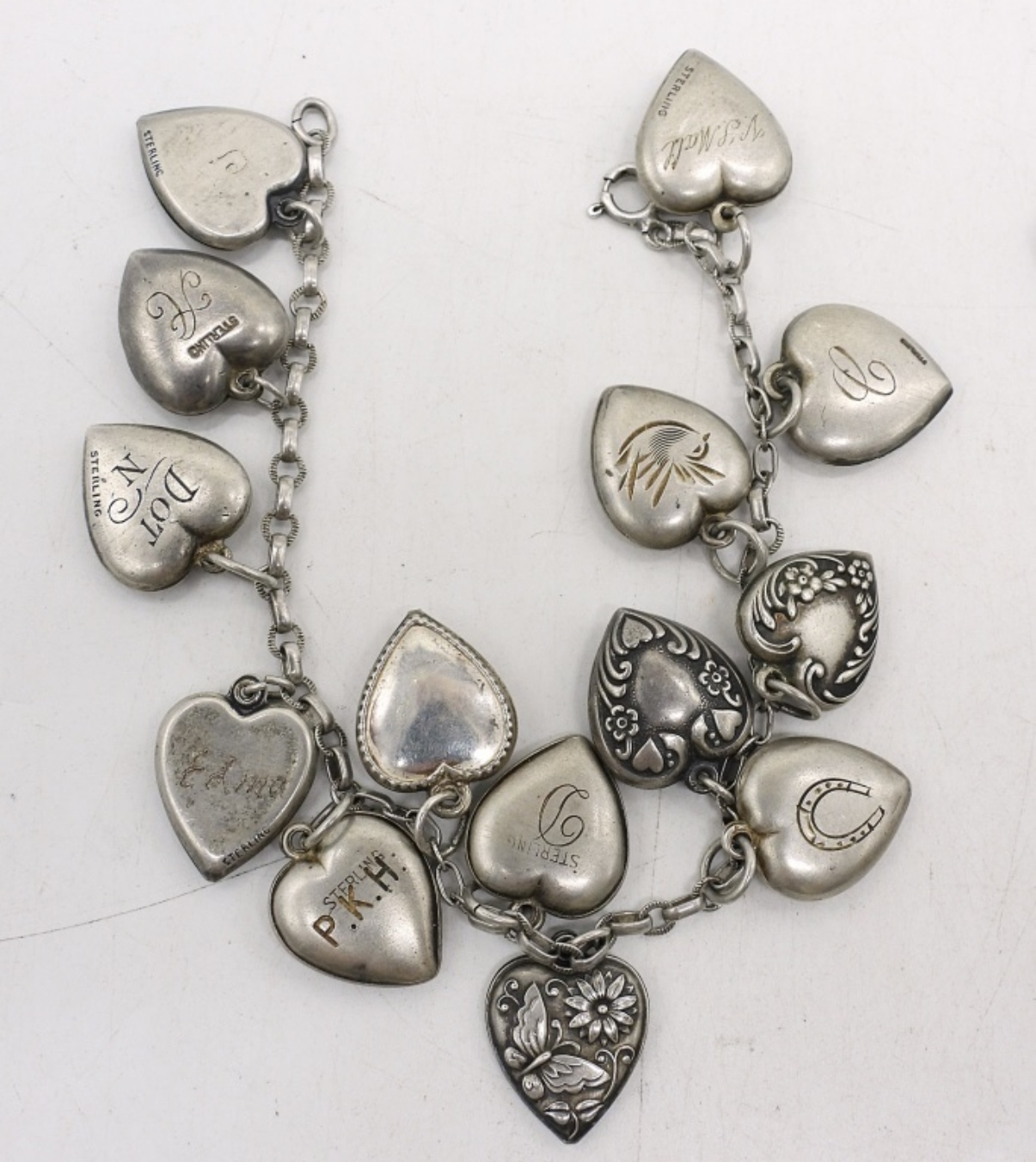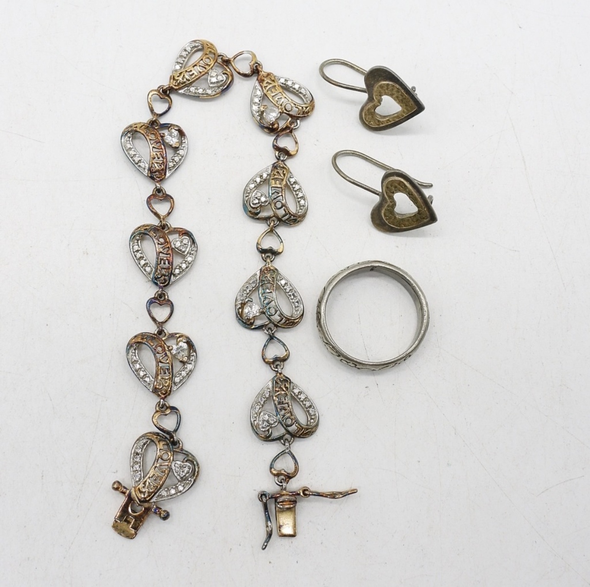 TWO HEART CHARM BRACELETS, 7-8″. PIERCED HEART EARRINGS. RING SIZE 6.5. 22.3 DWT