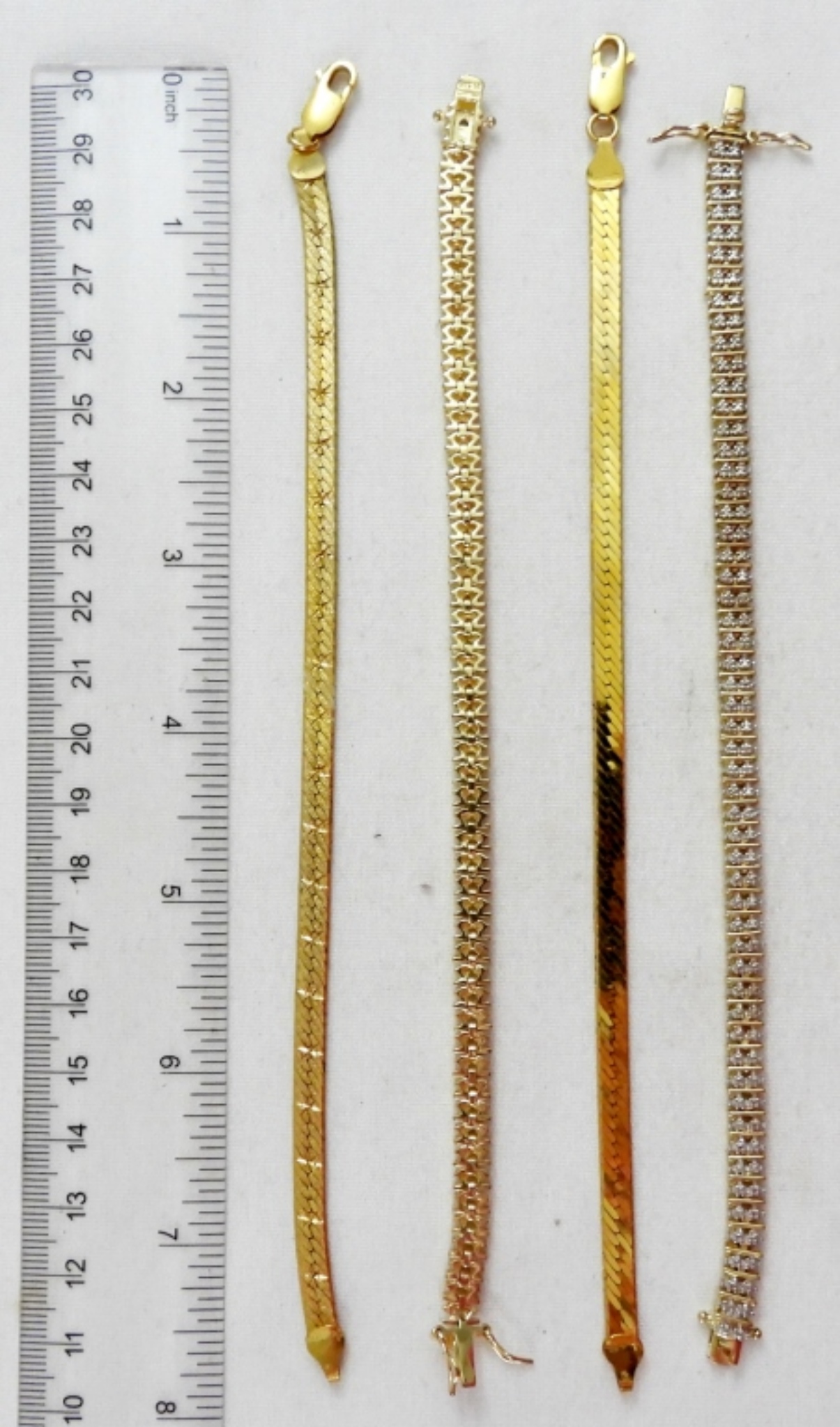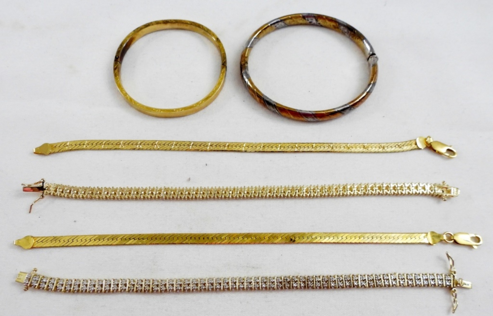 SIX STERLING GOLD TONE BRACELETS. 7-9″. 39.7 DWT