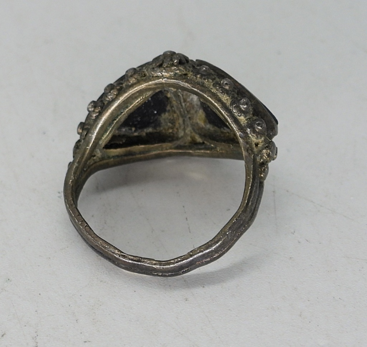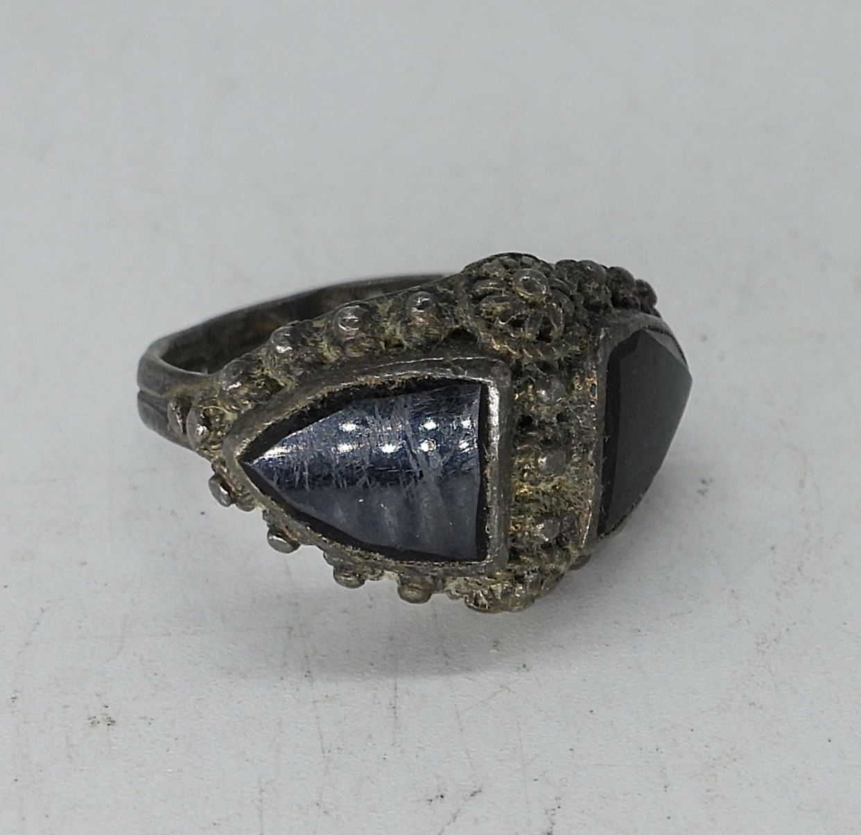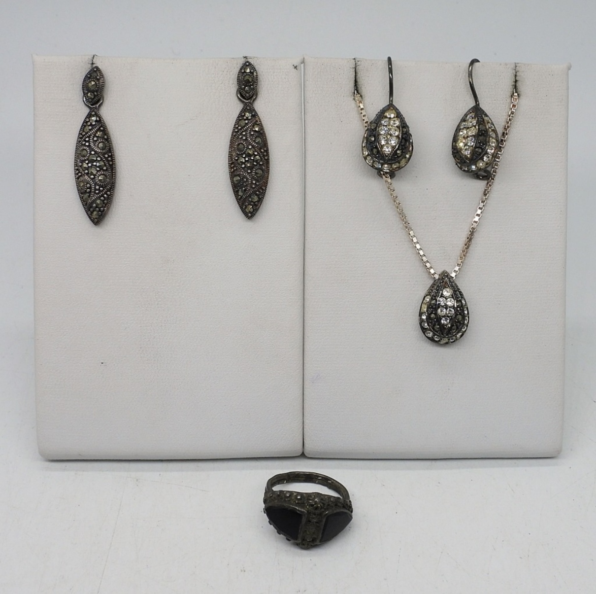 STERLING MARCASITE, ONYX GEMSTONE NECKLACE (18″), 2 PAIR OF PIERCED EARRINGS, RING SIZE 4. 13.1 DWT