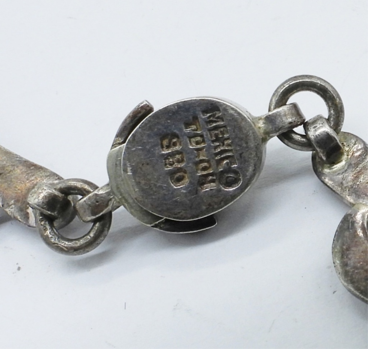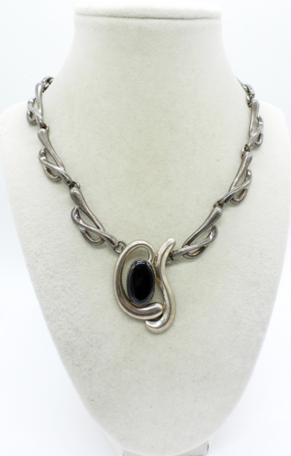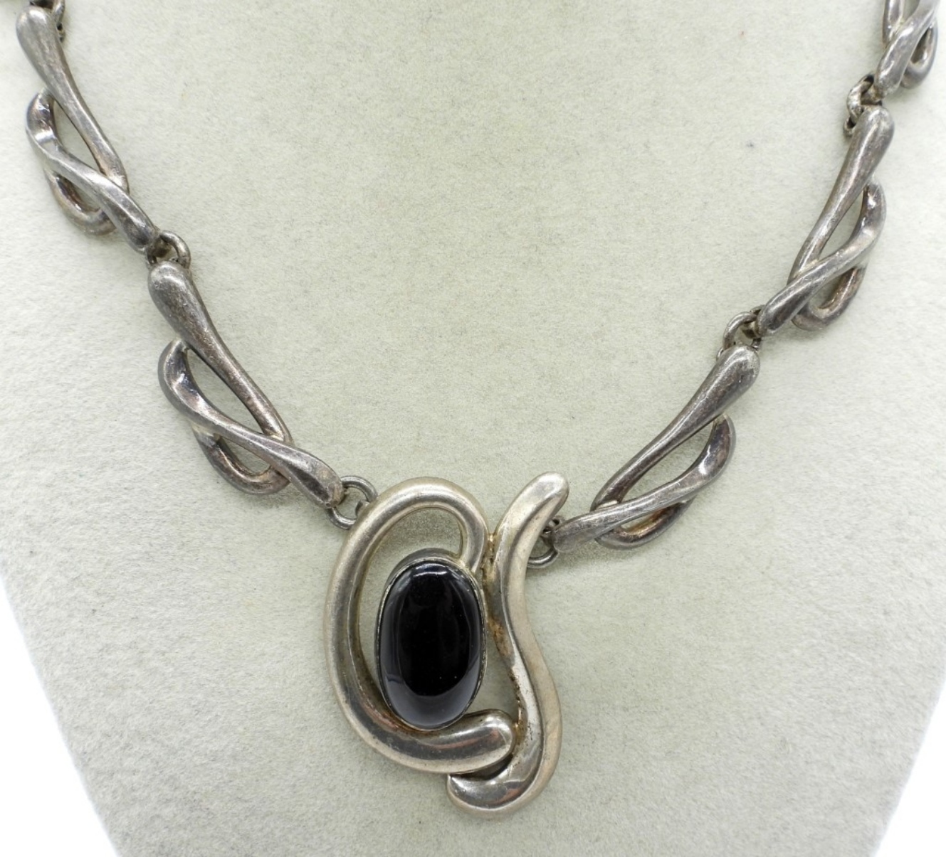 TARNISHED, HEAVY “MEXICO 925″ STATEMENT NECKLACE WITH BLACK ONYX GEMSTONE, 17”. 50 DWT