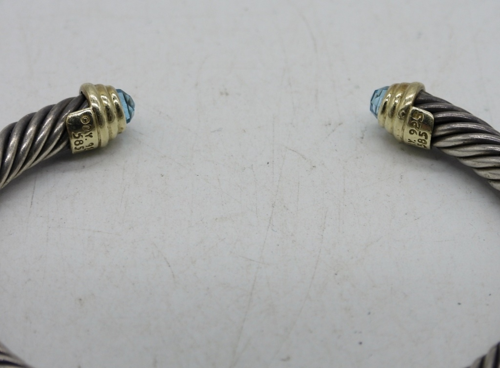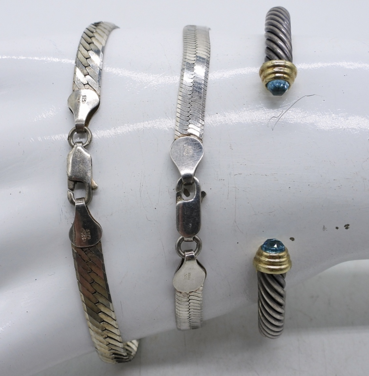 TWO STERLING CHAIN BRACELETS, 7″. ONE “D.Y. 925 / 585″ CUFF STYLE BRACELET 7-8”. 23.6 DWT