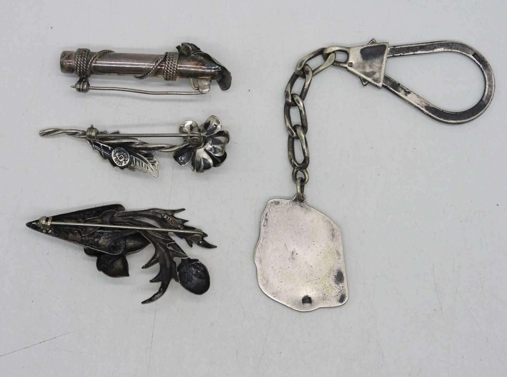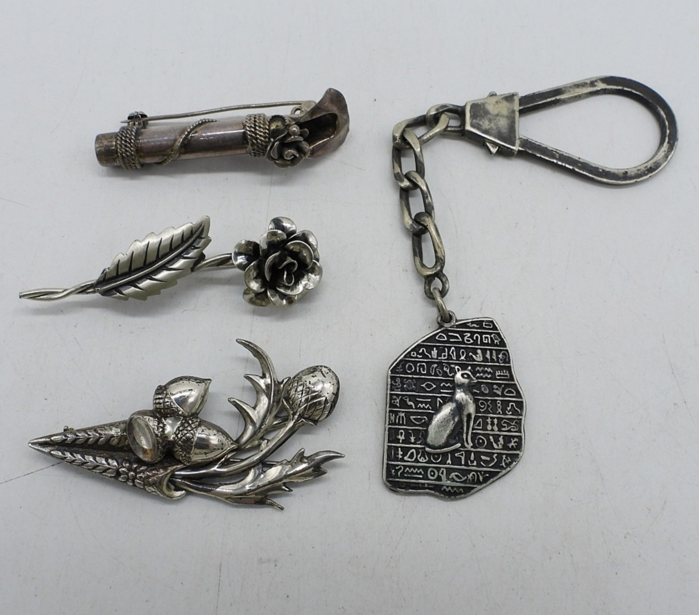ONE EGYPTIAN CAT KEYCHAIN, STERLING, 5″ LONG. 3 VINTAGE STERLING BROOCHES, 2-2.5″ LONG. 23.6 DWT