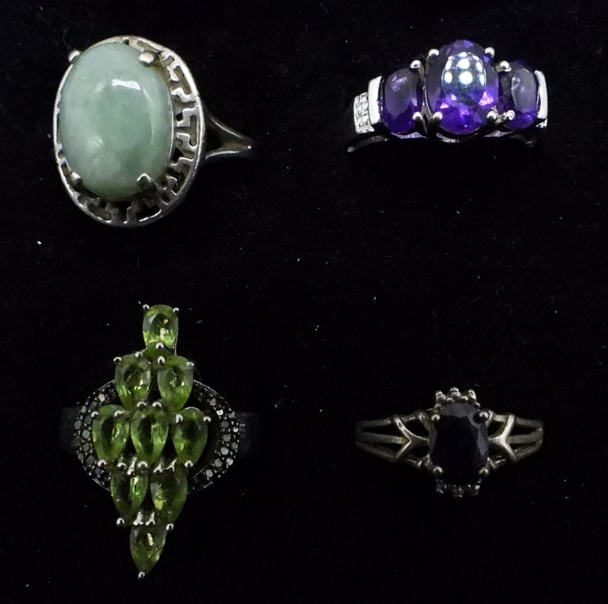 7 STERLING SILVER GEMSTONE RINGS, SIZES 6-8. TWO PAIR OF STERLING, FASHION GEMSTONE PIERCED EARRINGS. 24 DWT