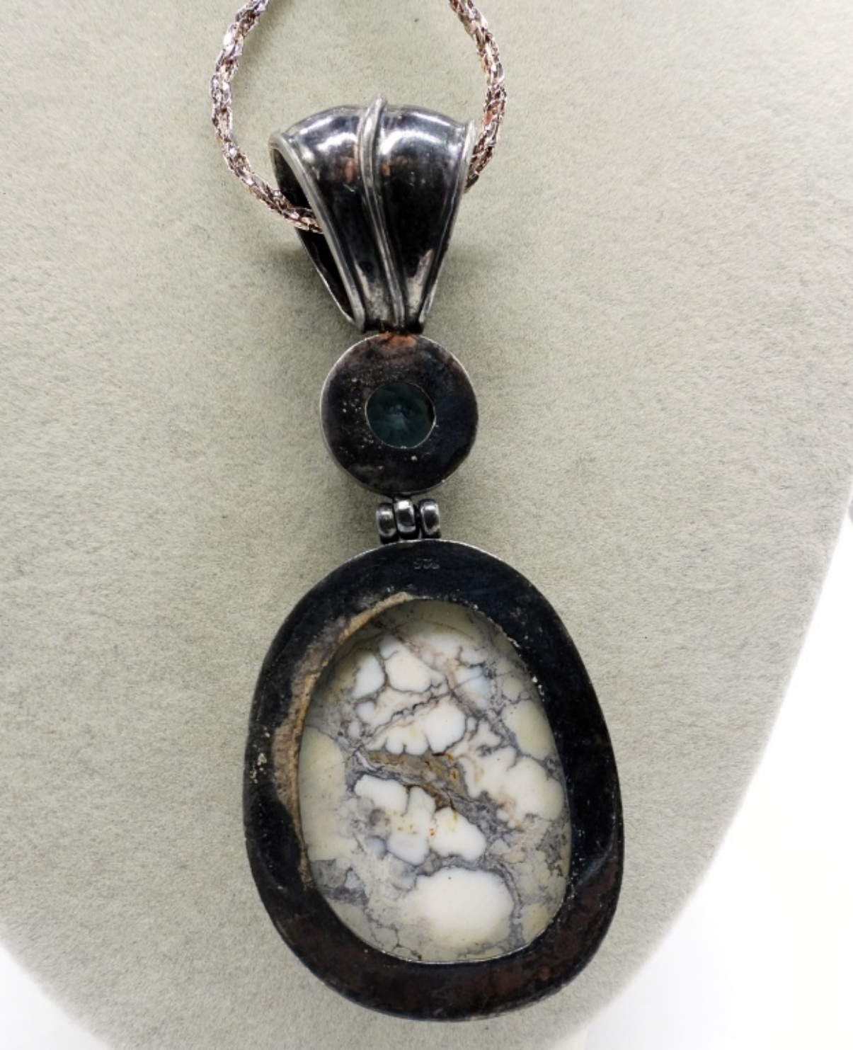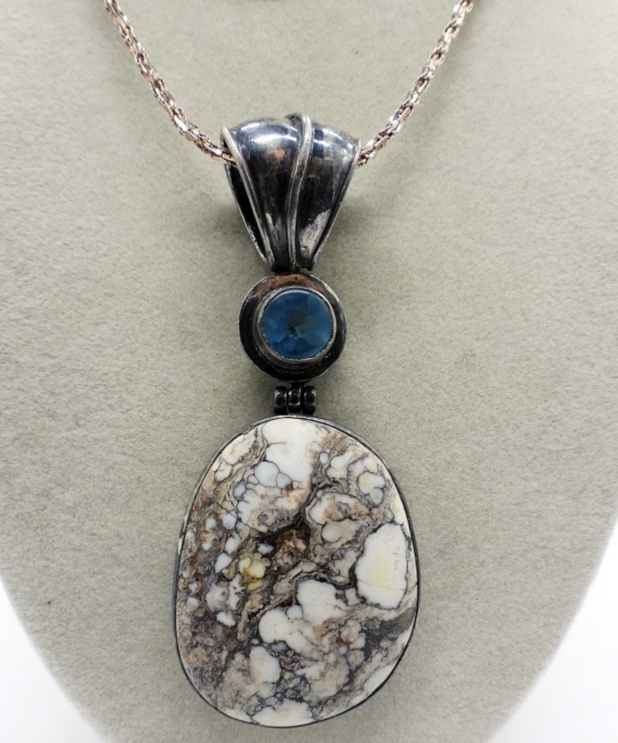 LARGE PIECE OF WHILD HORSE TURQUOISE (2″ TALL) WITH A BLUE GEMSTONE. PENDANT MEASURES 3.5″ LONG. STERLING CHAIN IS 30″. 25.4 DWT