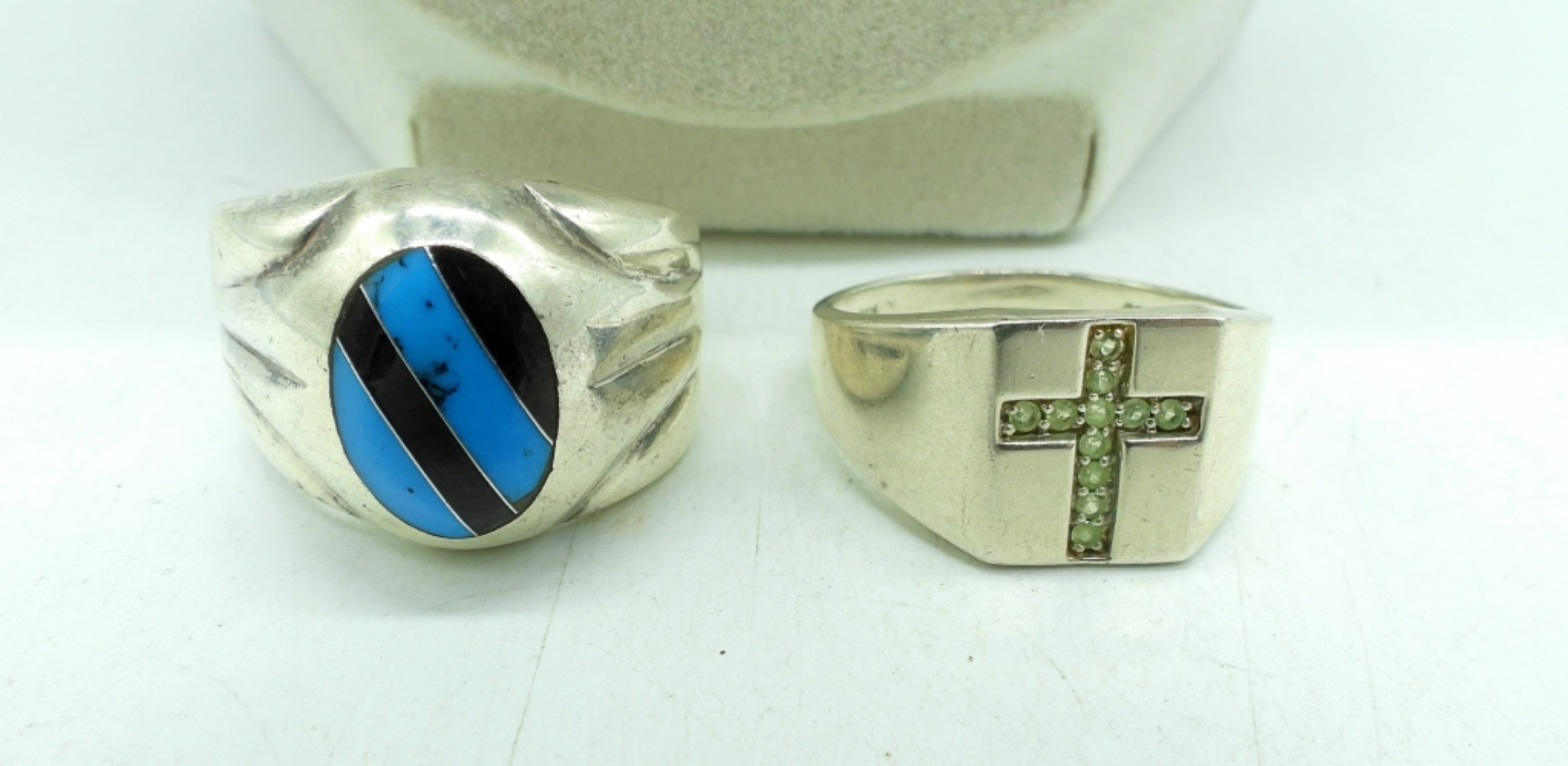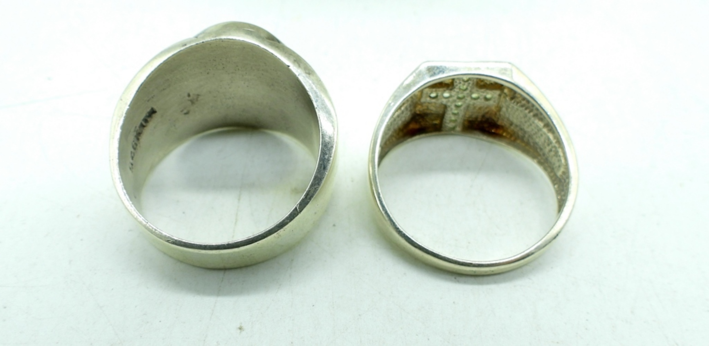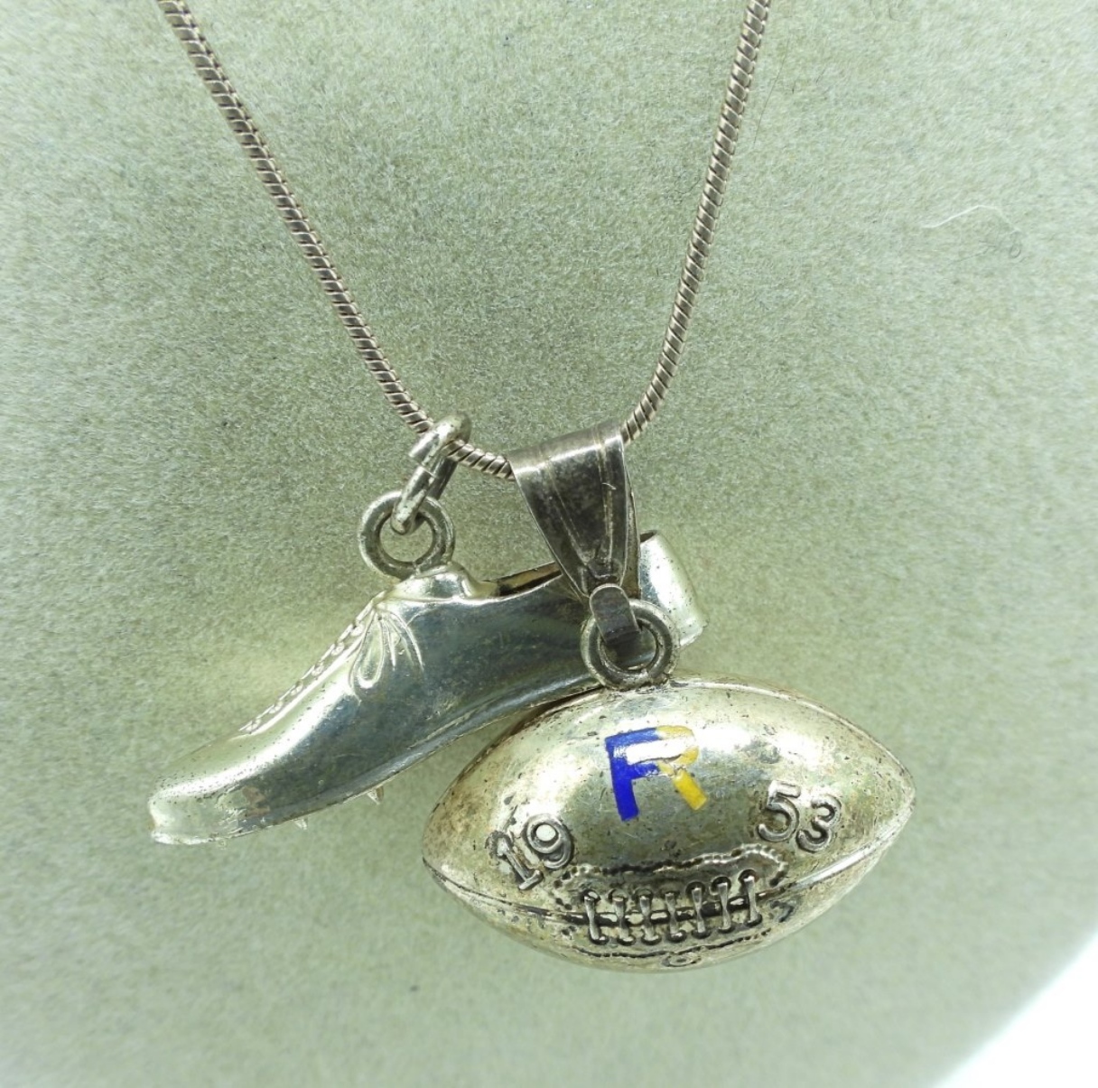 TWO STERLING MEN’S RINGS, SIZES 12 & 13. STERLING FOOTBALL & TRACK SHOE PENDANTS ON A STERLING 18″ CHAIN. 26 DWT