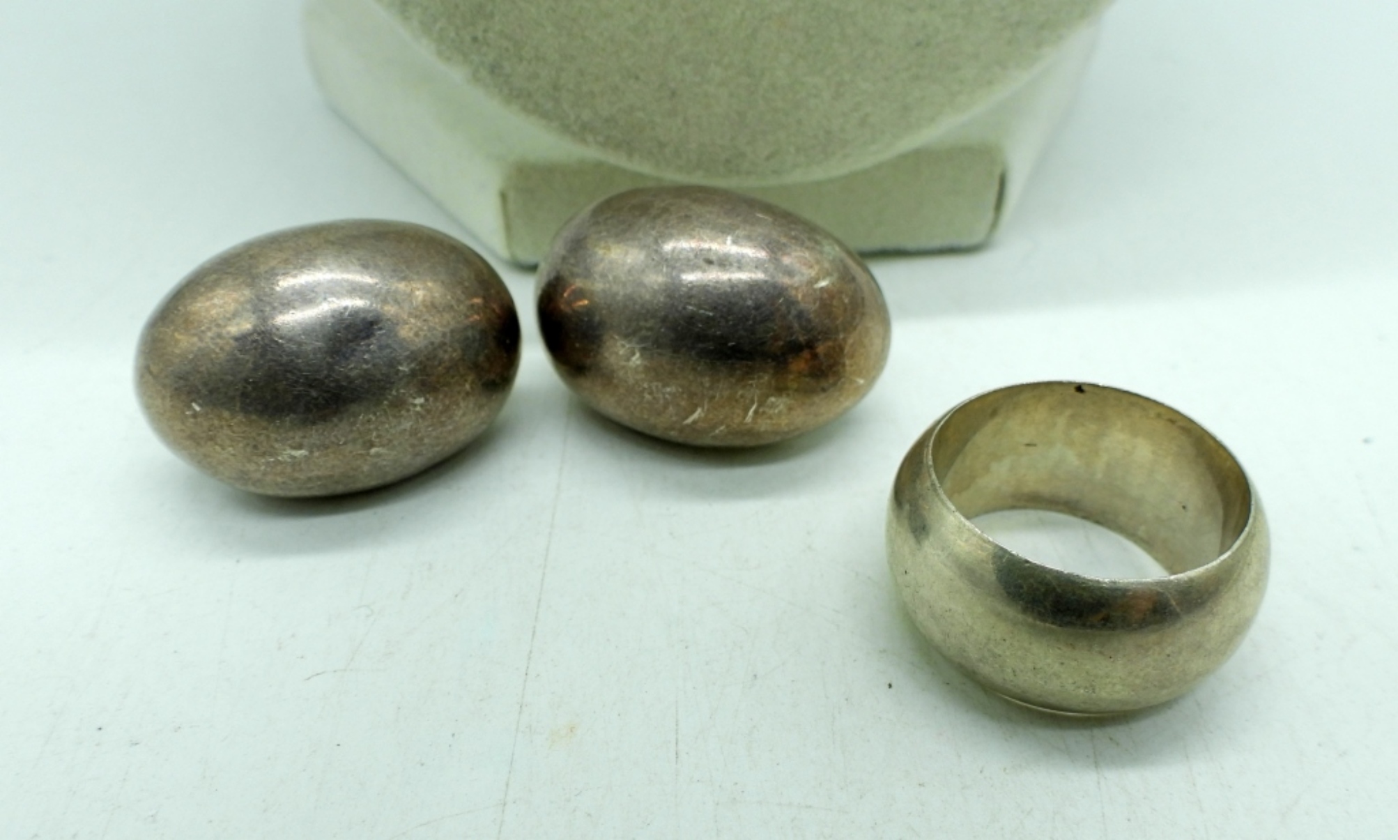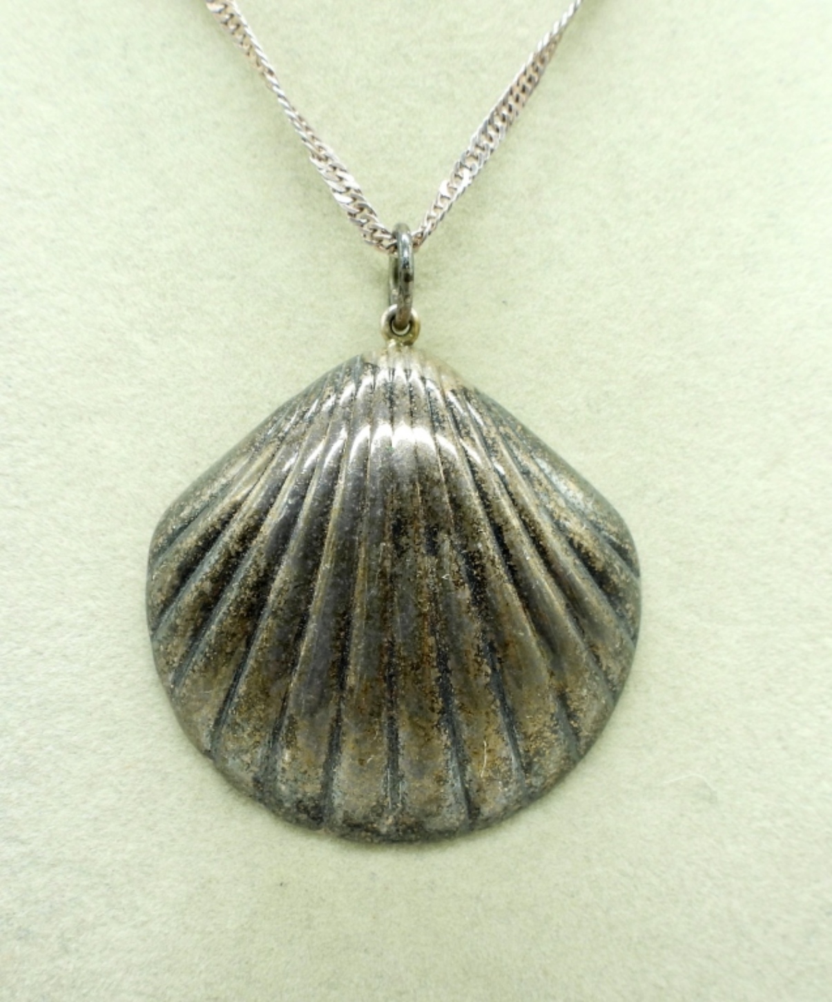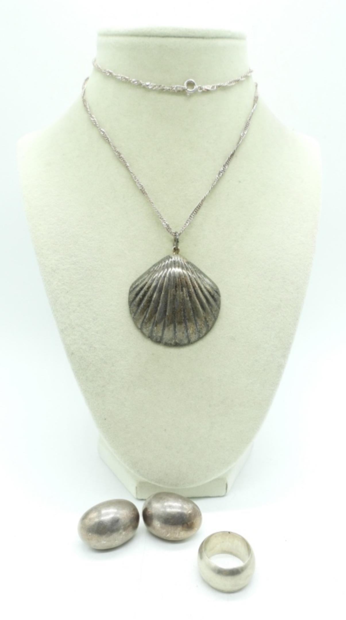 VINTAGE STERLING SHELL PENDANT 2″ ON A 24″ STERLING CHAIN. VINTAGE CLIP ON EARRINGS AND A PLAIN, THICK BAND SIZE 8. 27.2 DWT