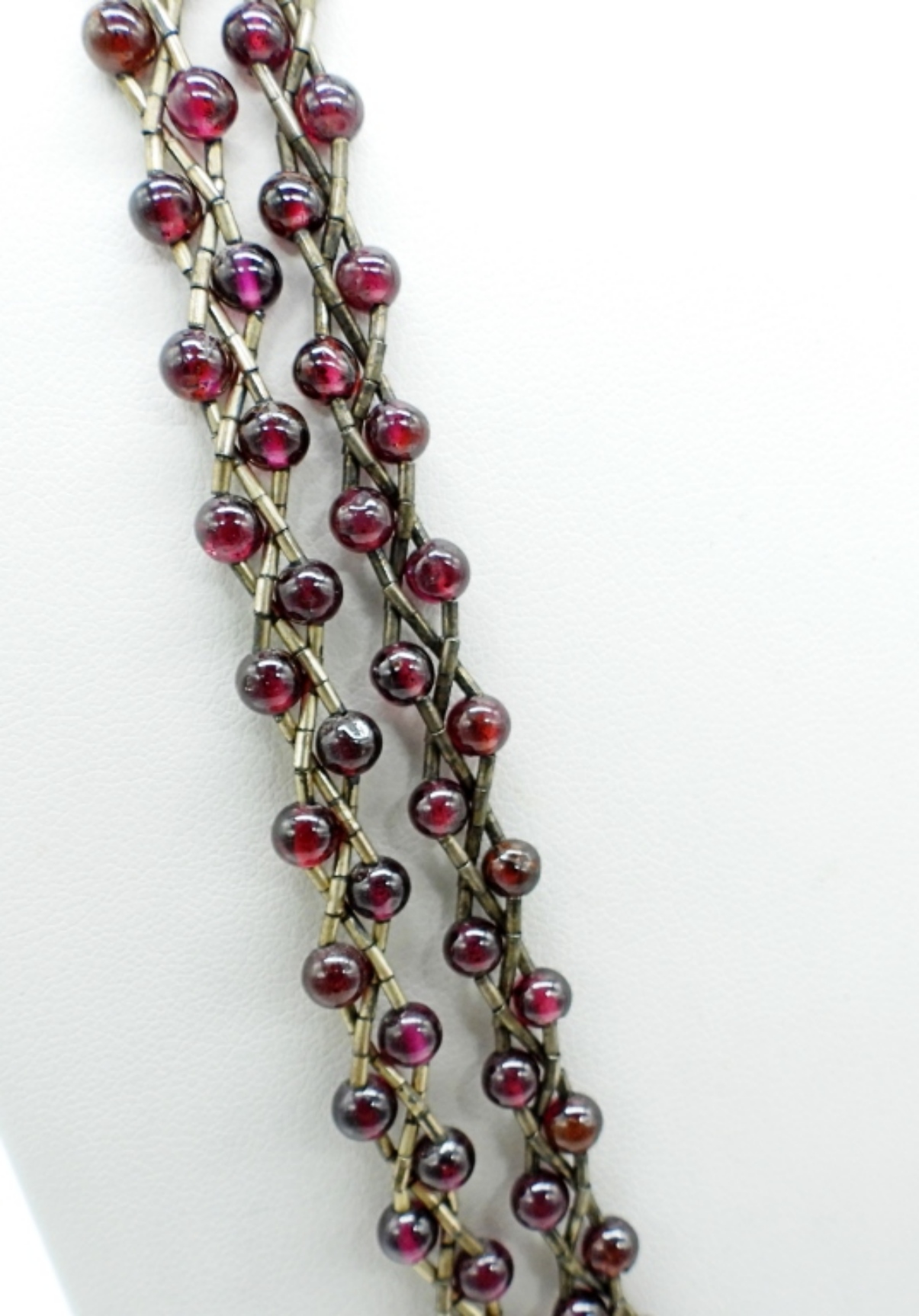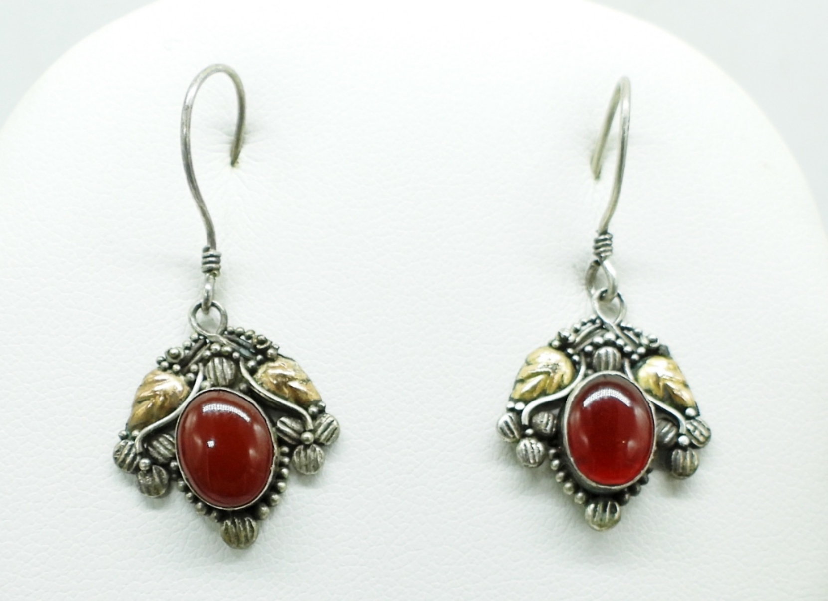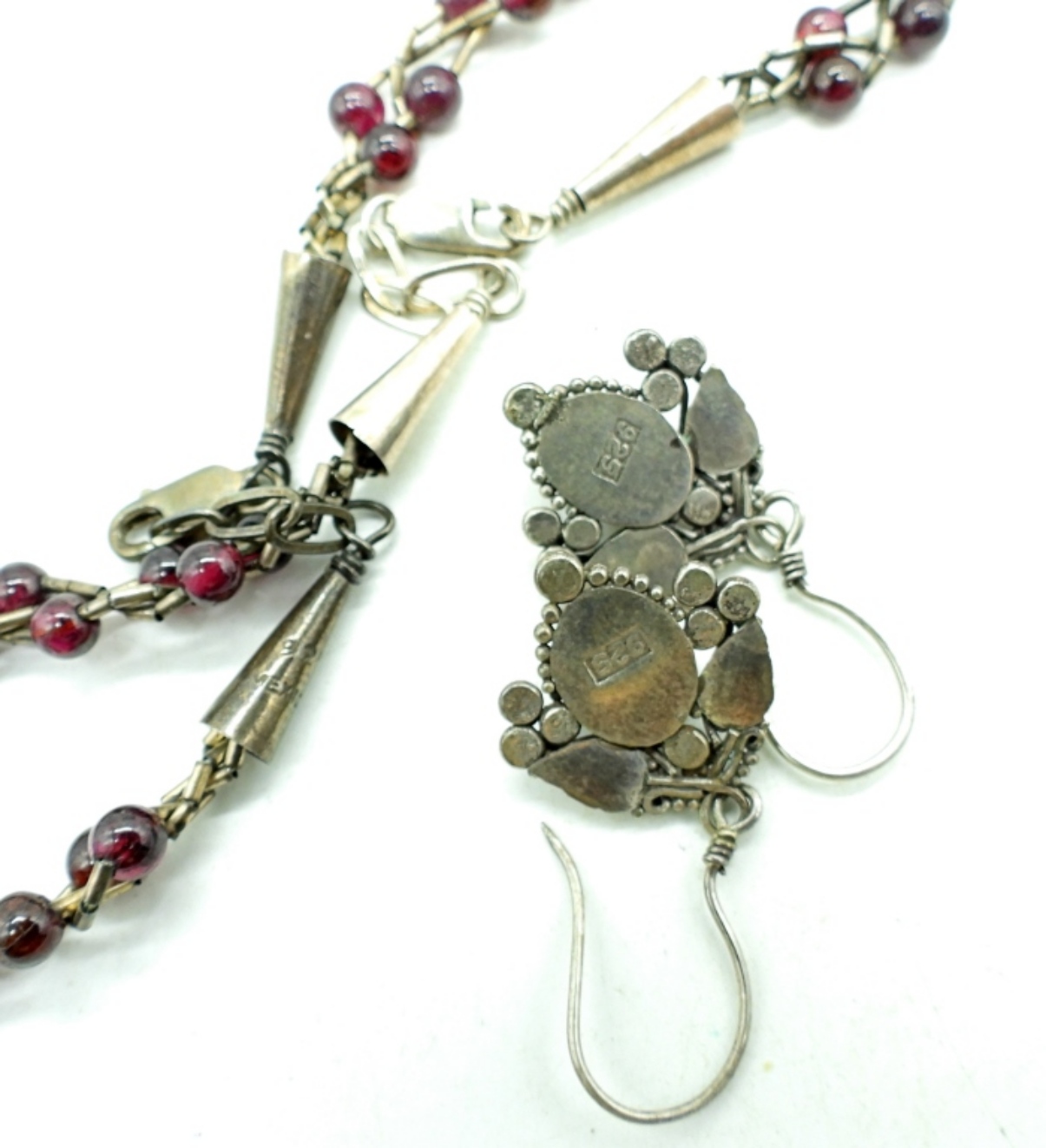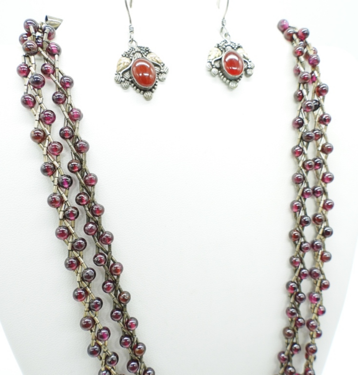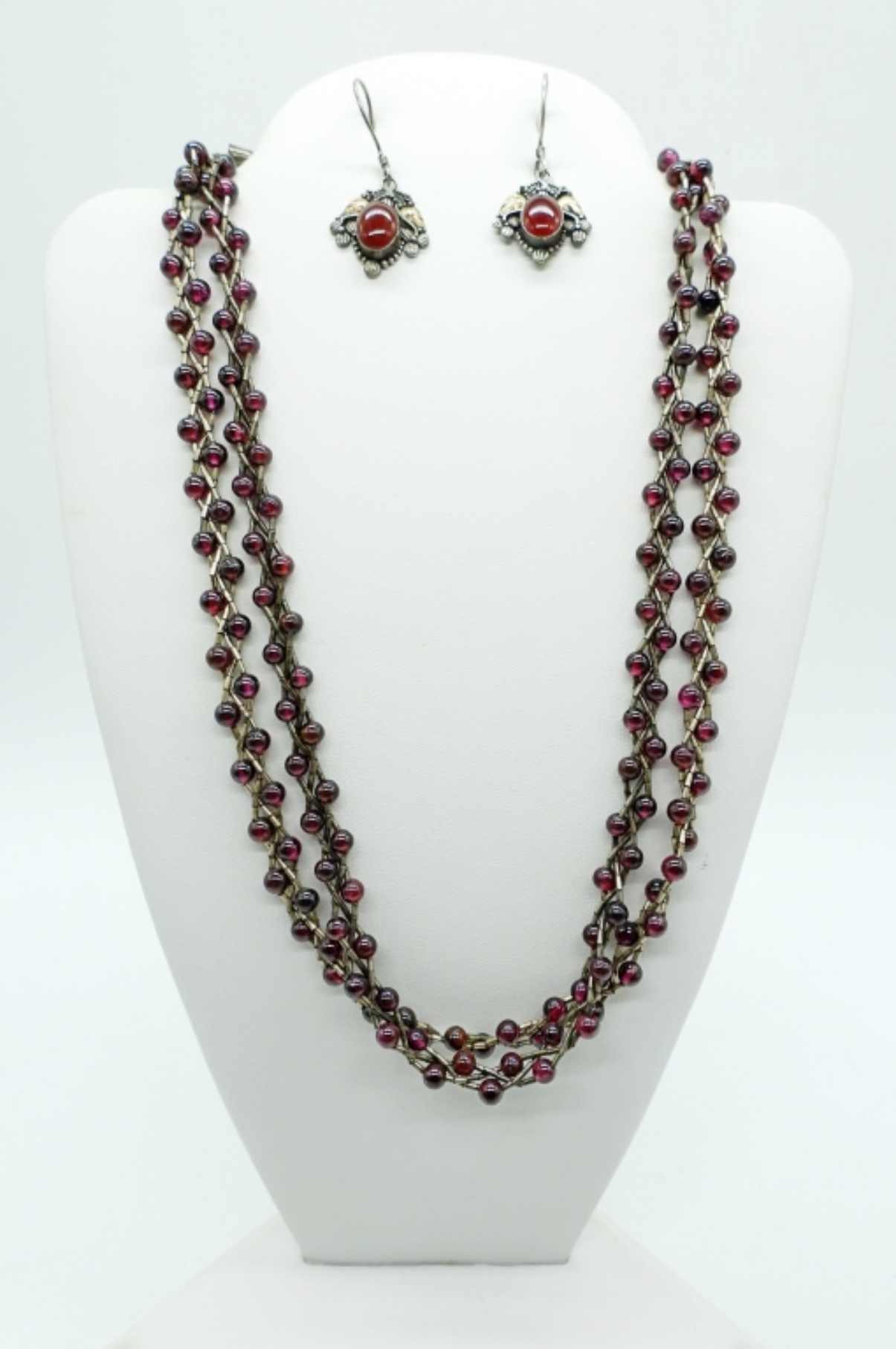 STERLING PIERCED EARRINGS, CARNELIAN GEMSTONE. TWO BURGUNDY STERLING BEADED BRAIDED NECKLACES, 16″. 18.1 DWT