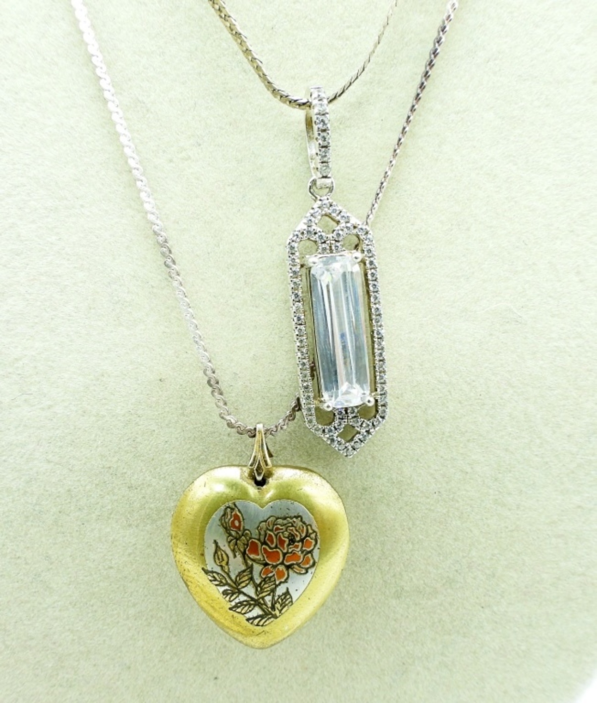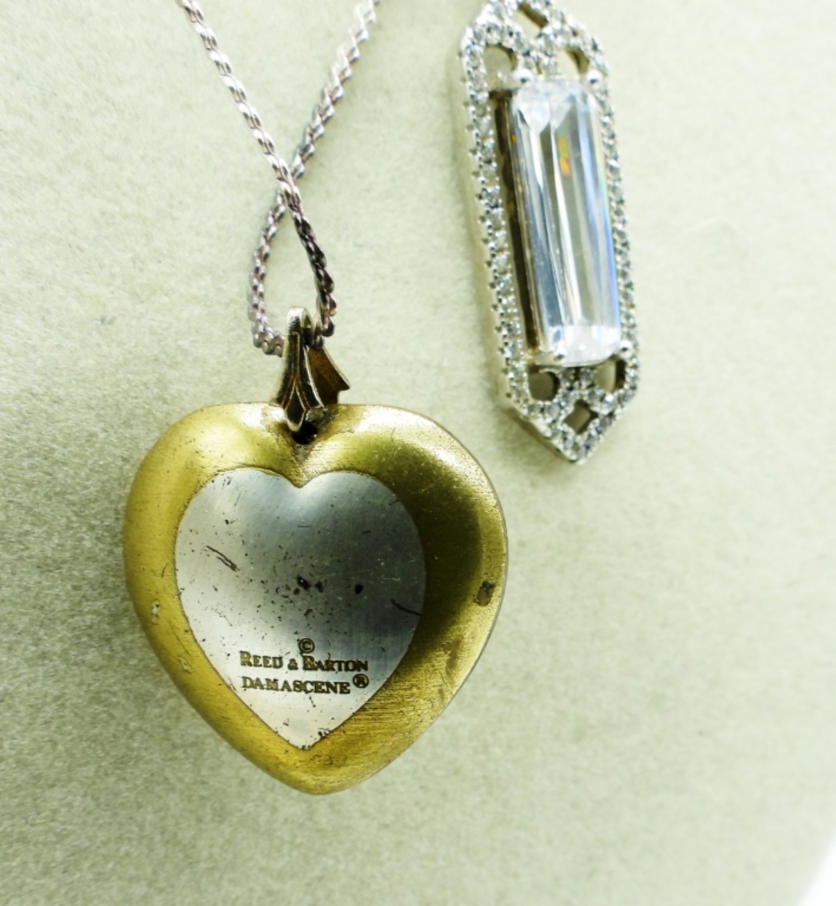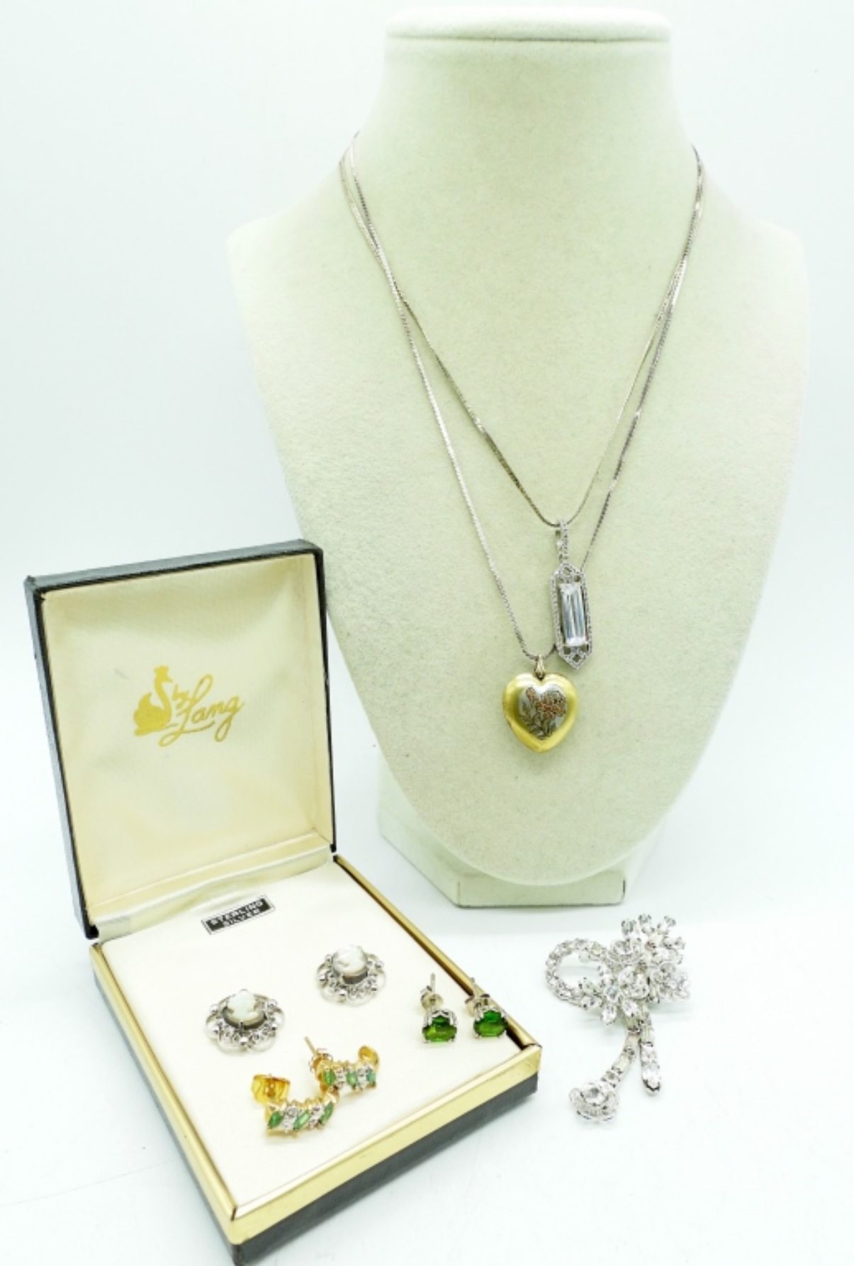 REED & BARTON STERLING HEART LOCKET, GOLD & SILVER TONES. ON A 18″ STERLING CHAIN. VINTAGE LEO GLASS STERLING WHITE RHINESTONE BROOCH, 2″. TWO PAIR OF PIERCED EARRINGS. DIAMOND LIKE NECKLACE ON A 16″ STERLING