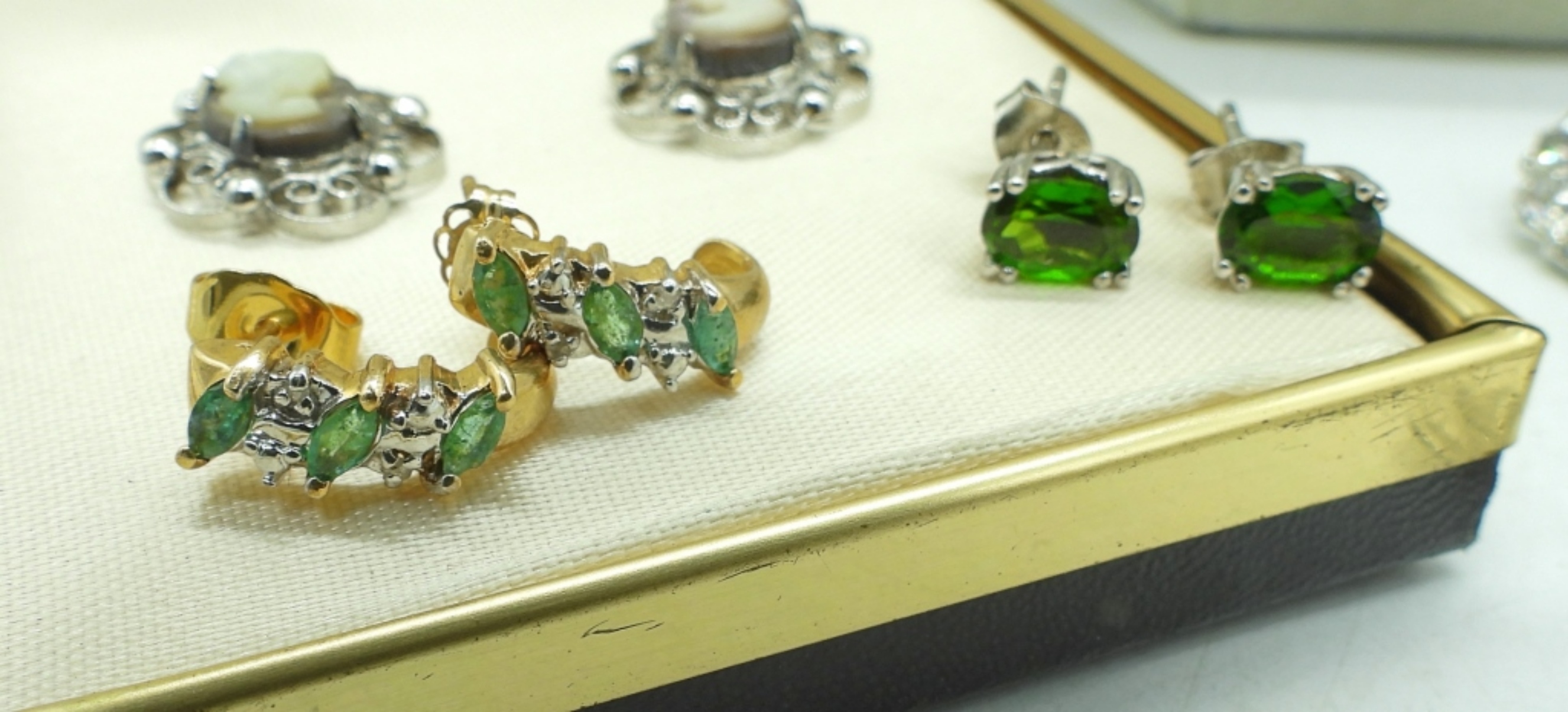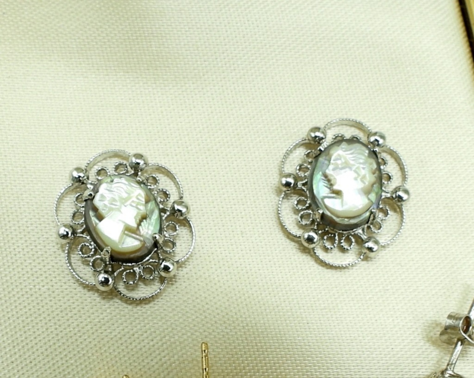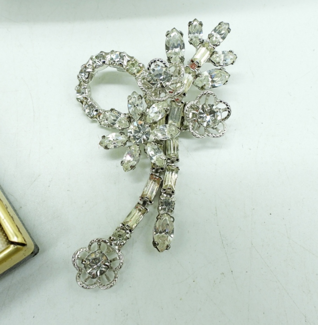 REED & BARTON STERLING HEART LOCKET, GOLD & SILVER TONES. ON A 18″ STERLING CHAIN. VINTAGE LEO GLASS STERLING WHITE RHINESTONE BROOCH, 2″. TWO PAIR OF PIERCED EARRINGS. DIAMOND LIKE NECKLACE ON A 16″ STERLING