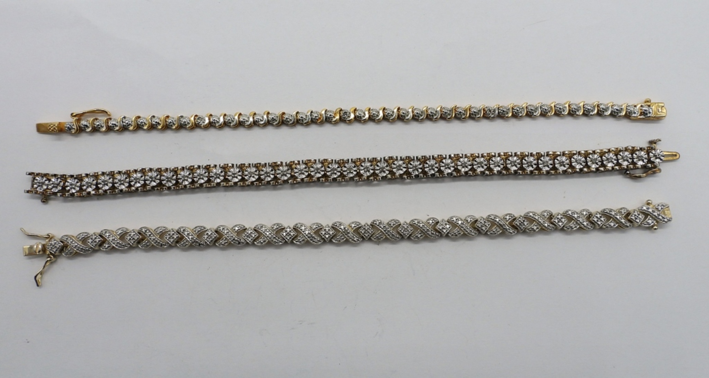 THREE GOLD TONE, STERLING SILVER TENNIS BRACELETS WITH DIAMOND LIKE GEMSTONES. ALL 8″. 25.2 DWT