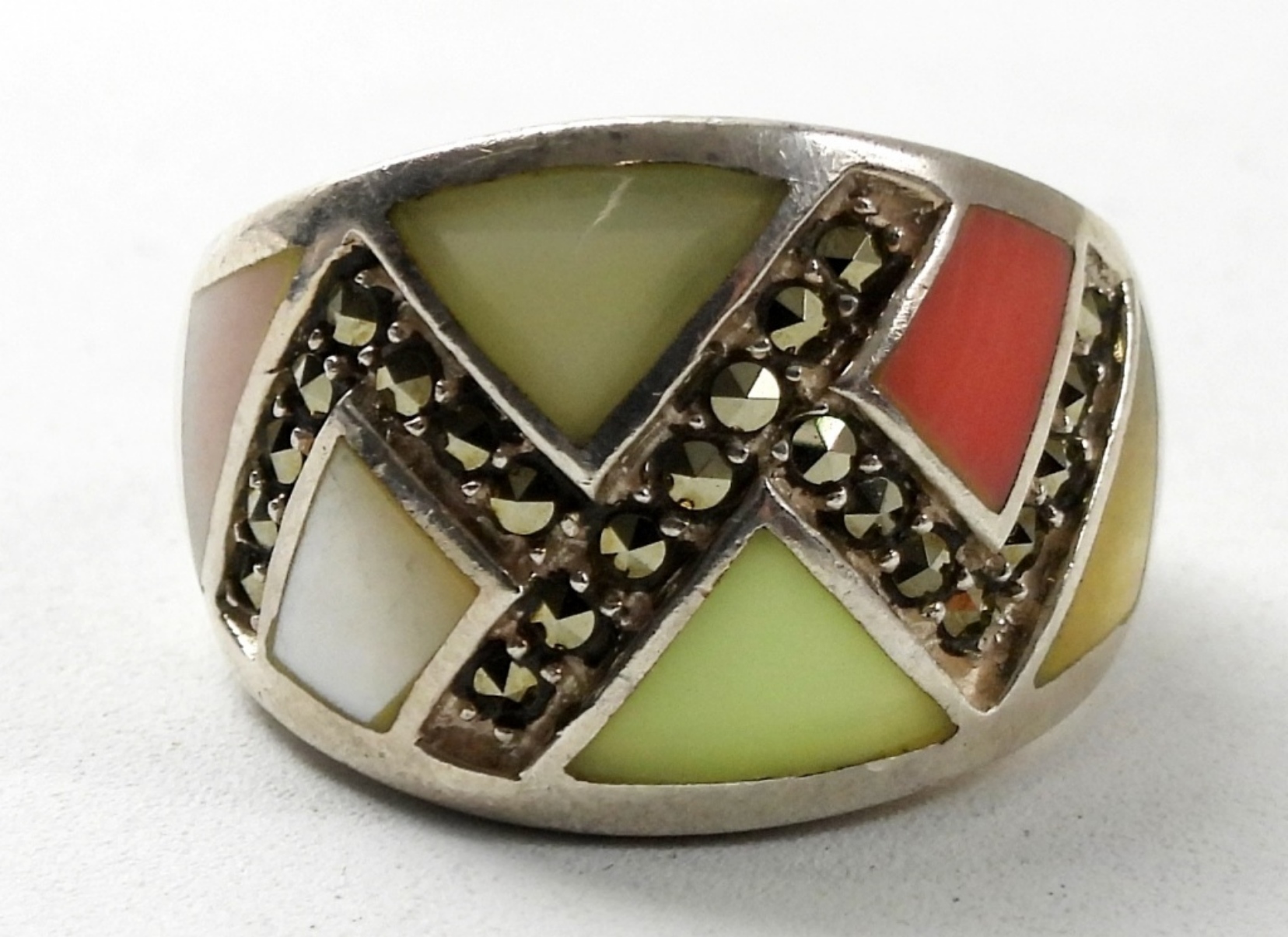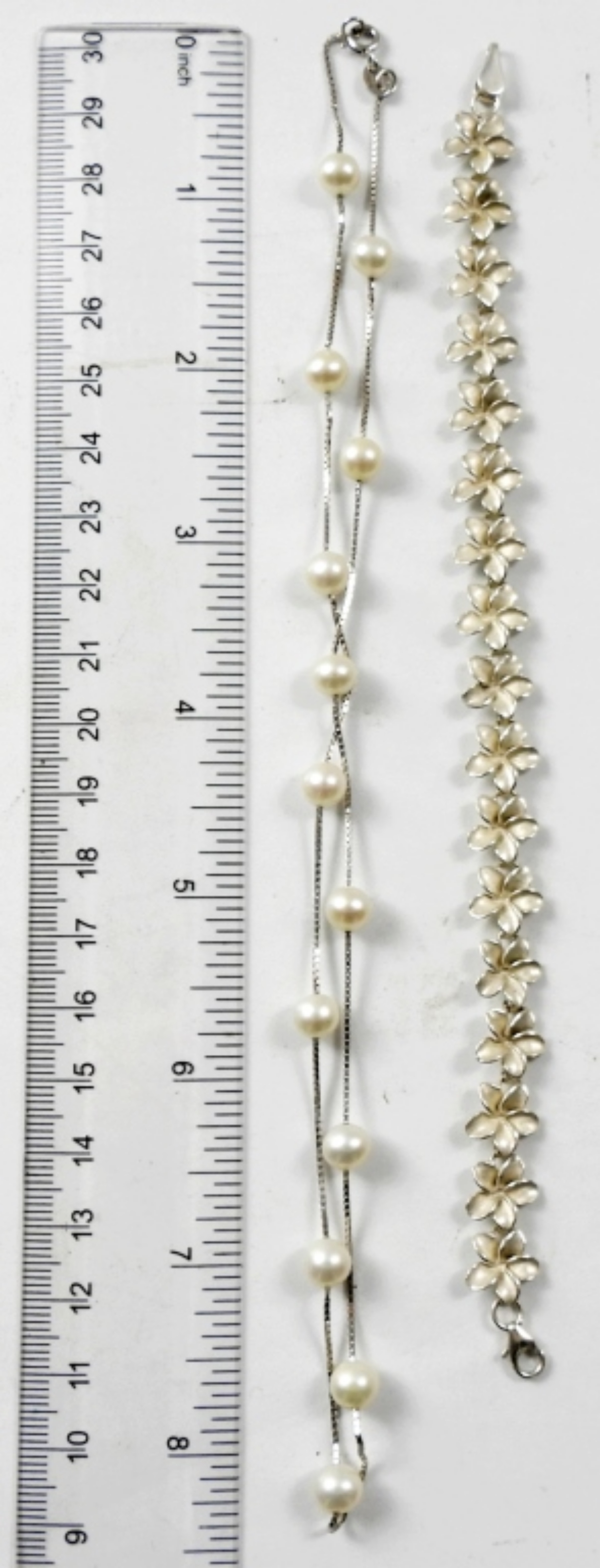 16″ FLOATING PEARL STERLING NECKLACE, 6″ FLOWER BRACELET AND A SIZE 9 RING WITH MULTI COLOR GEM INLAY(15.2 DWT)