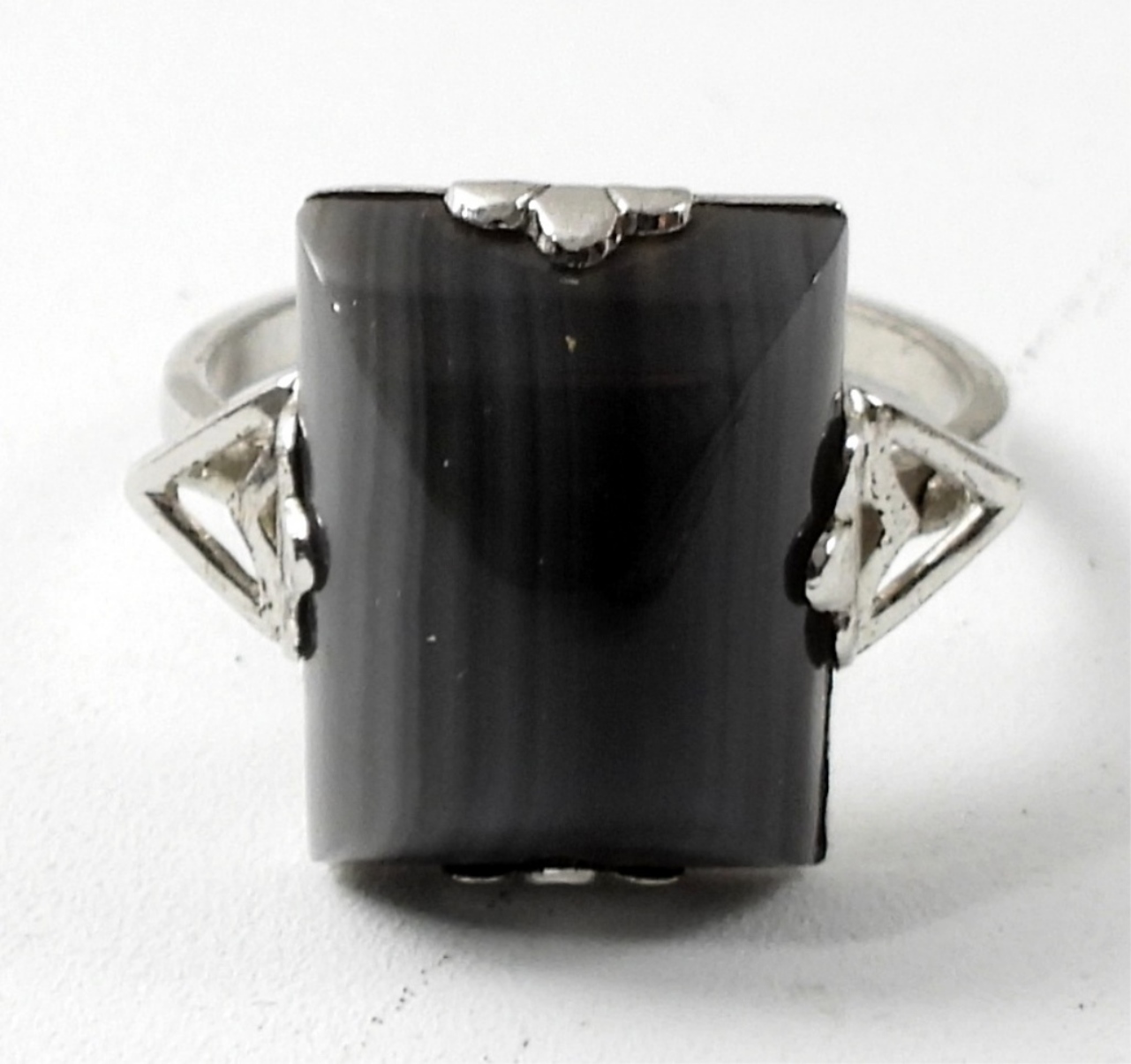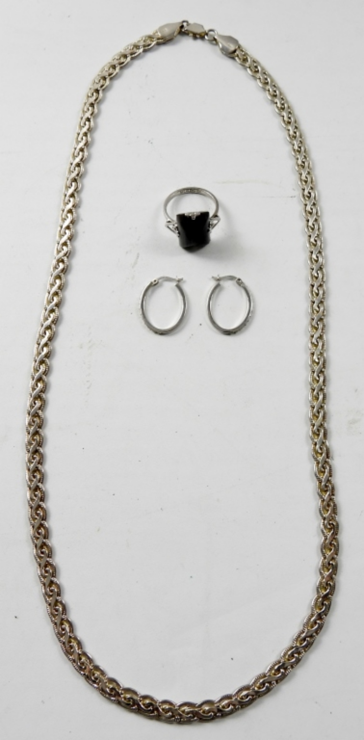 23″ STERLING NECKLACE, SIZE 8 RING WITH GREY GEMSTONE AND A PAIR OF EARRINGS (28.1 DWT)