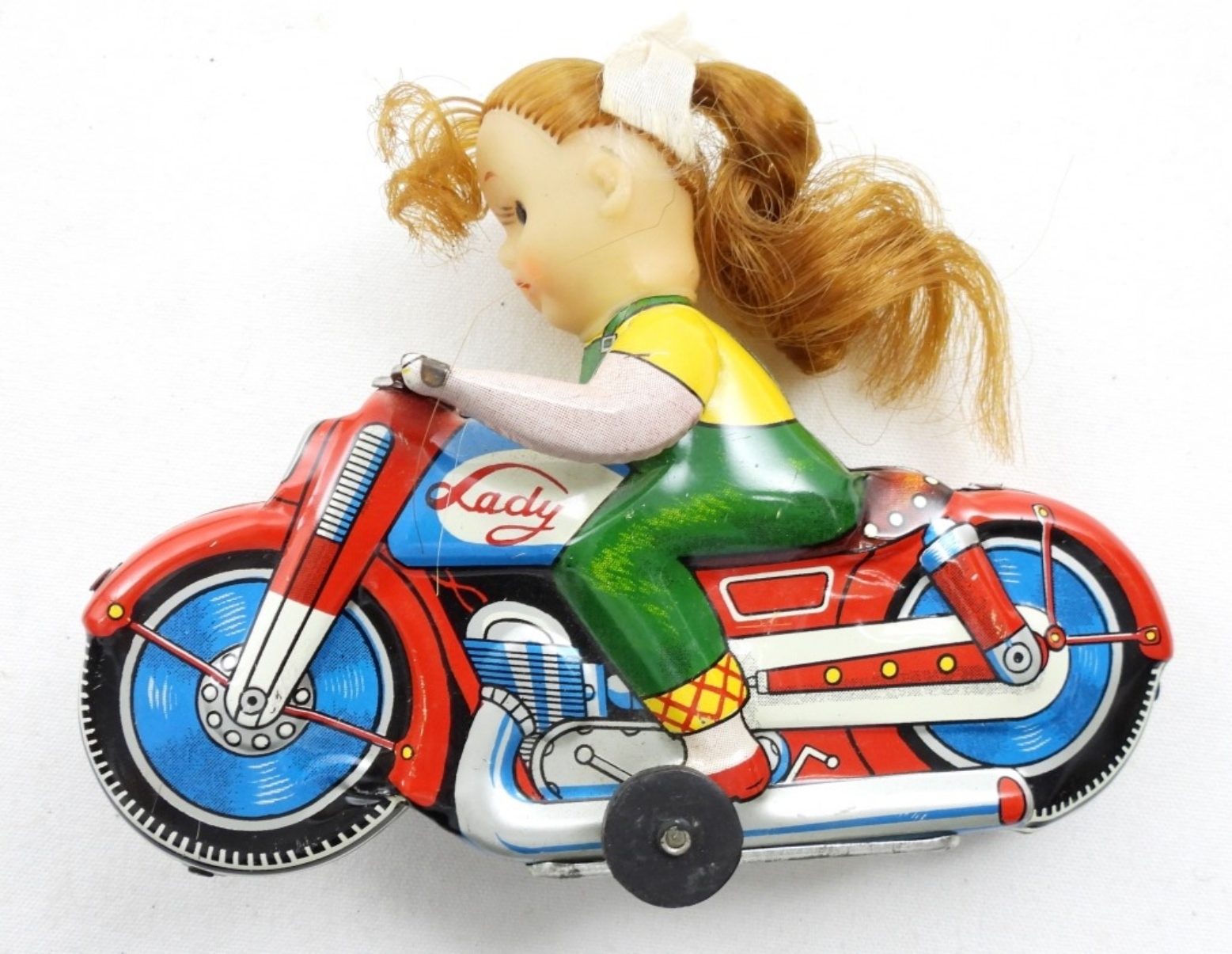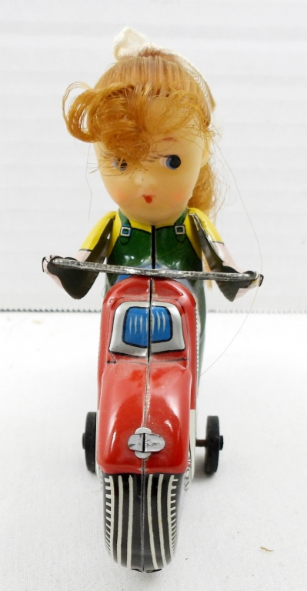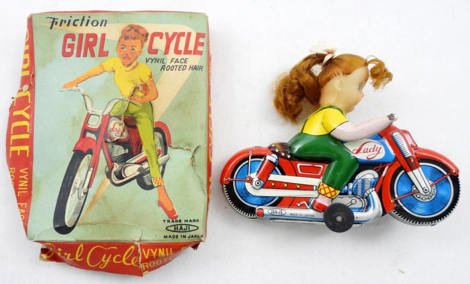 VINTAGE HAJI FRICTION GIRL ON MOTORCYCLE IN BOX. VYNAL FACE AND ROOTED HAIR