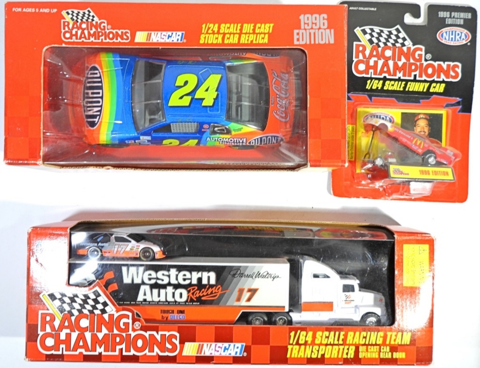 1 1/64 SCALE RACING TEAM WESTER AUTO #17 TRANSPORTER DIE CAST, 1 1/24 SCALE DIE CAST #24 STOCK CAR REPLICA, 1 1/64 SCALE FUNNY MCDONALDS CAR