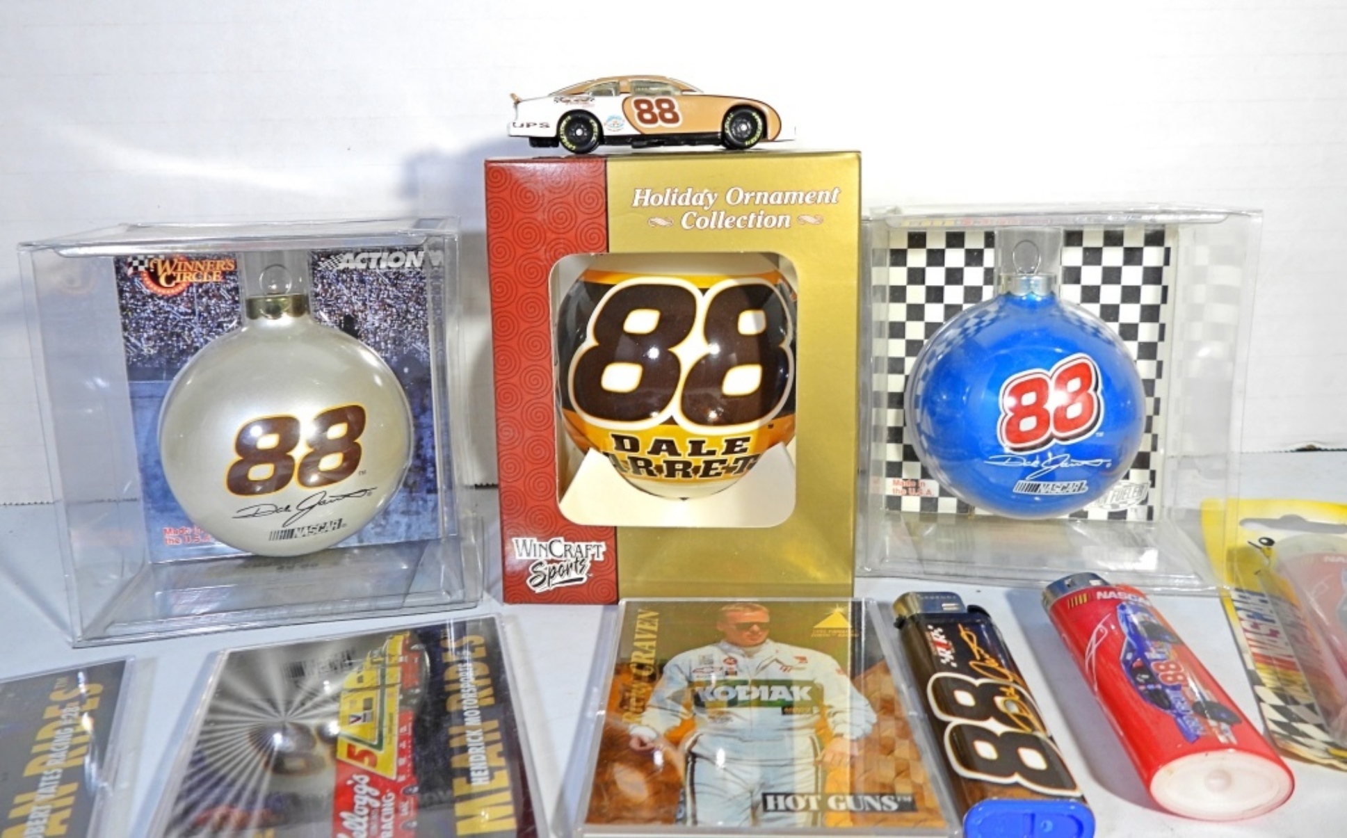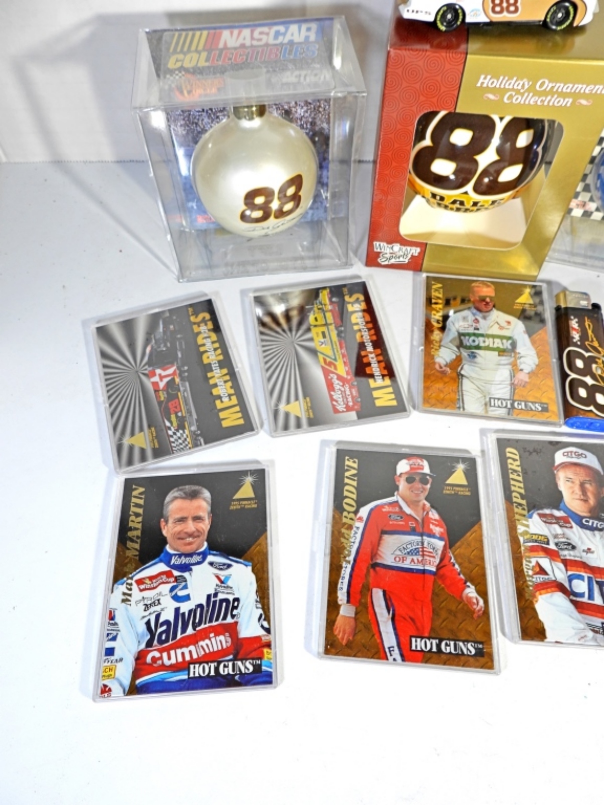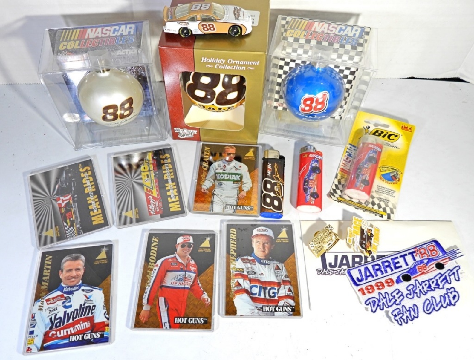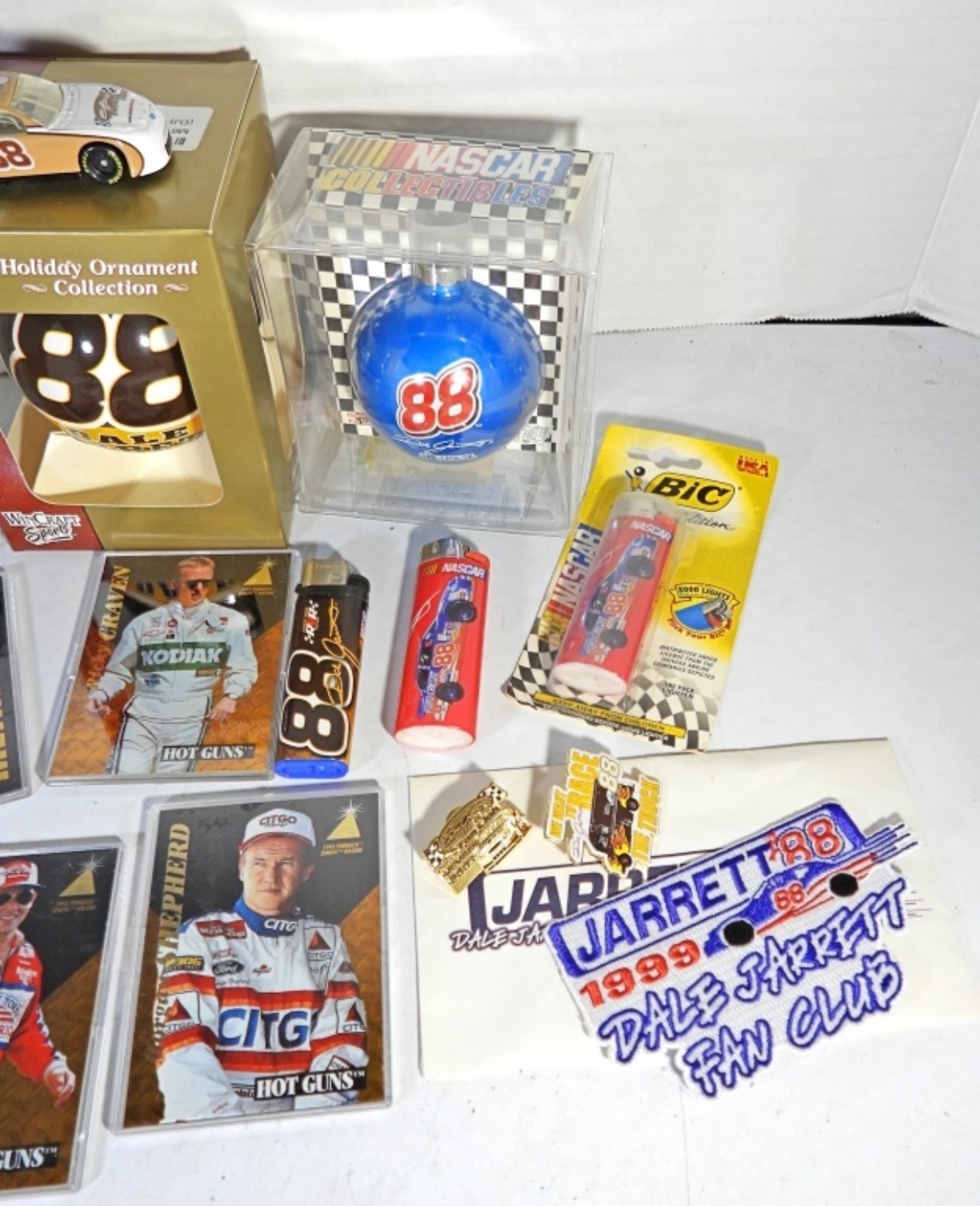 DALE JARRETT BULBS, LIGHTERS, PINS, PATCHES, VARIETY OF COLLECTORS CARDS