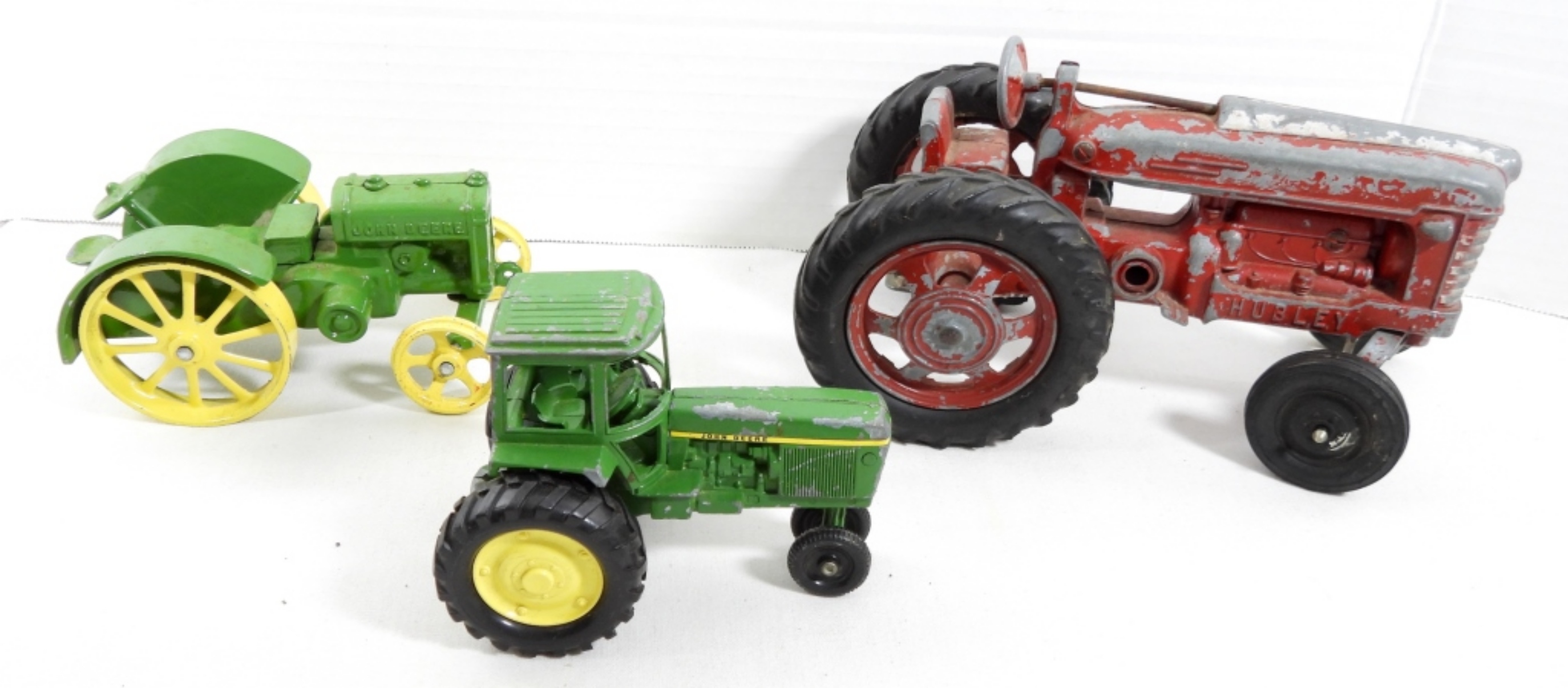 (3) VINTAGE CAST IRON TRACTORS. 2 JOHN DEER TRACTORS AND 1 RED HUBLEY TRACTOR