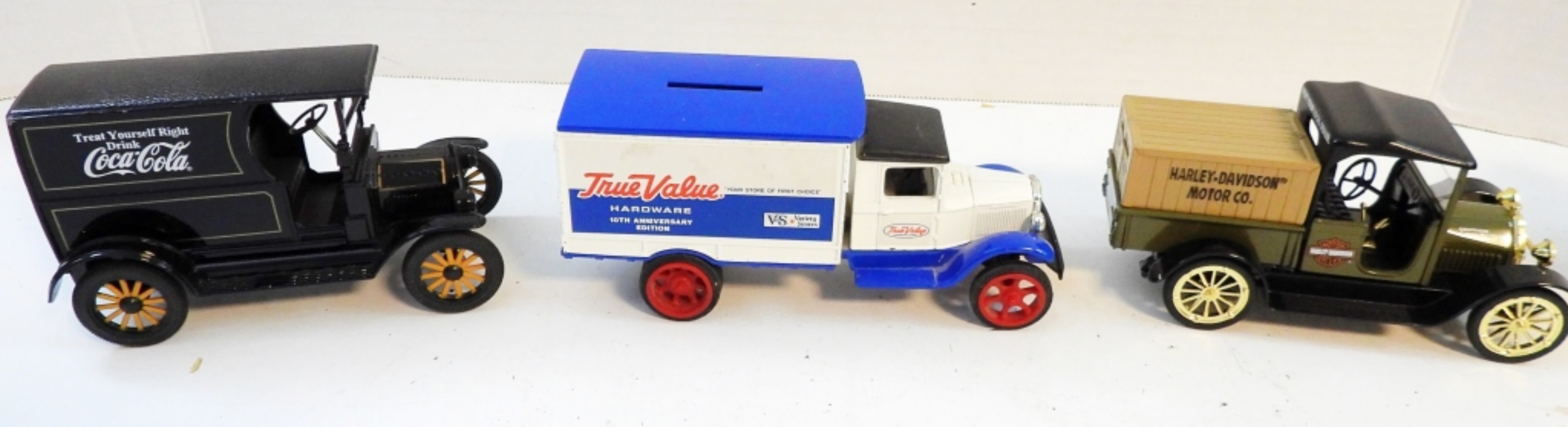3 VINTAGE CAST IRON STORE LOGO CARS .2 ARE COIN BANKS. TRUE VALUE,COCA-COLAAND HARLEY DAVIDSON