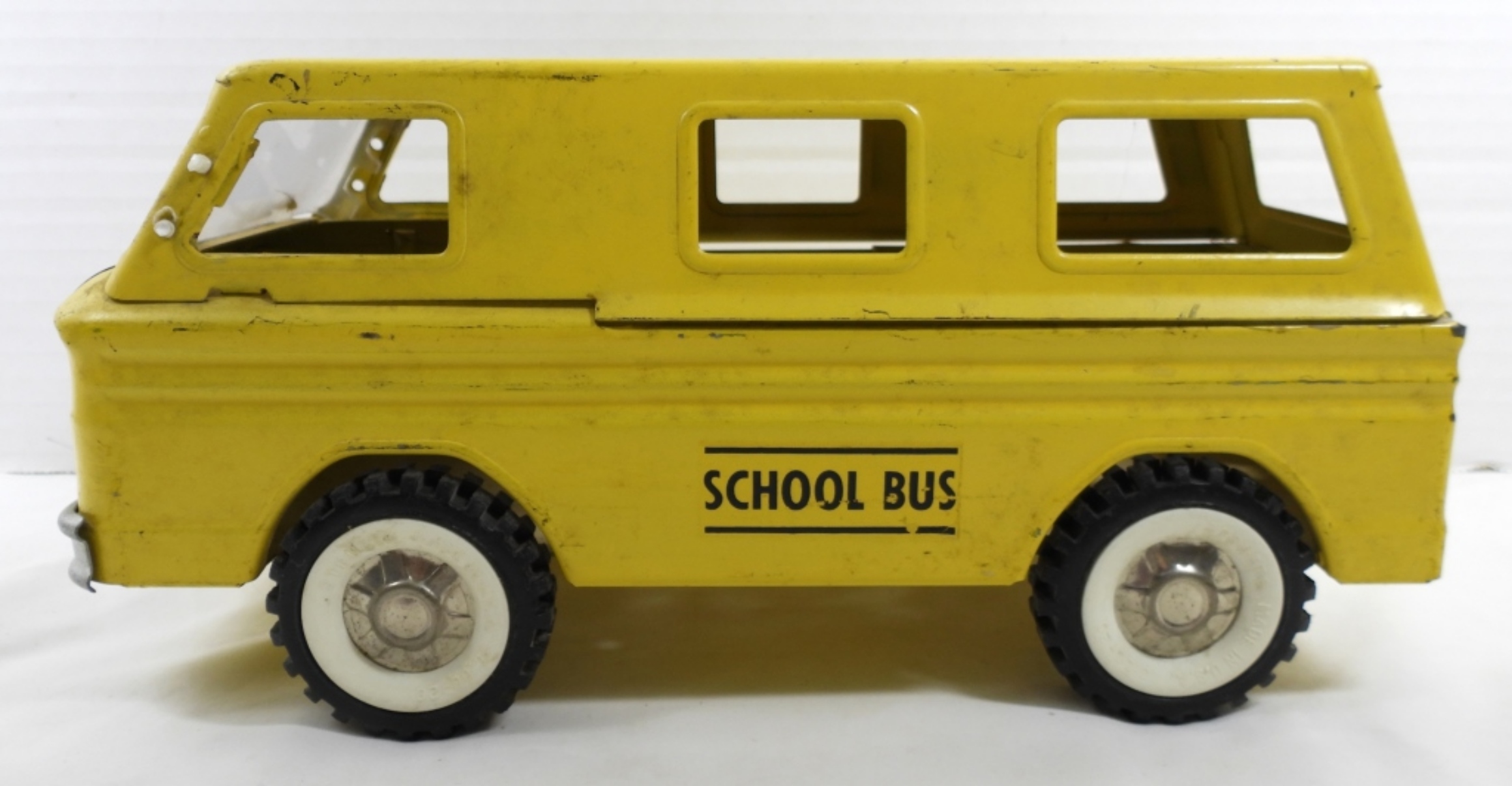 PRESSED STEEL SCHOOL BUS TOY- IN GOOD CONDITION DOES HAVE SOME WEAR TO IT, HAS SCRATCHES ON THE PAINT. PREOWNED