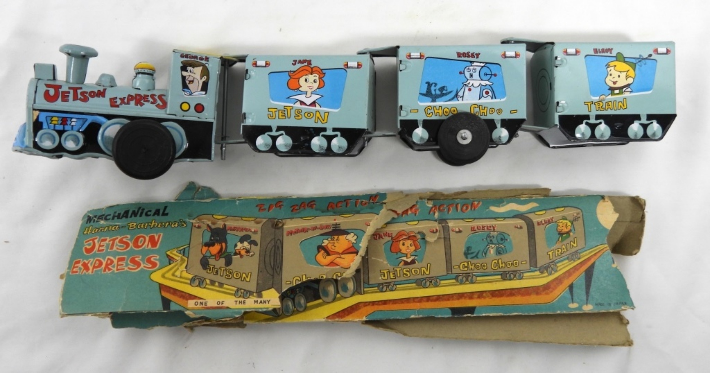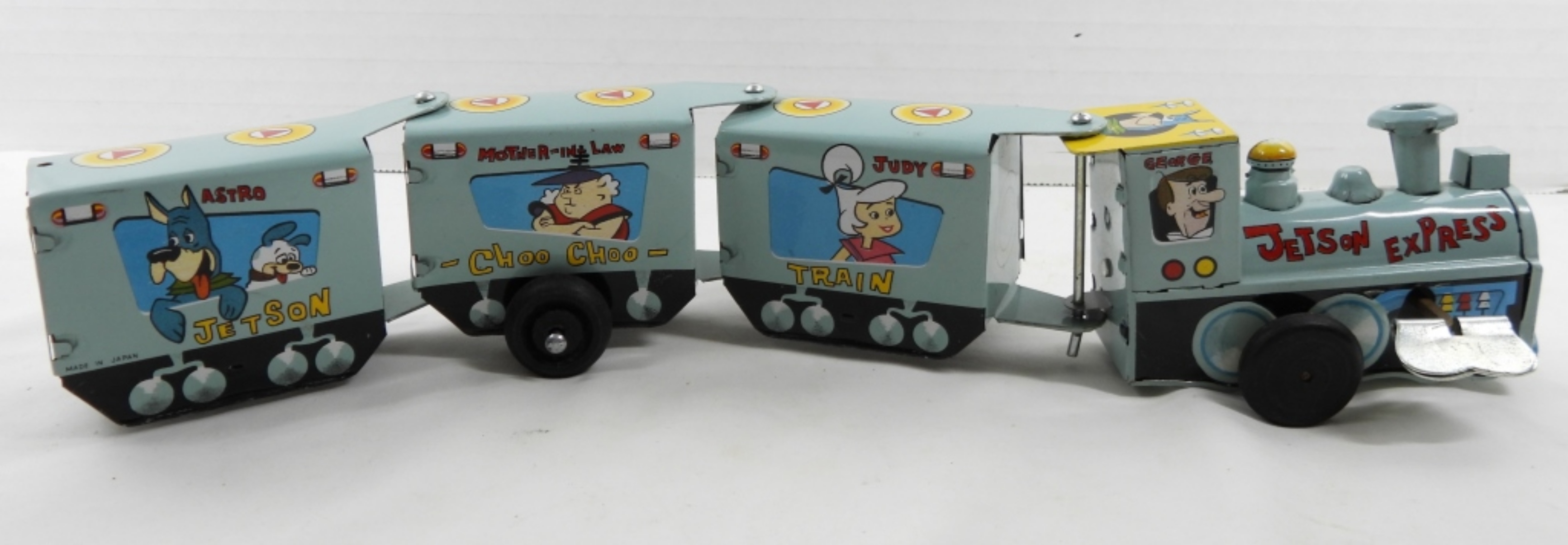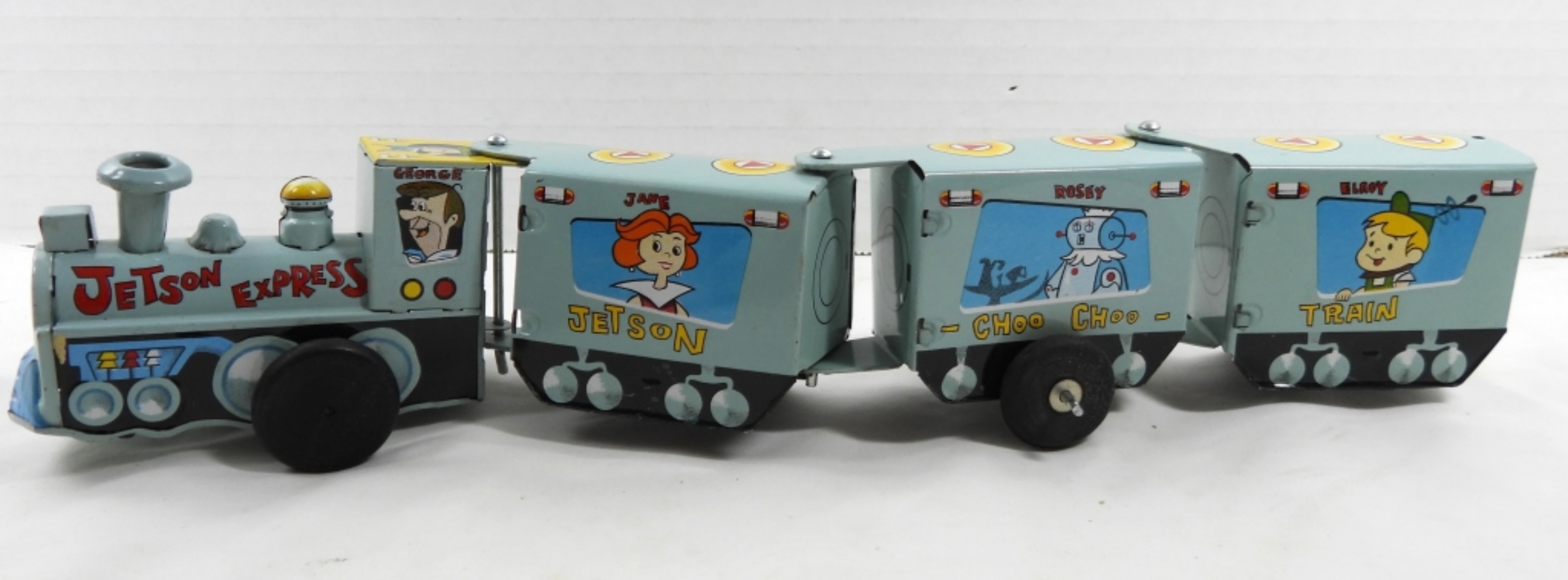 1963 JETSONS EXPRESS WIND UP TIN TRAIN- TURN THE KEY AND WIND THE TRAIN UP AND THE WHEELS WILL TURN, UNTIL YOU SET IT ON A FLAT SURFACE IT WILL NOT PULL ITSELF TILL YOU GIVE IT A LITTLE PUSH. IN GOOD CONDITION. HAS THE