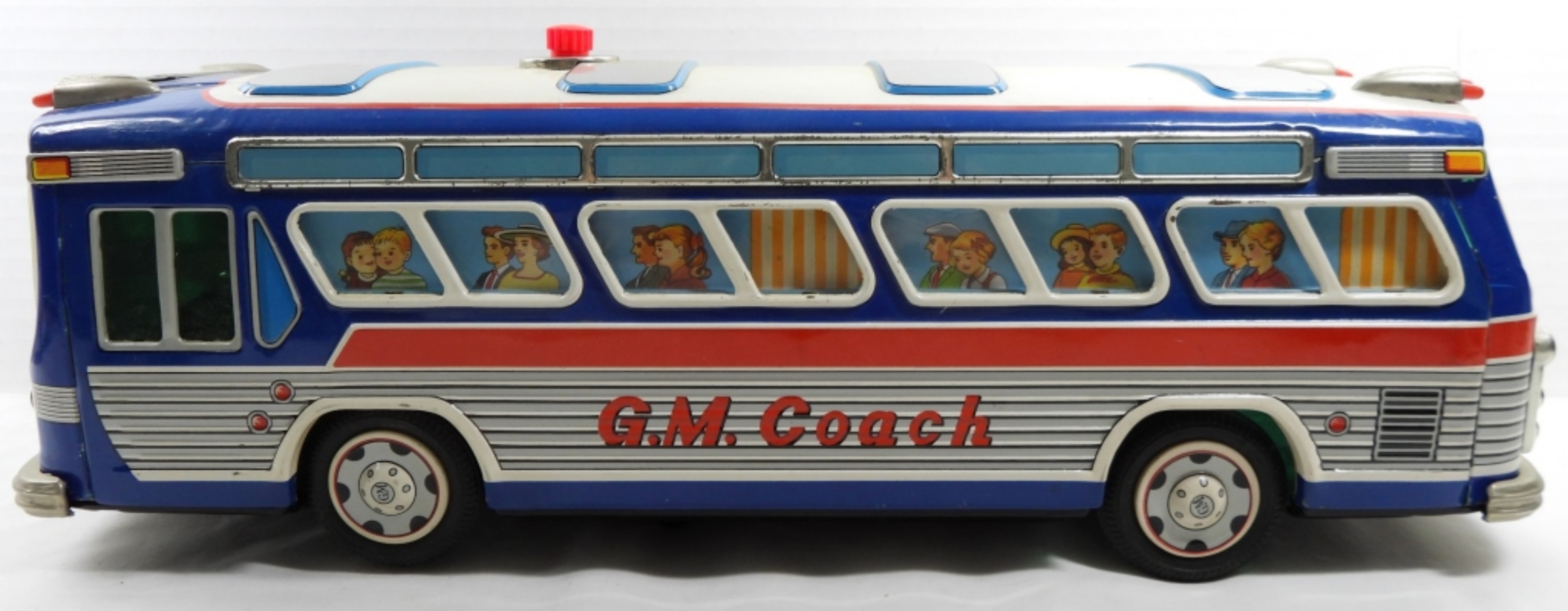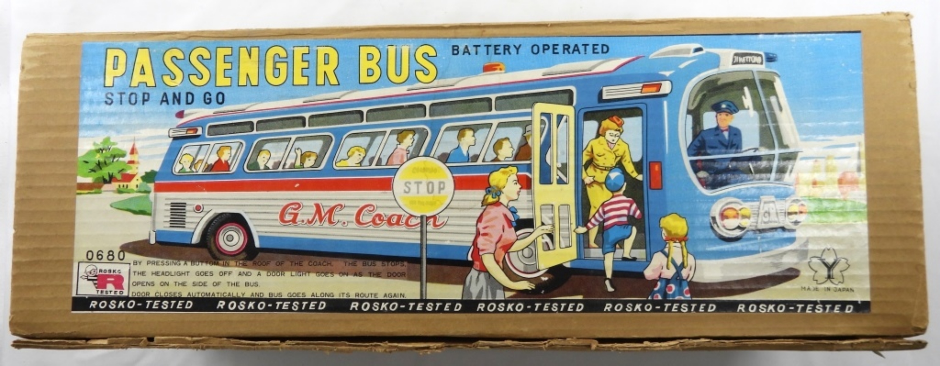 VINTAGE BATTERY “Y” TRADEMARK G.M.COACH GMC 3113 TIN TOY- IN GOOD CONDITION PREOWNED DOES SHOW SOME WEAR- UNSURE IF IT IS IN WORKING ORDER UNTESTED. COMES WITH ORIGINAL BOX. PREOWNED.