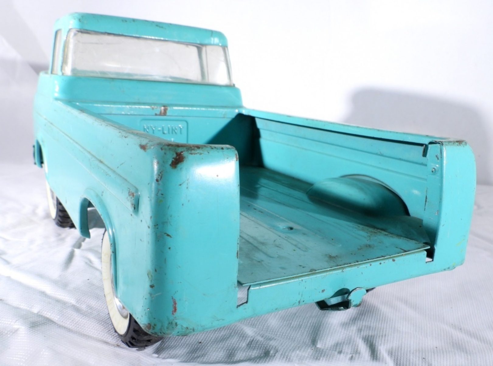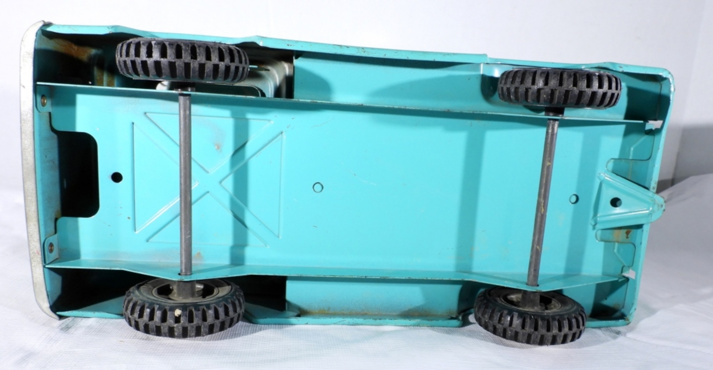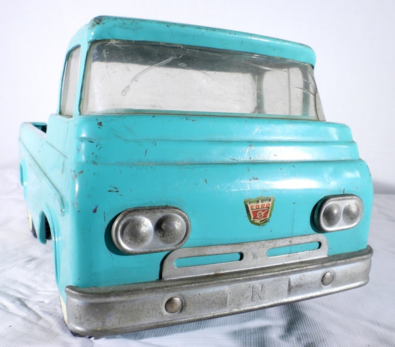 VINTAGE FORD TEAL IN GOOD CONDITION- DOES HAVE A CRACK IN THE FRONT WINDSHIELD, SHOWS WEAR ON THE BODY HAS SOME SCRATCHES, THE TRUCK DOES MOVE EASILY. PREOWNED.