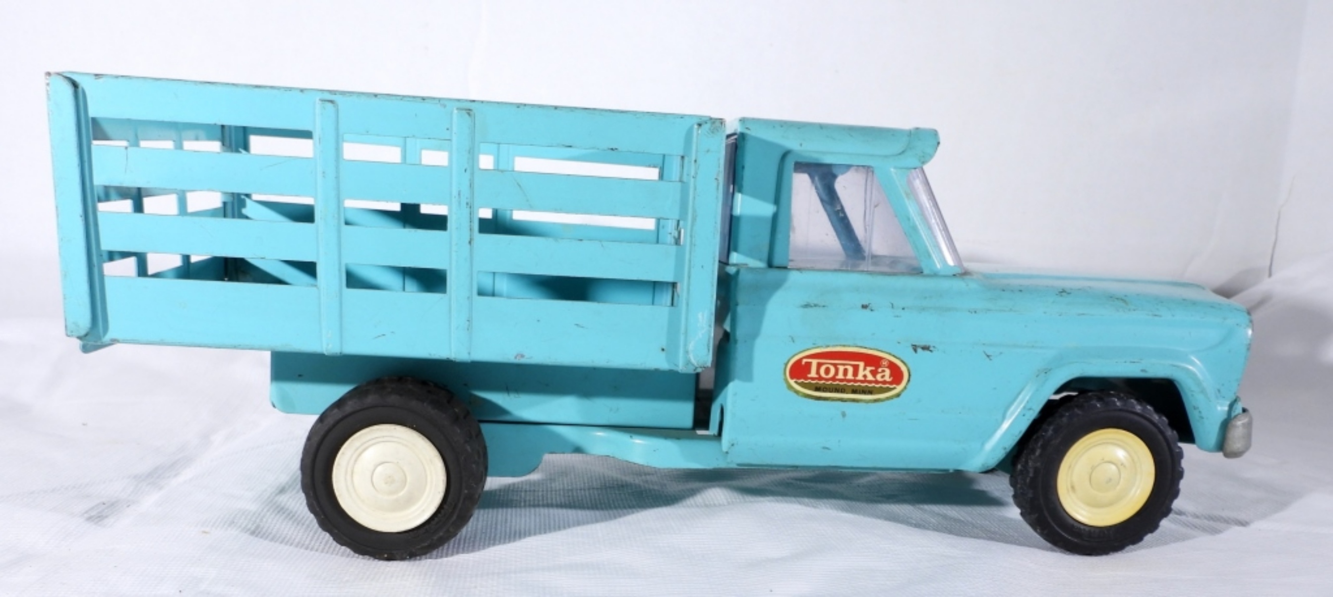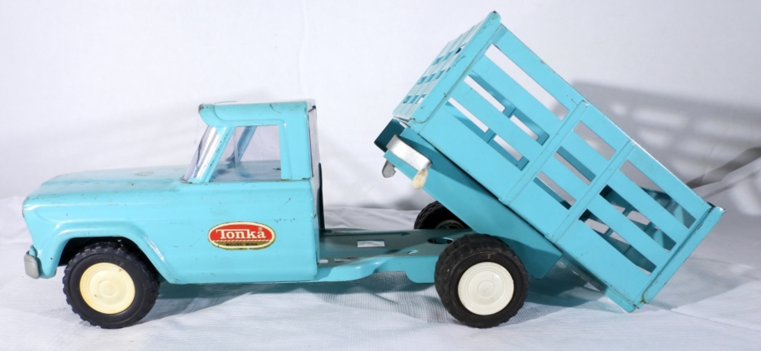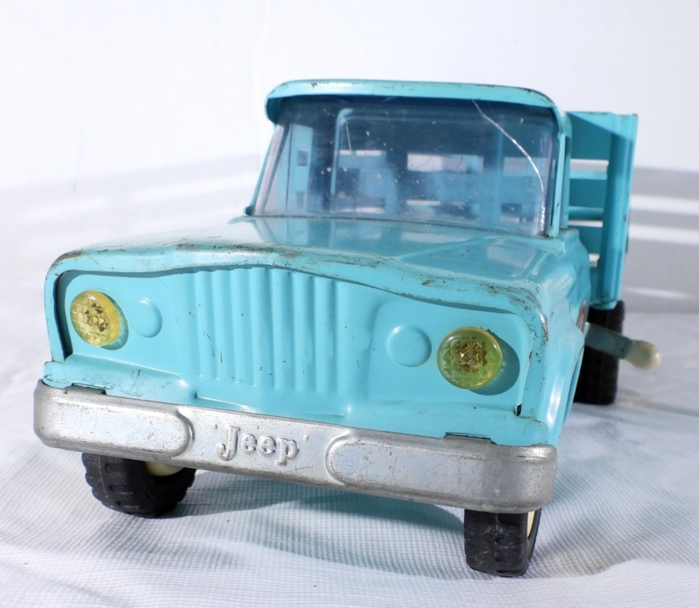 TEAL JEEP TONKA TRUCK WITH DUMP BED- IN GOOD CONDITION- DOES HAVE SOME SCRATCHES THE FRONT WINDSHIELD DOES HAVE A CRACK IN IT. THE DUMP BED DOES WORK AND LATCHES. PREOWNED.
