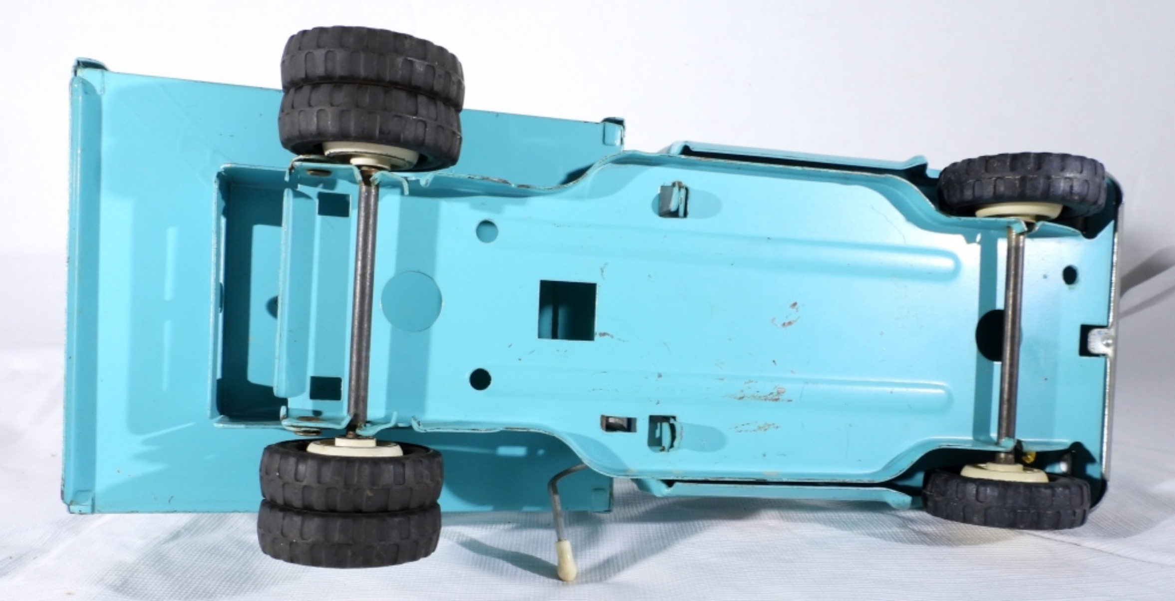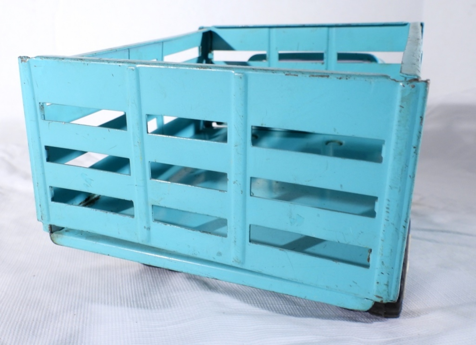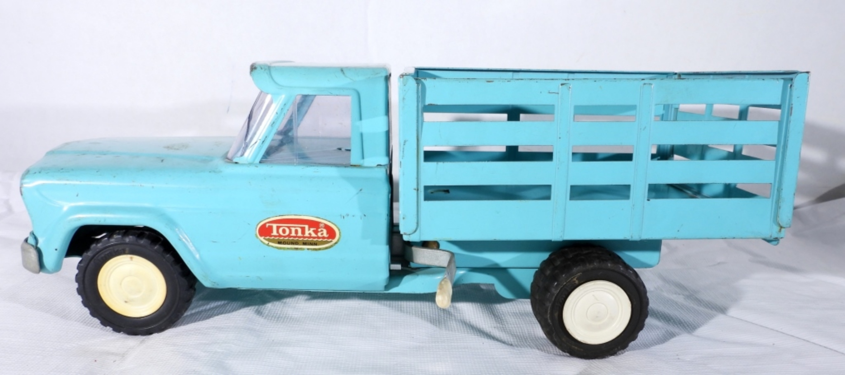 TEAL JEEP TONKA TRUCK WITH DUMP BED- IN GOOD CONDITION- DOES HAVE SOME SCRATCHES THE FRONT WINDSHIELD DOES HAVE A CRACK IN IT. THE DUMP BED DOES WORK AND LATCHES. PREOWNED.
