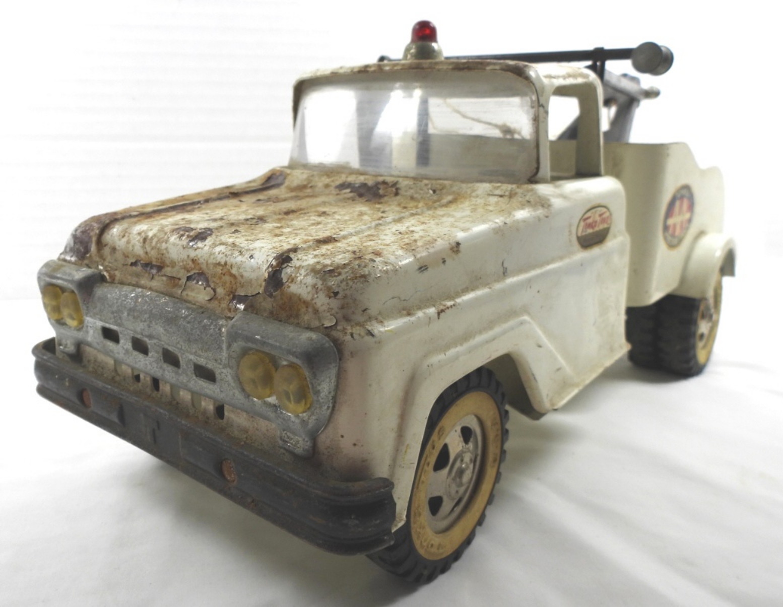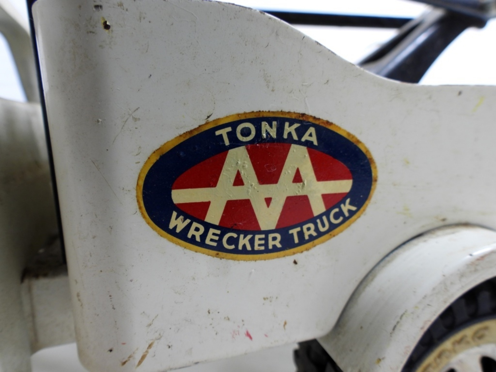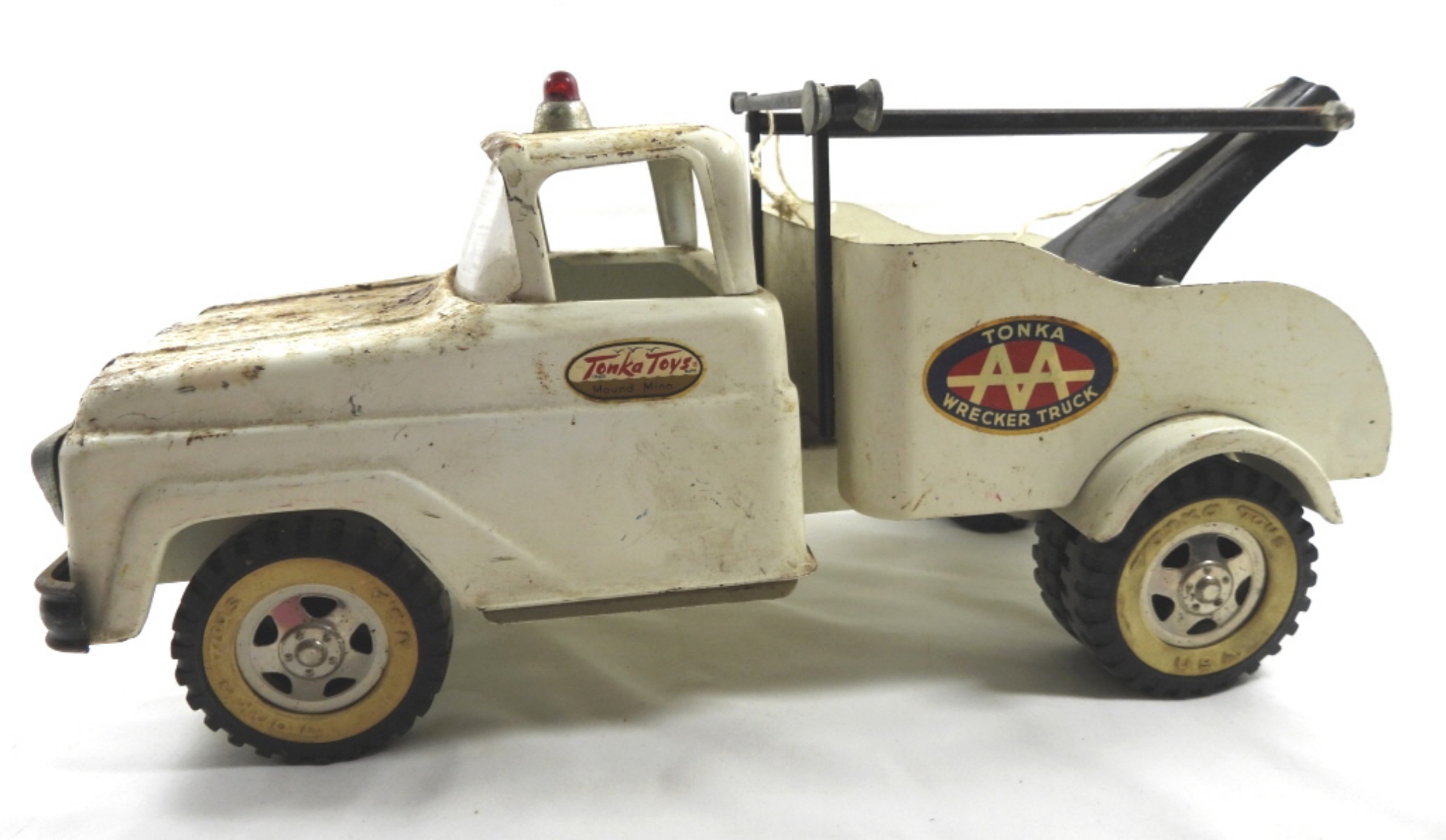1960’S TONKA TOYS MOUND, MINN. TONKA AA WRECKER TRUCK- TRUCK IN IN FAIR TO GOOD CONDITION DOES HAVE THE PAINT CHIPPING OFF OF THE HOOD AS WELL AS OTHER PLACES, WHEELS STILL MOVE VERY GOOD, THE HOOK IS MISSING TO