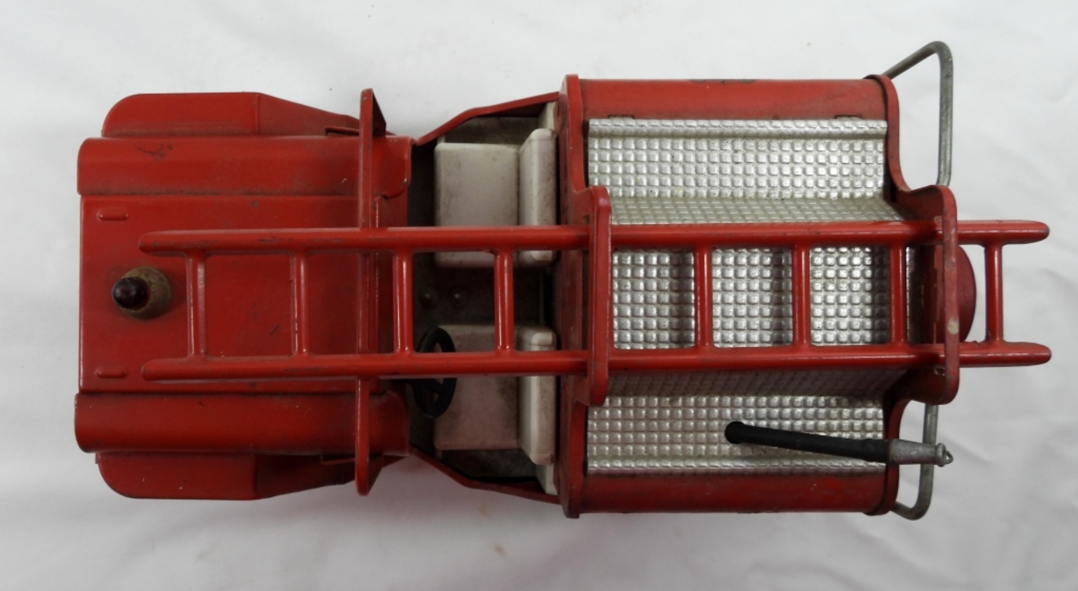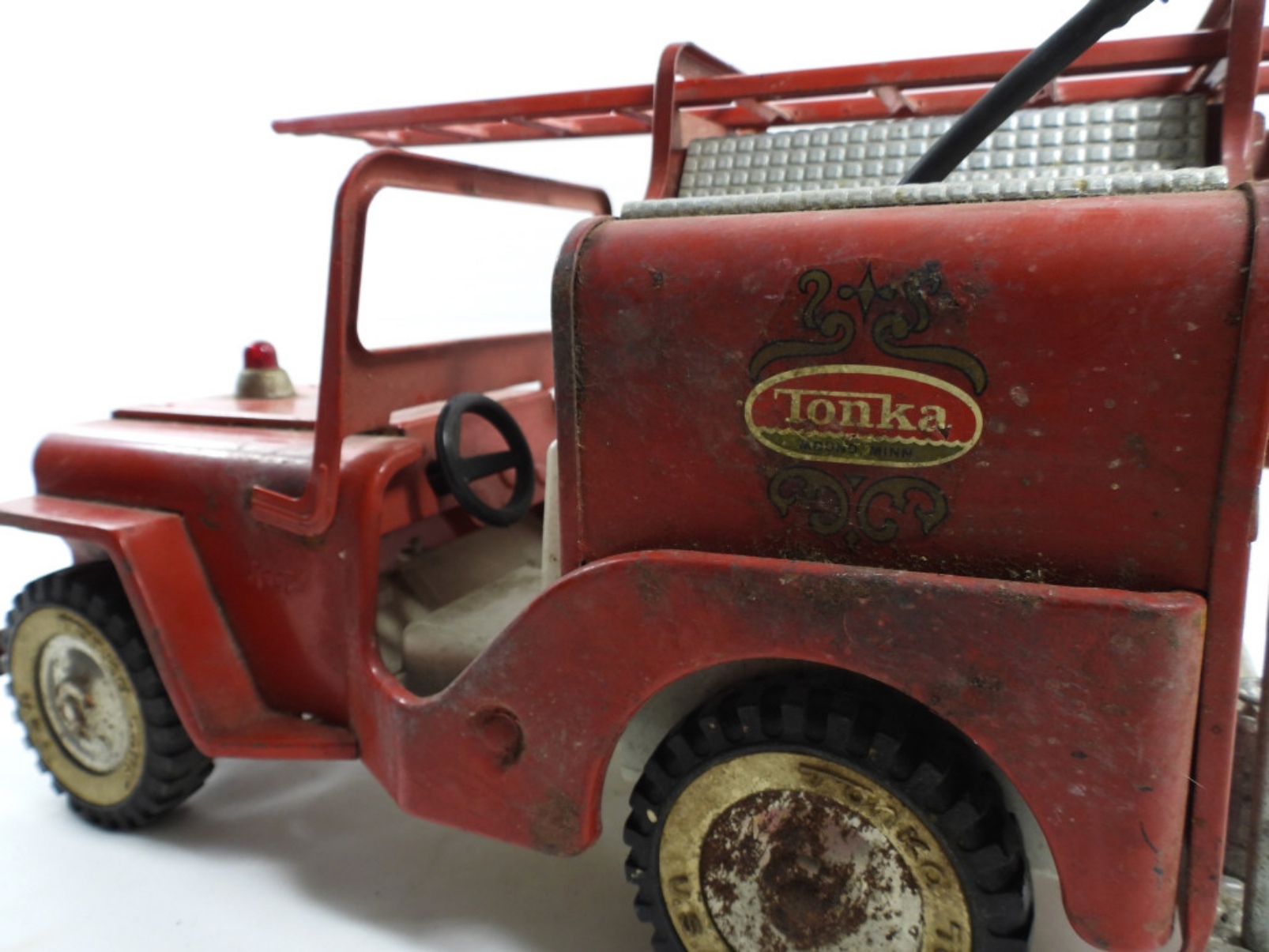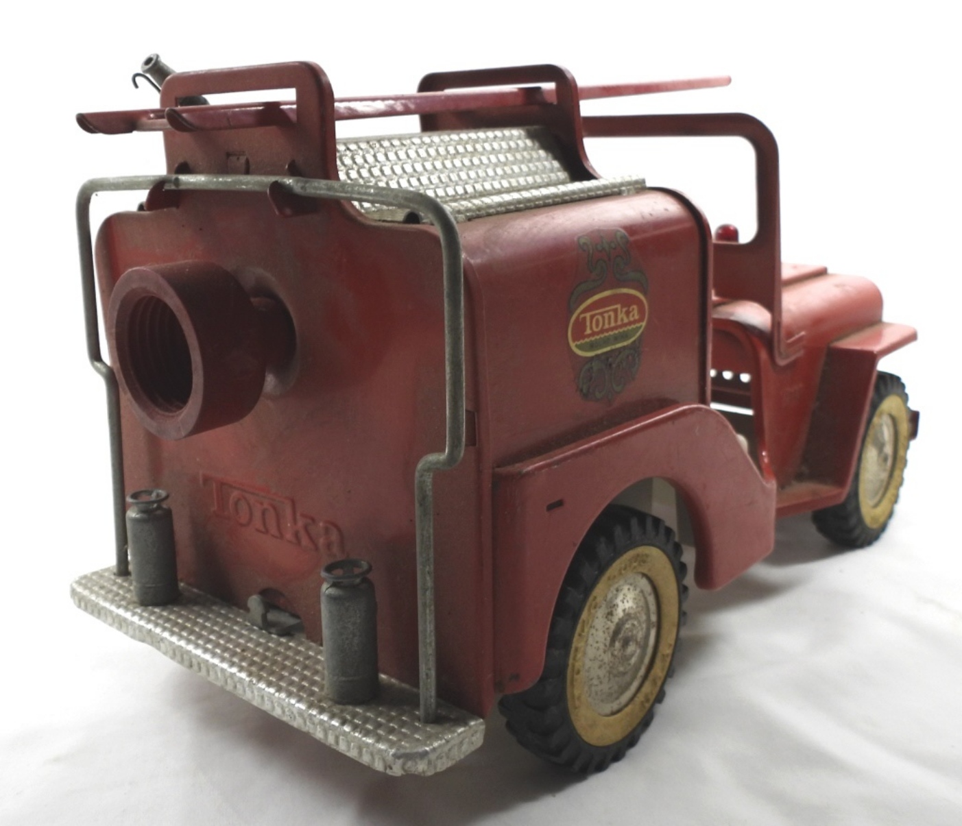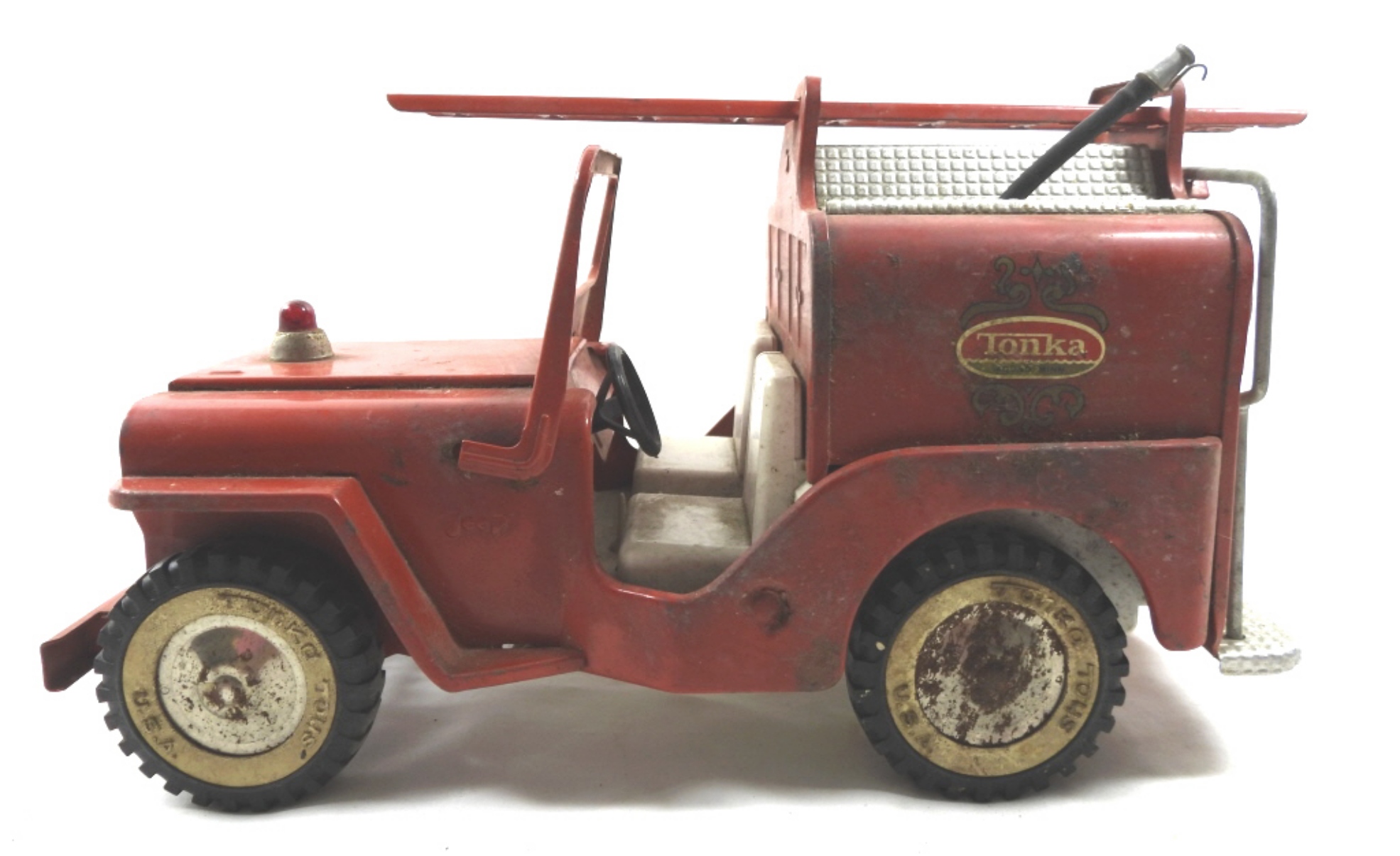 VINTAGE JEEP 1963-1965 FIRE PUMP TRUCK- IN GOOD CONDITION DOES SHOW SOME WEAR AND SCRATCHES TO THE BODY. STILL HAS THE HOSE TO THE PUMP TANK. MOVES VERY GOOD. PREOWNED.
