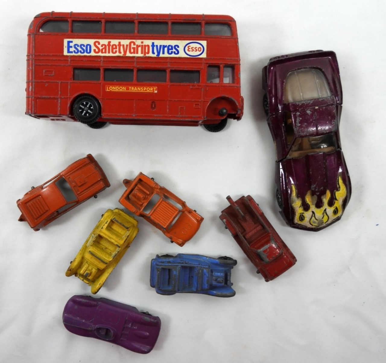 8 VINTAGE METAL TOY LOT- 6 MINI METAL TOYS- 2 TRUCKS & 4 HOTRODS. ESSO SAFETY GRIP TYRES (ESSO)- THE BUS IS MISSING ONE WHEEL, A CORVETTE- FIREVETTE. ALL HAVE BEEN PREOWNED AND DO SHOW SWEAR TO THE PAINT, AND TO THE