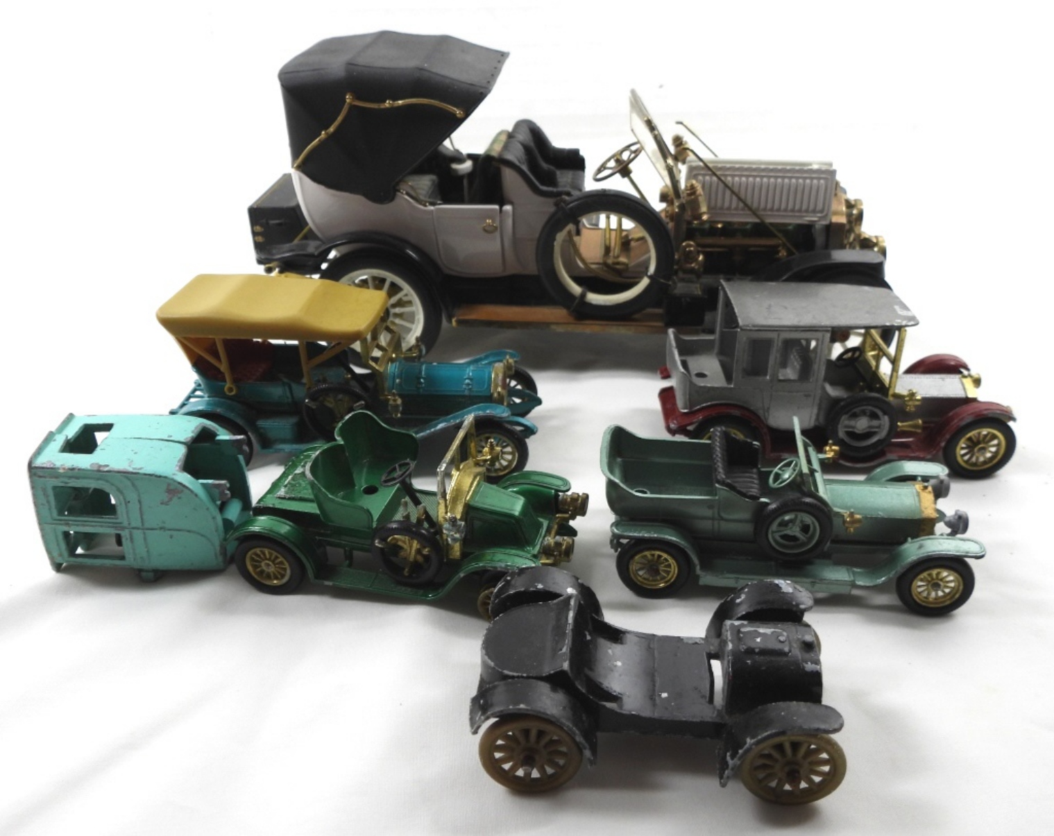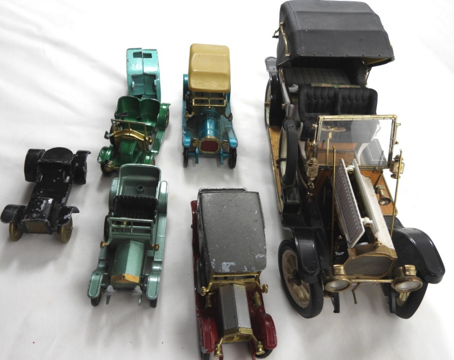 7 VINTAGE ANTIQUE METAL CARS. 1- VINTAGE MODEL STYLE CAR- ALL OF THE CARS ARE IN FAIR TO GOOD CONDITION-SOME OF THEM DO HAVE PAINT CHIPPING, AND SHOW WEAR ON THE BODY OF THE CARS. ALL OF THESE CARS HAVE BEEN PREOWNED.